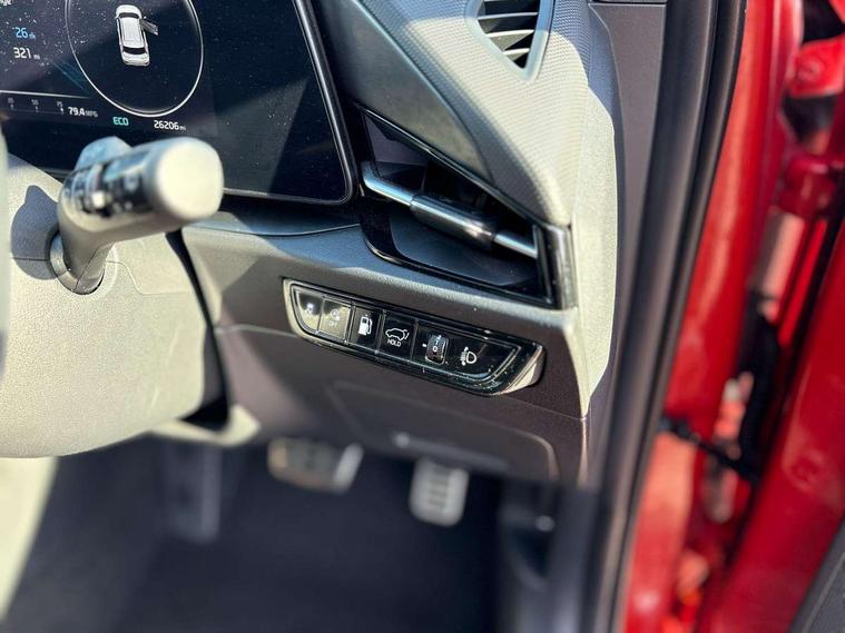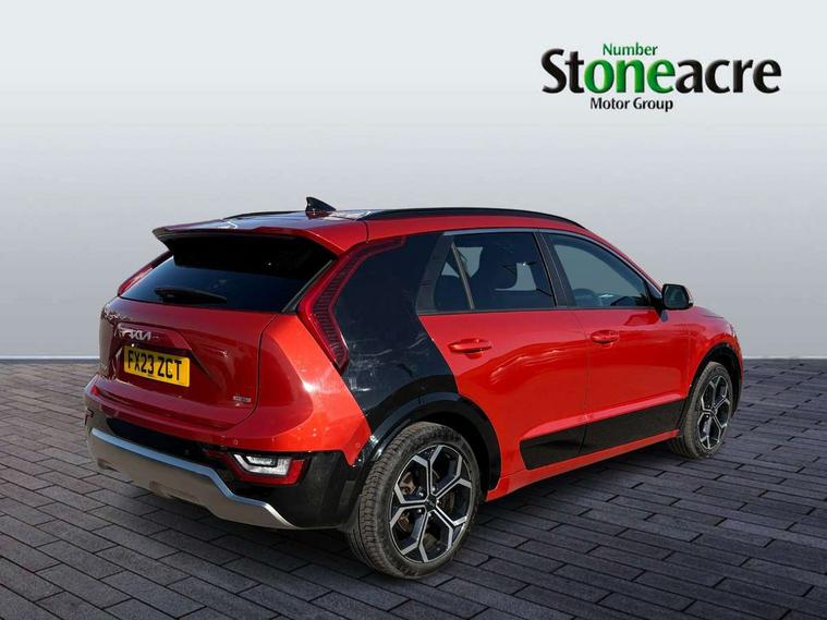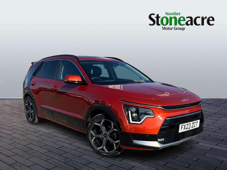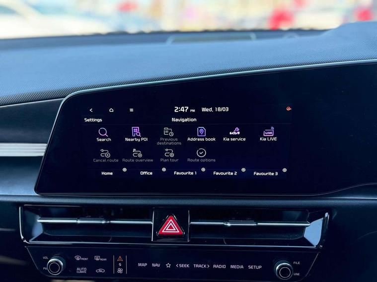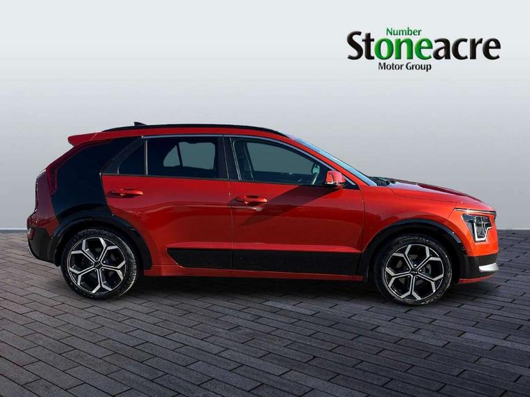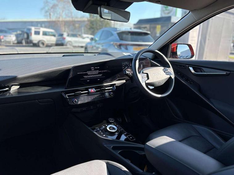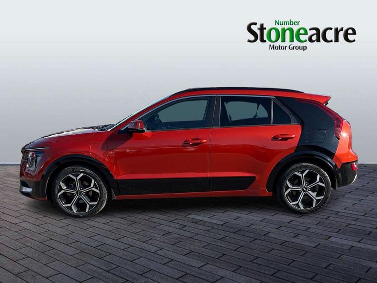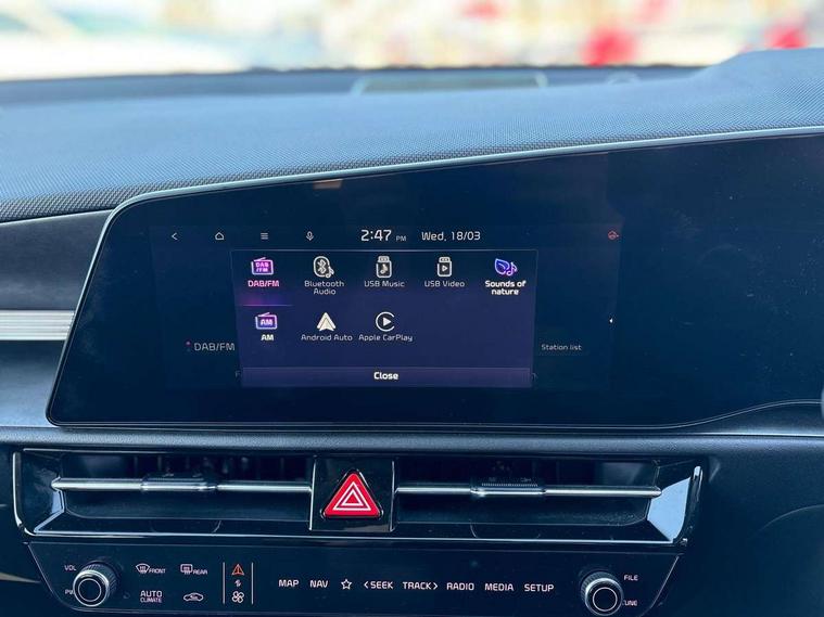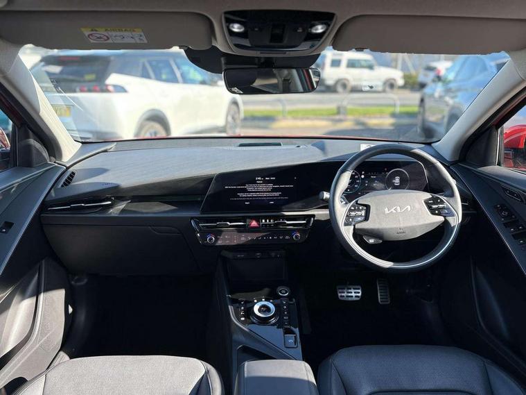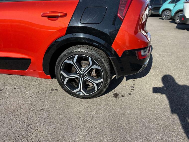 10.25" Supervision colour cluster display, 10.25" touchscreen satellite navigation, Adaptive smart cruise control function (SCC) with stop and go, Apple car play/Android Auto with voice control, Blind spot collision avoidance assist, Drive mode select (Eco, sport), E-call, Emergency stop signalling system, Forward Collision-Avoidance Assist (FCA) 1.5 - City/Pedestrian/Cyclist/Junction turning, Front parking sensors, Head up Display, Highway Driving Assist (HDA), Kia Connect (UVO), Lane Following Assist (LFA), Lane keep assist, Motor driven power steering, Parking collision avoidance assist (PCA), Power opening/closing tailgate, Rear cross traffic alert, Rear parking sensors, Remote smart parking assist, Reversing camera with dynamic guide lines, Safe exit warning (SEW), Speed limit assist, Trip computer with distance/fuel consumption/average speed, Wireless Smartphone charger, 220v AC Inverter, 'Shark fin' mobile antenna, 2 type C USB ports on front seats, 2 USB ports in centre console including 1 type C, 6 speakers, Bluetooth with music streaming, DAB Digital radio, Steering wheel mounted controls, Acoustic windshield, All round electric windows with drivers and front passenger auto up/down and safety function, Auto dimming rear view mirror, Automatic defog system, Automatic headlight control system, Black grille with chrome surround, Body colour bumpers, Body colour exterior door handles, Deluxe door scuff plates, Dual LED headlights (low and high projection), Electric heated door mirrors, Electrically folding door mirrors, Front and rear chrome skid plates, Front fog lights, Heated rear window with timer, High gloss black cladding, High gloss black door mirrors, LED daytime running lights, LED rear combination lights, LED third brake light, One touch single tilting/sliding power sunroof, Privacy glass - Rear windows and tailgate, Rain sensing front wipers, Rear fog lights, Rear side wing doors, Rear spoiler, Rear wiper, Roof rails, Solar glass windscreen, Welcome and follow-me home light functionality, Windscreen Washer Level Warning, 12V socket in front, 12V socket in luggage compartment, 3 seat bench in 2nd row, 60:40 split remote folding rear seats, All-round height adjustable headrests, Aluminium pedals, Artificial leather centre console storage box, Artificial leather steering wheel, Centre console cupholder, Chrome coating interior door handles, Driver and front passenger power adjusted seat, Driver power adjusted memory seat, Driver/passenger sunvisors with illuminated vanity mirrors, Drivers seat power lumbar support, Dual zone automatic air conditioning, Front and rear door storage, Heated front seats, Heated outer rear seats, Heated steering wheel, Illuminated glovebox, Interior door lock/unlock function, ISOFIX Child seat top tethers and anchor fixings, LED overhead console, 2nd row and luggage lamp, Luggage area load cover, Luggage board, Paddle shifts, Passenger premium relaxation seat, Power adjustable lumbar support on front passenger seat, Rear armrest, Seatback pocket - driver, Seatback pocket - front passenger, Shift by wire SBW, Single front passenger seat, Tilt/telescopic adjustable steering wheel, Vegan leather upholstery, Ventilated front seats, Ventiliation ducts to rear compartment, Towing pack - Niro, 3 point seatbelts on all seats, ABS, Automatic unlocking of doors in case of impact, Centre side front airbags, Curtain and side airbags, Drivers knee airbag, Dual shell horn, Electric parking brake with auto hold function, Electronic stability control, Front passenger airbag deactivation, Height adjustable front seatbelts, Hill start assist control (HAC), Manual rear child locks, Rear seat alert system, Traction control, Tyre pressure monitoring system, Alarm system and engine immobiliser, Deadlocks, Engine Start/Stop Button with Smart Entry System, Locking wheel nuts, Visible vehicle identification number, Warranty - 7 Years/ 100, 000 miles, Centre fascia chopped carbon, 18" Alloy wheels, Tyre mobility kit,