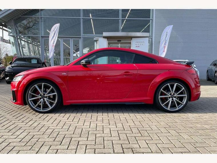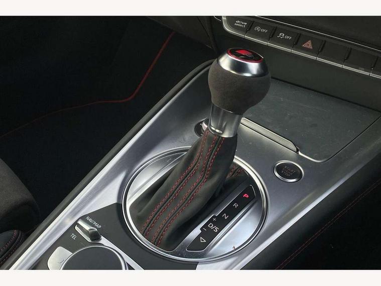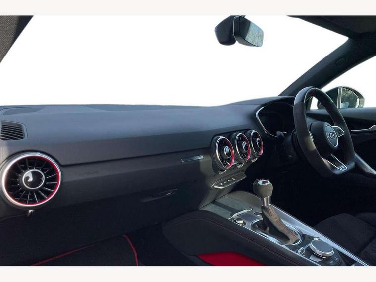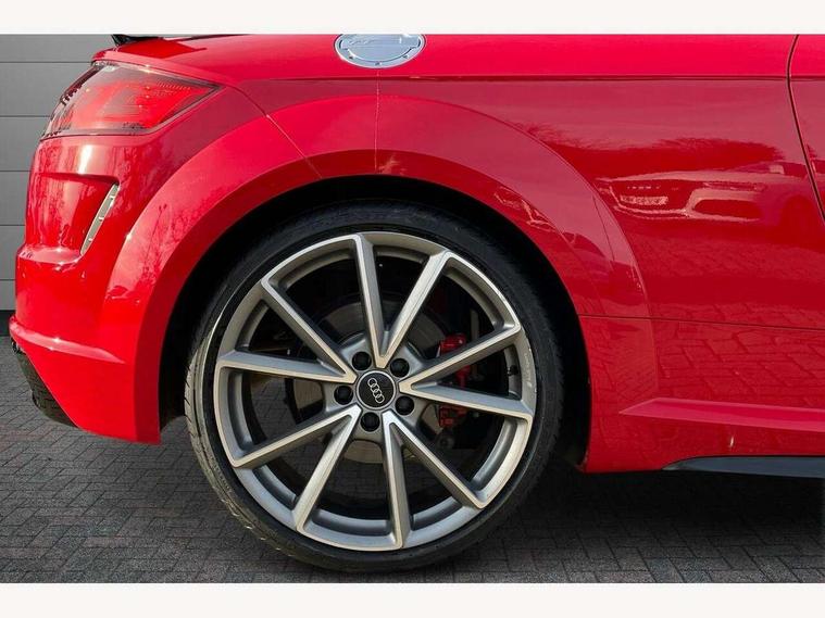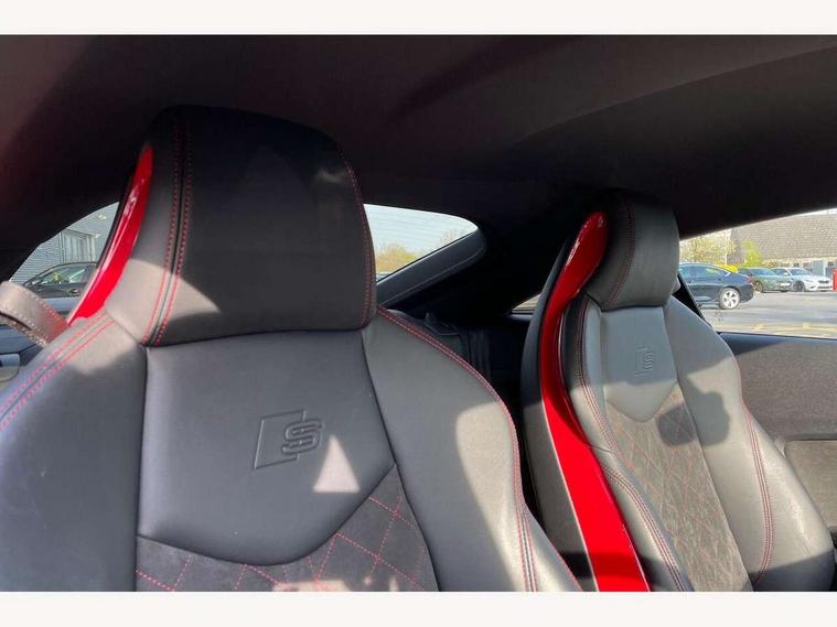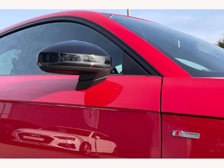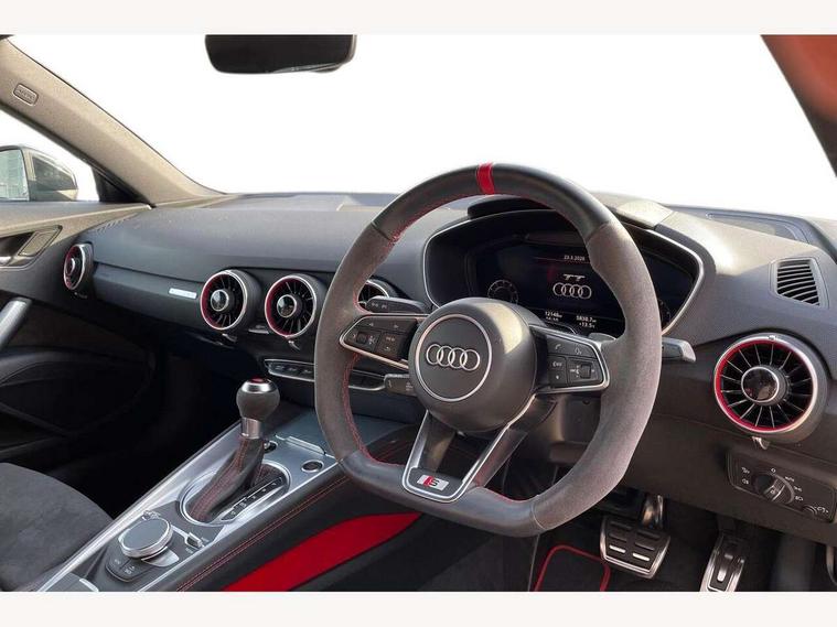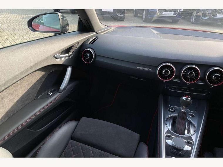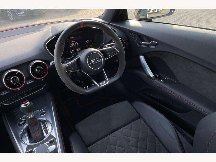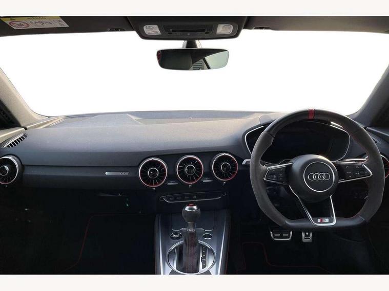 Audi drive select with 4 Pre configured modes, Audi smartphone interface, Audi virtual cockpit - 12.3" high-resolution LCD display with fully customisable instrument cluster, Cruise control + speed limiter, Emergency call service, Mobile phone preparation with bluetooth interface, Progressive power assisted steering, Rear parking sensors, Service interval indicator, Start/Stop system with energy recuperation, TP memo, Sports suspension, 8 Speakers, AM/FM radio, Bluetooth audio streaming, DAB Digital radio, Audi Beam uses LEDs to project the Audi Sport logo, Audi rings decals, Auto dimming rear view mirror, Auto headlight range control, Black chrome tailpipe, Black door mirrors, Dark privacy glass from B-pillar backwards, Electric folding door mirrors, Electric front windows, Electrically adjustable and heated door mirrors with integrated LED side indicators, Heat insulating glass in windshield, Heat reflecting windows, LED 3rd brake light, LED daytime running lights, LED headlights with LED rear lights + dynamic rear indicators, Light and rain sensors, Rear boot, 12V socket, 2 rear seats, 3 spoke flat bottomed high multi-function leather sport steering wheel with gearshift paddles, 4 way electric lumbar support for driver and front passenger, Alcantara leather with 12o'clock marker and express red contrast stitching in steering wheel, Alcantara/leather upholstery with S embossing + contrasting express red stitching on upholstery, Steering wheel and gear knob gaiter, Black headlining, Door sill trims, Extended aluminium look with stainless steel pedals, Front centre armrest, Front passenger seat, Front super sports seats, Heated front seats, Integrated head restraints, ISOFIX child seat mounting for front passenger seat with airbag deactivation, Manual adjustment of seat height, fore/aft position, seat angle, seat depth and backrest angle, Rear head restraints, Rear top tether child seat ISOFIX attachment, Red piped floor mats, Split folding rear seat, Black styling package - TT, Leather pack - TT, LED interior light pack - TT/TTS, Non smoking pack - TT/TT RS, Technology pack without Audi phone box - TT, 3 point front seat belts, ABS, ASR traction control, Curtain airbags, Driver and front passenger airbag with front passenger airbag deactivation, EDL traction control, Electromechanical parking brake, ESP, First aid kit, Front side airbags, Head airbags, Hill hold assist, Red brake callipers, Seatbelt warning, Tyre pressure loss indicator, Warning triangle, Anti theft alarm, Anti theft wheel bolts, Immobiliser, Keyless Go, Remote central locking, Matt brushed aluminium inlays, Tool kit, Tyre repair kit,