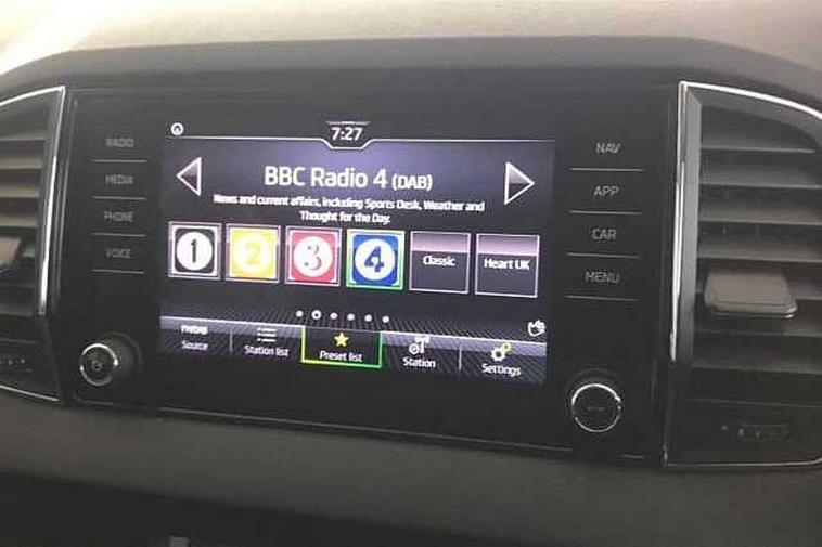 Amundsen satellite navigation with 8" touchscreen display with maps Europe, WLAN and web radio, Care connect, Driver alert system, Driver fatigue sensor, Driver profile selection, Electro-mechanical PAS, Outside temperature gauge, Service interval indicator, SmartLink + wireless for Apple and wired for Android, Start/stop system with regenerative braking, USB C Port x 2 in front centre console, DAB radio with Bluetooth, SD card slot, USB connection, Acoustic glass, Aero front windscreen wipers with intermittent function, Automatic headlight control system, Black electric window control buttons, Body colour door mirrors and handles, Body coloured bumpers, Electric front and rear windows with child proof lock, Electrically adjustable heated folding and auto dimming door mirrors, Heated rear windscreen, LED rear lights with high functionality, Light assistant (coming/leaving home/tunnel light), Privacy glass, Safety reflectors on front doors, Third brake light, 1.5 litre bottle holders in driver and front passenger door panels, 12V socket in boot, 12v socket in front centre armrest with storage compartment and rear air vents, 2 Folding hooks and nets in boot, 2 Front readings lights for driver and passenger, 3 rear height adjustable headrests, 4 foldable roof handles with rear coat hooks, 4 lashing points on luggage floor, Backrest release, Cargo elements in boot, Chrome inner door handles, Driver and passenger seats height adjust, Folding tables on the front seat backrests, Front head restraints, Front seat and rear pockets, Height adjustable front three point seats belts with tensioners, Height/reach adjust steering wheel, Ice scraper, Illuminated and cooled glovebox, Illuminated luggage compartment, Isofix child seat preparation outer rear, Manual lumbar support for front seats, Net programme in boot, Pen holder, Pollen filter, Rear boot cover, Rear reading lights, Rear seats fixed folding and divided 60:40, Safety vest holder, Storage box in upper central dashboard closed, Sunvisors with illuminated vanity mirrors, Umbrella under passenger seat, Airbags - Front side, head, knee and curtain, Automatic door unlocking in case of crash, Automatic fuel cut off in case of crash, Driver airbag, Electronic parking brake with auto hold function, Emergency rear braking signal, ESC including ABS, MSR, ASR, EDS, HBA, DSR, RBS, MKB and traction control, Front assist radar scanning of the space in front of the car with automatic braking, Hill hold control, Passenger airbag with switch-off function, Pedestrian monitor, Seatbelt reminder signalisation and pretensioner for all seats, Three point seatbelts rear, Two tone horn, Tyre pressure display, Tyre pressure monitor, Alarm with interior monitoring, back up horn and tilt sensor with safe function, Electronic engine immobiliser, Remote central locking with 2 remote folding keys, Chrome framed air vents, 17" Triton alloy wheels with anti theft wheel bolts, Storage on wheel cover,