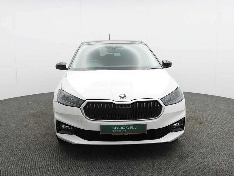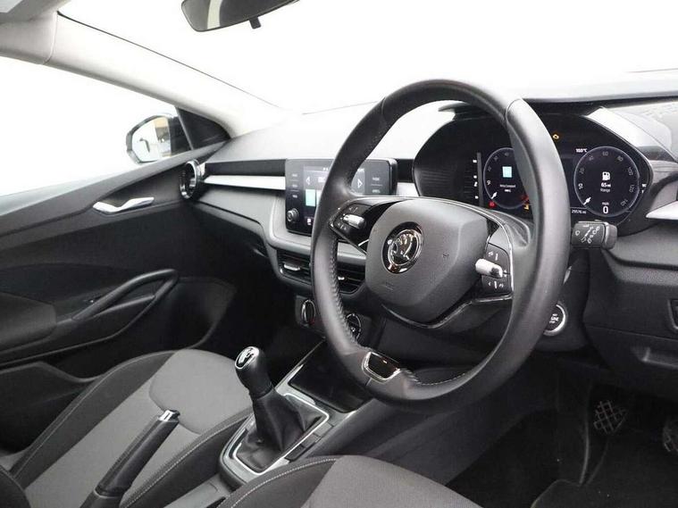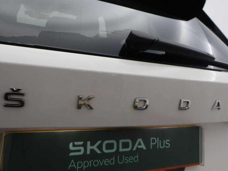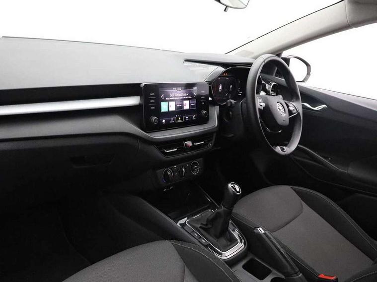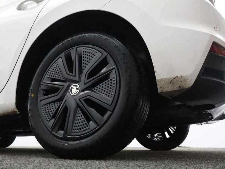 Bluetooth connection, Driver alert system - DAS, Electromechanical power steering, Exterior temperature gauge, Lane assist including road edge detection, Service interval indicator, Virtual cockpit with 10.25" colour display, 2x USB-C in the front (for data transmission and charging), 6 Speakers (4 in front and 2 in rear), Auxiliary socket for external MP3 player, Bolero radio with 8" colour display, DAB digital radio reception, Basic rear lights, Body coloured bumpers, Dimming rear view mirror with black frame, Door mirror integrated indicators, Electrically adjustable and heated door mirrors, Electrically adjustable front windows with function auto up/down, Front window wiper intermittent control, Headlight range control - Automatic, Ice scraper in fuel cap, LED daytime running lights with coming and leaving home feature, Mechanical adjustable rear windows, Privacy glass, Rear LED fog light, Rear side wing doors, Rear window wiper with washing nozzles, Roof colour door mirrors, Roof mounted spoiler, SKODA tailgate lettering in chrome, Third brake light, 3 rear headrests, Backrest split and folding, Central console with fixed cup holder and storage box, Chrome handbrake release button, Fabric upholstery, Gearshift knob/handle in leather, Grain satin black interior door handles, Hand brake lever handle in leather, Height adjustable front headrests, Height adjustable steering wheel, ISOFIX and TopTether anchorage points to the outer rear seats, ISOFIX and TopTether on the front passenger seat, Luggage compartment lighting, Pollen filter, Rear seat bench unsplit, Single front passenger seat, Storm grey headlining, Sun visors with mirror and airbag label on passenger side, Ticket holder, Umbrella in drivers door, 3-point height adjustable front seats belts with pretensioner and force limiter, Automatic warning lights in case of crash, Driver and passengers airbag with switch off function, e-Call+, ESC including ABS, MSR, ASR, EDS, HBA and XDS, Front and rear seat belt warning, FRONT ASSIST (AEB City and AEB Inter Urban), Front side airbags, Head airbags, One tone horn, Pedestrian protection, Three rear 3-points safety seat belts with pretensioner and force limiter including stop function for outer rear seat belts, Tyre pressure monitoring system, Anti-theft alarm system including immobiliser, interior monitoring, backup horn, and towing protection, Anodized cross line upper decorative trim, Colour Edition air vents, Grain satin black central console cover, Grain satin black lower decorative trim, Satin black door and side trim panel in front, Anti-theft wheel bolts protection, Super-low rolling resistance tyres,