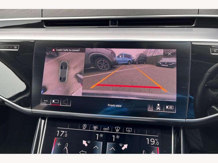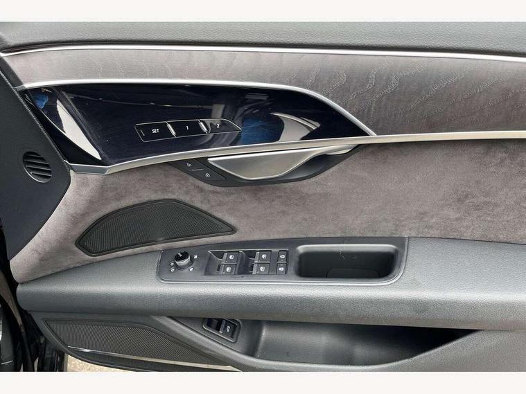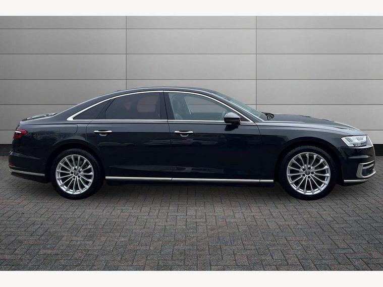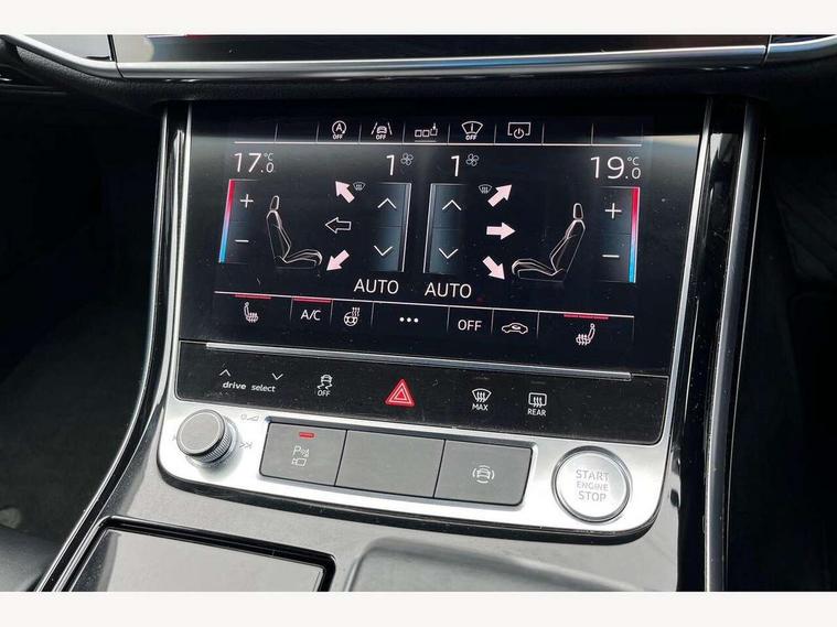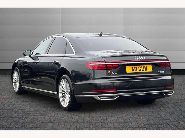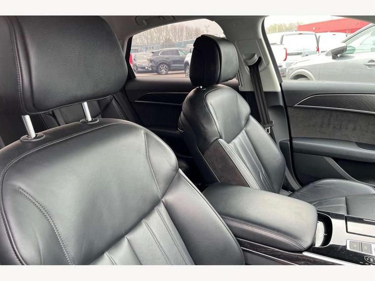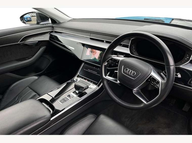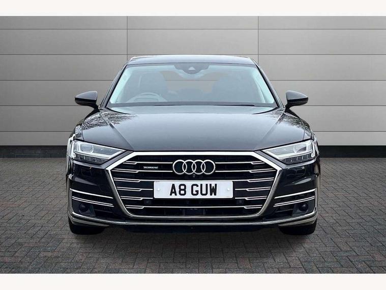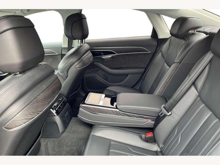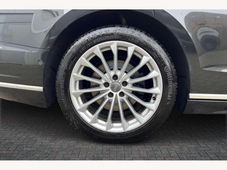 'Lights On' Reminder warning buzzer, Adaptive cruise control with Stop and Go + pre sense front, Advanced key with Audi hands free boot opening system, Audi drive select, Audi phone box with wireless charging, Audi smartphone interface, Camera based traffic sign recognition, Colour driver's information system display, Head up Display, Lane departure warning system, MMI navigation plus with MMI touch, Power tailgate, Rear view camera, Remote fuel filler release, Service interval indicator, Virtual cockpit, Adaptive air suspension, Diesel particulate filter, DAB digital radio module, USB connection, Acoustic windscreen, Auto dimming rear view mirror, Automatic headlight control system, Body colour bumpers, Body colour door handles, Body colour door mirrors, Body colour side protection with aluminium trim strips, Electric front windows, Electric heated, adjustable, folding and dimming door mirrors with memory, Electric rear windows with isolation switch, Heat insulating glass, Heated rear window, Heated windscreen washer jets, LED brake lights, LED daytime running lights, Reverse activated kerb-view adjustment on passenger's door mirror, 2 spoke leather steering wheel with gearshift paddles, 3 rear seats, Auxiliary heater, Centre console with cupholders, Climate controlled seats, Door armrest with storage, Door pockets with bottle holder, Dust/pollen filters, Electric 4-way lumbar support for front seats, Electric adj front seatbelt height + memory, Electric front seats with memory function, Front/rear floor mats, Heated front seats, Height/reach electric steering column with easy exit function, Leather gear lever, Multifunction steering wheel, Passenger footwell storage net, Rear centre armrest, Roof mounted sunglasses holder, Sunvisors with illuminated vanity mirrors, LED ambient interior lighting pack - A8, Light and rain sensor pack - A8, Luggage compartment pack - A8, 3 point seatbelts on all rear seats, ABS/EBD, Active front headrest system, ASR traction control, EDL traction control, Electromechanical parking brake, Emergency brake assist, ESP, Front passenger airbag deactivation, Head airbags, Hill start assist, Pre sense basic, Predictive pedestrian protection, Rear child proof door locks, Seatbelt warning, Locking wheel bolts, Remote central locking, Brushed aluminium lower inlay, Space saver spare wheel,