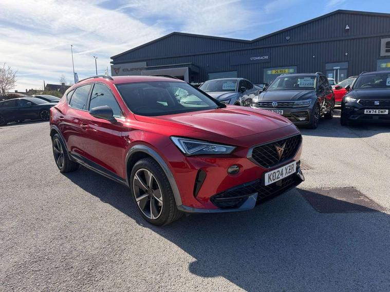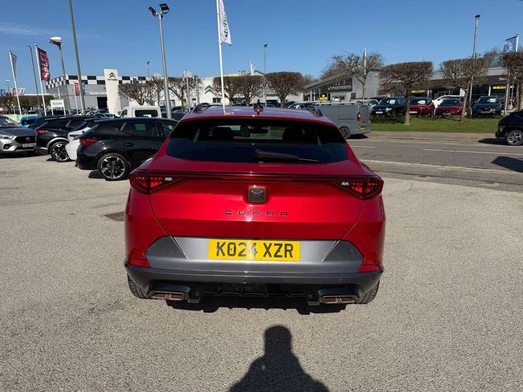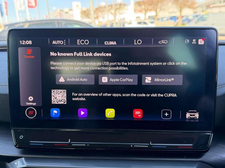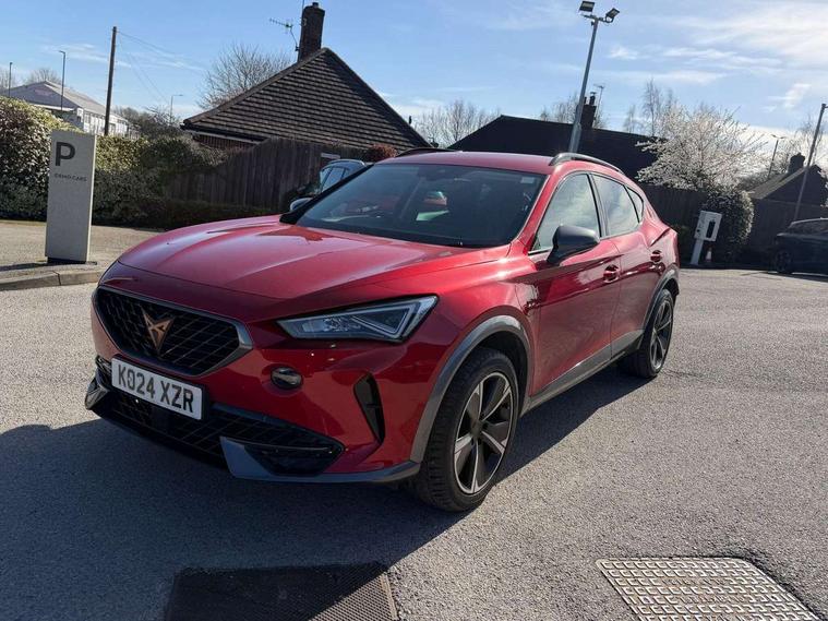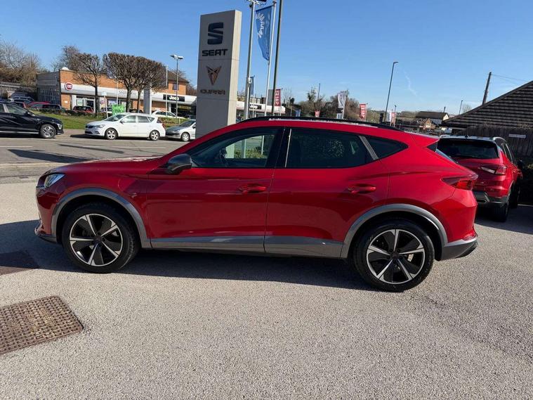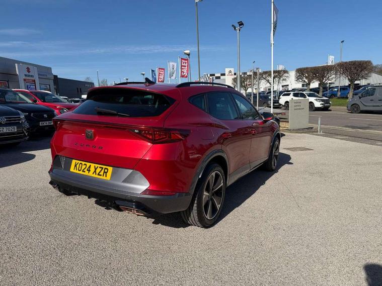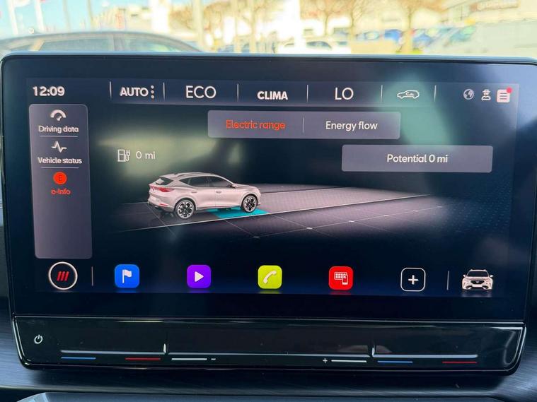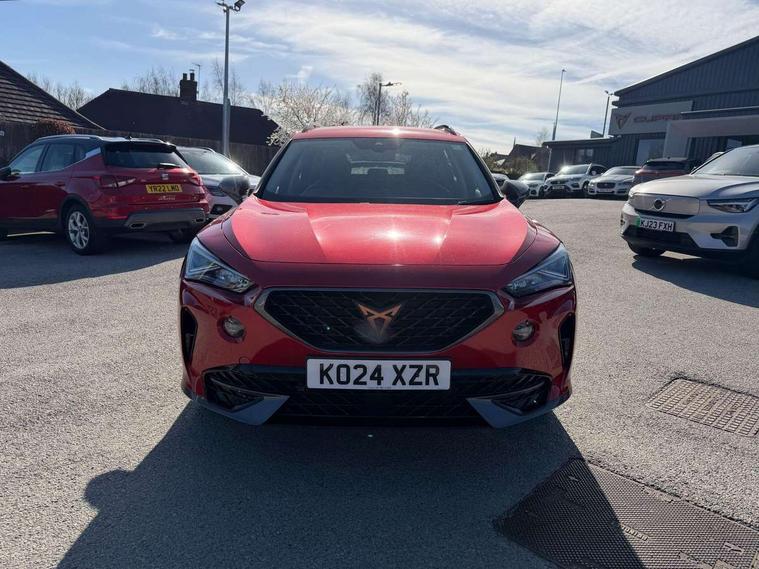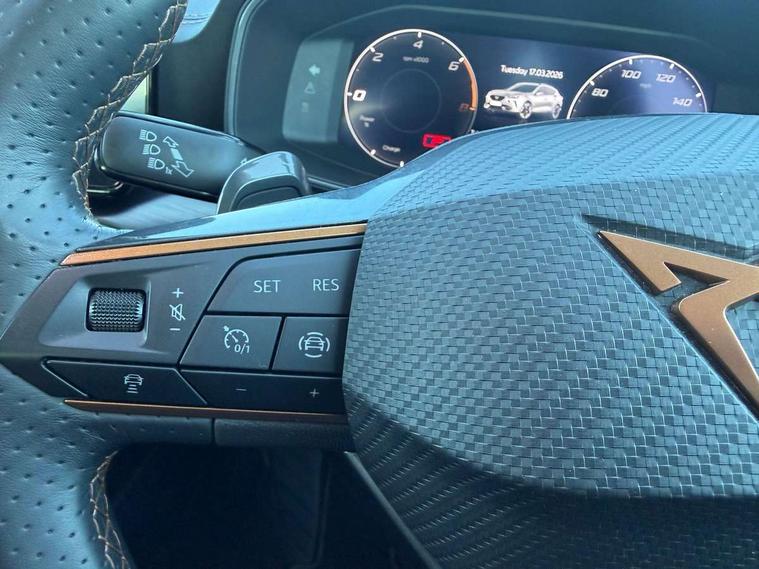 Digital cockpit and configurable dashboard, Driver alert system, Driving profile selection, Forward collision warning with automatic braking, Lane assist, Navigation system with 12'' Touchscreen Display, PAS, Predictive adaptive cruise control with speed limiter, Rear parking sensors, RPM, trip computer, outside temp gauge, instrument light brightness, low fuel warning light, lights on reminder, gearshift indicator, Service interval indicator, Start/stop system with regenerative braking, Voice control system, Wired Android Auto, Wireless apple carplay, Wireless phone charger, 10 amp mode 2 charging cable, 16 amp mode 3 charging cable, 3.6 kw On-board charger, Electronic locking differential and dynamic traction support, Standard suspension, 2 front and 2 rear USB type C sockets, DAB radio, Auto dimming rear view mirror, Body colour door handles, Body coloured bumpers, Dark grey wing mirror, Daytime running light with automatic headlight control and coming home feature, Dynamic headlight range control, Electric front/rear windows, Electrically adjustable, heated and folding door mirrors, Front fog lamps with cornering function, Gloss black roof rails and window surrounds, LED Headlights, LED Taillights with dynamic indicator, Rain sensing wipers, Rear diffuser with black simulated exhaust pipes, Rear side wing doors, Rear wash/wipe, Third brake light, Tinted rear windows, Welcome lights, 12V socket, 2 front and 2 rear reading lights, 3 seat bench in 2nd row, 60/40 split rear bench seat with armrest and mechanical seat release, Dust/pollen filter, Front and rear head restraints, Front centre armrest, Height/reach adjust steering wheel, Illuminated interior front door sills, Illuminated sunvisor with mirror, Interior ambient lighting, Isofix, Leather multi function heated steering wheel with gear shift paddles, Manually adjustable height and lumbar support for front seats, PVC/Cloth upholstery with copper stitching + Sport seats, Single front passenger seat, Three zone climate control with control panel in rear, Safety and driving pack (M) - Formentor, 3 point seatbelts on all rear seats, ABS, Brake control system - ESC and brake booster, Child proof door locks, Driver and front passenger airbags with front passenger airbag de-activation, Electronic parking brake, Front and rear disc brakes, Front side curtain airbags, Hill hold control, Public e-call, Seat belt reminder for front and rear seats, Tyre pressure monitoring system, Anti theft alarm system, Keyless entry and start system (KESSY), Locking wheel bolts, Copper and aluminium interior detailing, Tyre repair kit,