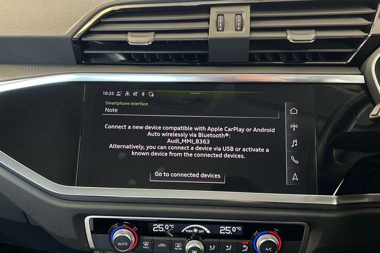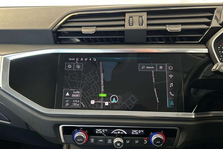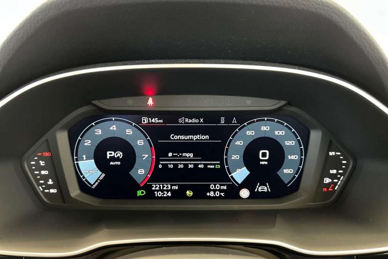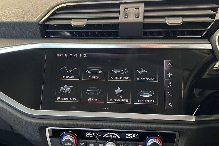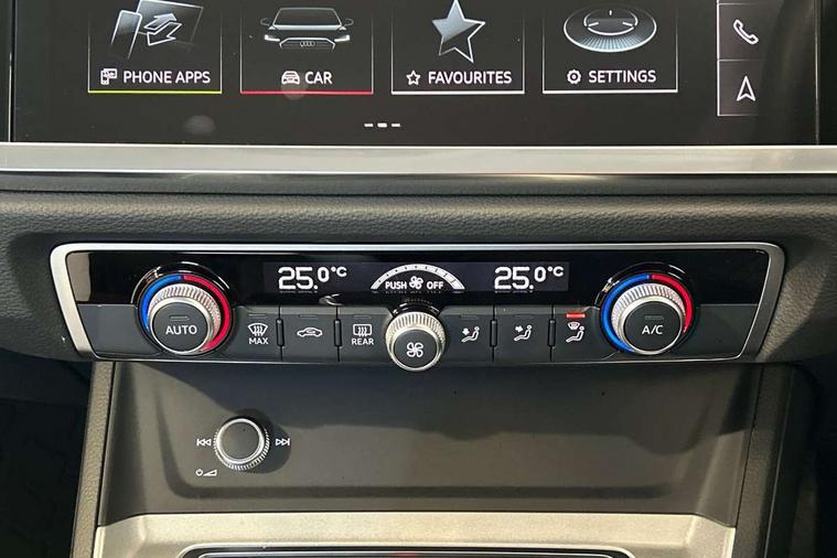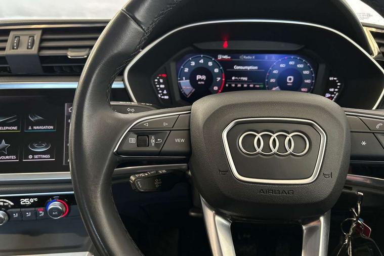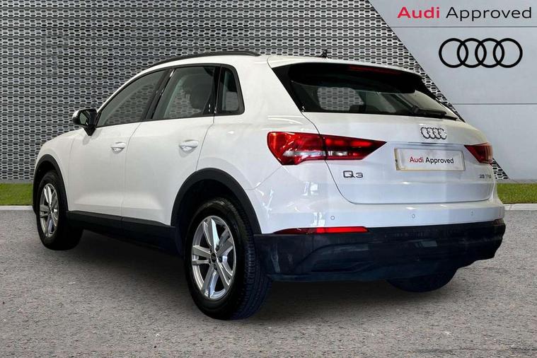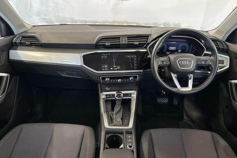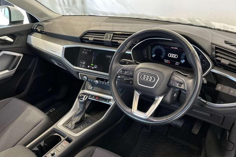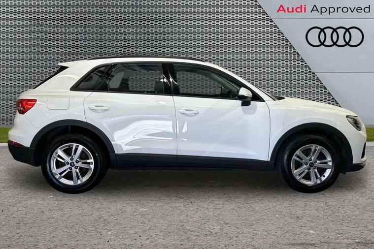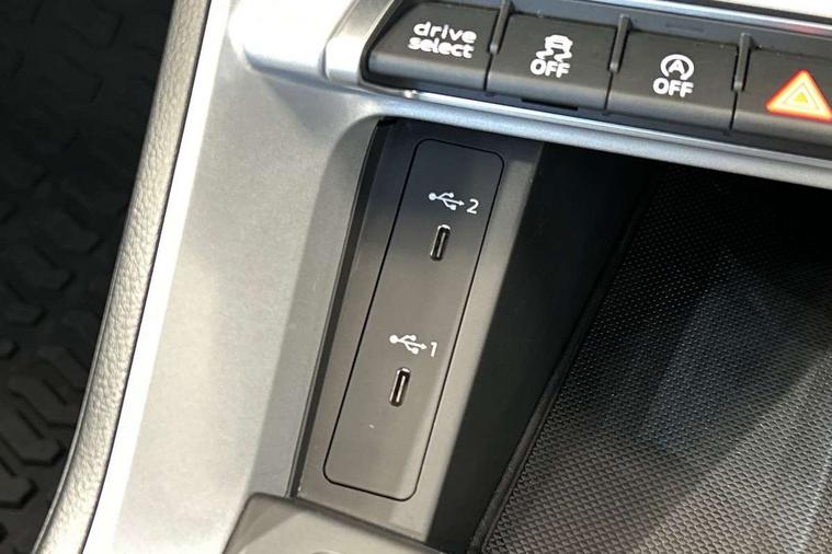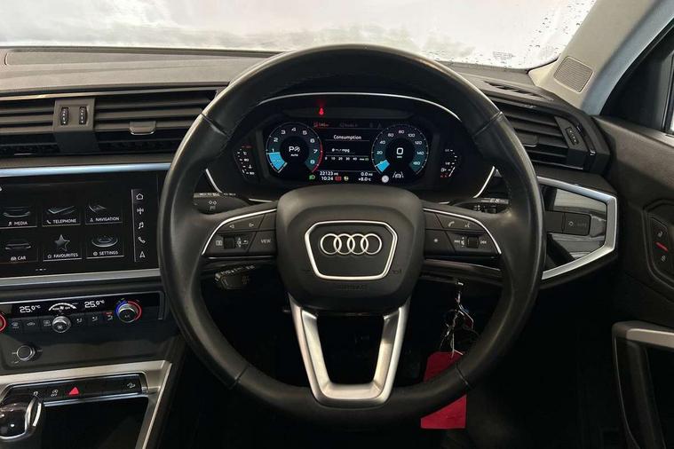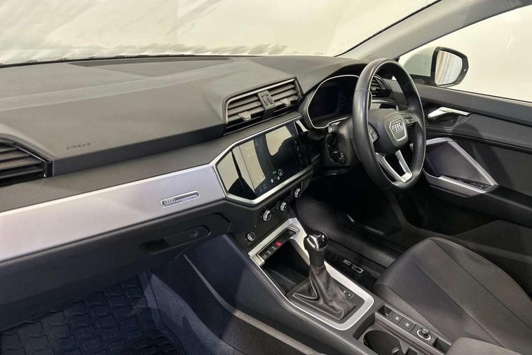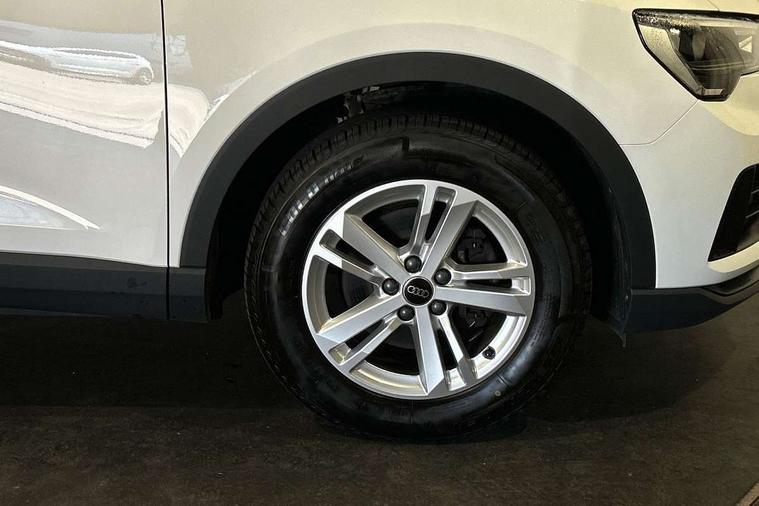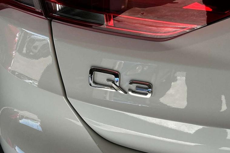 Amazon alexa Integration, Audi drive select, Audi lane departure warning, Audi Virtual Cockpit - 10.25" display, Bluetooth interface, Camera based traffic sign recognition, Legal emergency call, MMI Navigation Plus with high resolution 10.1 inch touchscreen colour display, Power operated tailgate, Progressive steering, Service interval indicator, Smartphone interface includes wireless Apple carplay/Android Auto, Start stop system with recuperation, Voice control system with natural language interaction, Standard suspension, 2 USB-C ports with charge and data functions, 6 passive loudspeakers, DAB digital radio module, Acoustic windscreen, Auto dimming frameless rear view mirror, Black roof rails, Body colour door mirrors, Diffuser in grained anthracite, Electrically folding, adjustable and heated door mirrors with integrated LED side indicators and kerb view function for passenger side, Exterior bumper with wheel arch trims and side sill trims in grained black matt, Front and rear electric windows, Grained radiator protective grille, Halogen rear lights, LED headlights with LED daytime running lights, Rain and light sensors, Rear side wing doors, Rear wiper, Third brake light, Variable front intermittent wipers, 12V socket in rear centre console, 3 seat bench in 2nd row, 3 spoke multi-function leather steering wheel, 40:20:40 folding with manual adjustment for 60:40 forwards/backwards position and backrest angle, Dual zone electronic climate control, Front and rear floor mats, Front and rear headrests, Front and rear roof module including reading lights, Front centre armrest, Glove compartment lighting, Height and reach adjustable steering wheel, ISOFIX child seat mounting for front passenger with airbag deactivation and outer rear seat including top tether attachment point for outer rear seats, Luggage compartment light, Lunar silver cloth headlining, Manual front seats with height adjustment, Single front passenger seat, Stainless steel luggage compartment sill finisher, Non smoking pack - Q3, 3x3 point rear seatbelts, 6 airbags - Driver, front passenger, curtain and side windows, Audi pre-sense front with pedestrain and cyclist recognition, Electrically operated child locks on rear doors, Electromechanical parking brake, Electronic stabilisation control including ABS, ASR and EDL, Front seatbelt reminder, Hill descent control, Hill hold assist, Pre sense basic, Seatbelt monitoring, Tyre pressure warning, Warning triangle and first aid kit, Anti theft alarm, Anti theft wheel bolts, Immobiliser, Remote central locking, Detail dashboard around MMI touch colour display in glass look, black with surround in aluminium look, Micrometallic silver inlay, 17" 5 twin spoke design alloy wheels,