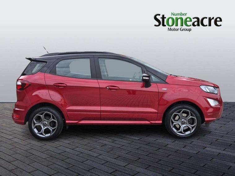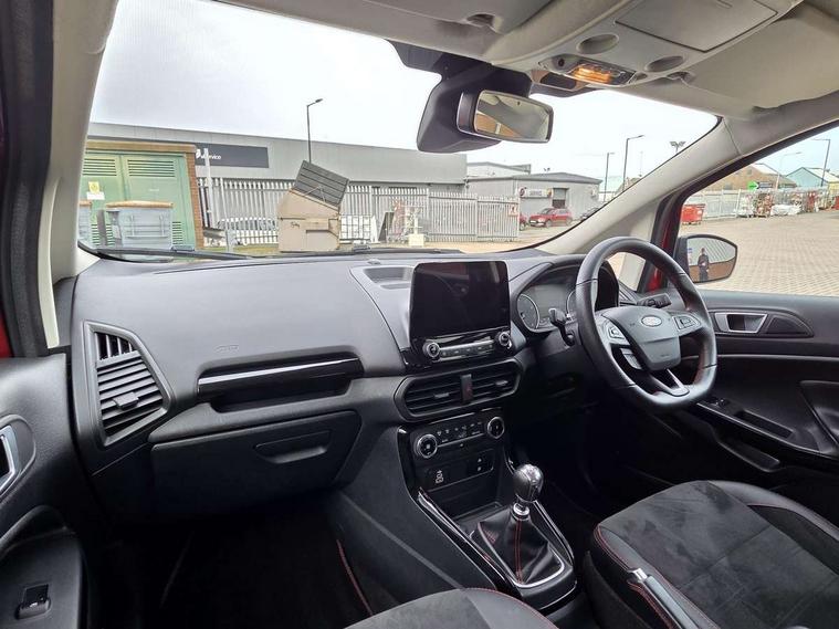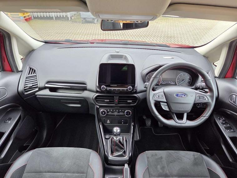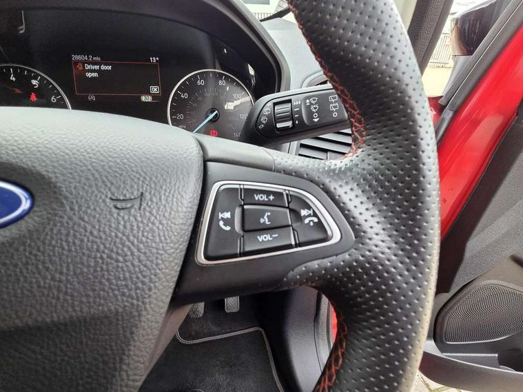 Cruise control, e-Call (emergency call), Easy fuel capless refuelling system, Ford SYNC 3 nav system with DAB radio, 8" screen, emergency assistance, Apple car play/Android auto, 2x USB, 6 speakers, Ford pass connect, Intelligent speed limiter, PAS, Rear parking sensors, Rear view camera, Traffic sign recognition, Trip computer, Sports suspension, Steering wheel mounted audio controls, Auto dimming rear view mirror, Automatic front wipers, Automatic headlights, Black roof rails, Body colour door handles, Body coloured bumpers, Chrome lower window surround, Electrically adjustable and heated door mirrors, Front fog lights, Front grille bars and surround in black, Headlight levelling control, Large rear roof spoiler, LED day running lights, LED third brake light, Power front and rear windows, Puddle lights, Quick-clear heated windscreen, Rear side wing doors, Rear wiper, ST Line body styling kit - Black headlamp bezel, front and rear sport bumpers, body colour lower door claddings, 12V socket in front and rear, 3 seat bench in 2nd row, 60/40 split rear seats, Ambient lighting, Centre console with sliding front armrest, Cooled glovebox, Courtesy lights with map reading light, Driver seat height/lumbar adjust, Driver's side glovebox, Driver/passenger sunvisors and lidded vanity mirrors, EATC - Electronic Auto Temperature control, Folding grab handles, Front head restraints, Front seat back map pockets, Illuminated glovebox, Illuminated luggage compartment, Isofix system on outer rear seats, Luggage compartment carpet, Neosuede/Partial sensico leather upholstery, Overhead console with sunglasses holder, Rake adjustable rear seats, Reach + rake adjustable steering column, Rear headrests, Sensico trimmed steering wheel, handbrake and gearshift gaiter with red stitching, Single front passenger seat, ST-Line Front floor mats with red stitching, Stainless steel sports pedals, Storage drawers under front seats, Tie down hooks, Variable boot floor, 3x3 point rear seatbelts, ABS, Autonomous emergency braking, Child locks on rear doors, Curtain airbags, Driver airbag, Drivers knee airbag, Electronic Stability Programme with hill launch assist, Front passenger airbag deactivation, Front side airbags, Passenger airbag, Pre collision assist system with AEB, Seatbelt reminder for driver and front passenger, Traction control, Tyre pressure monitoring system, Immobiliser, MyKey system, Remote central locking, Thatcham 1 volume sensing alarm, Low rolling resistance tyres, Tyre inflation kit,