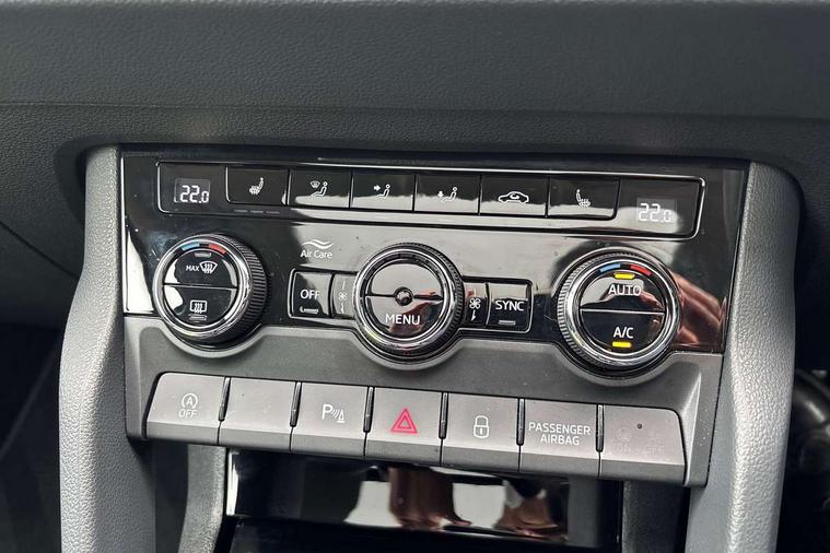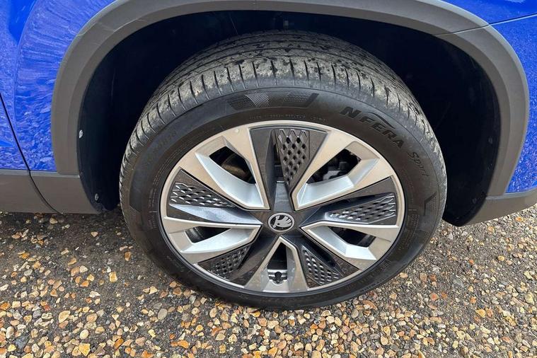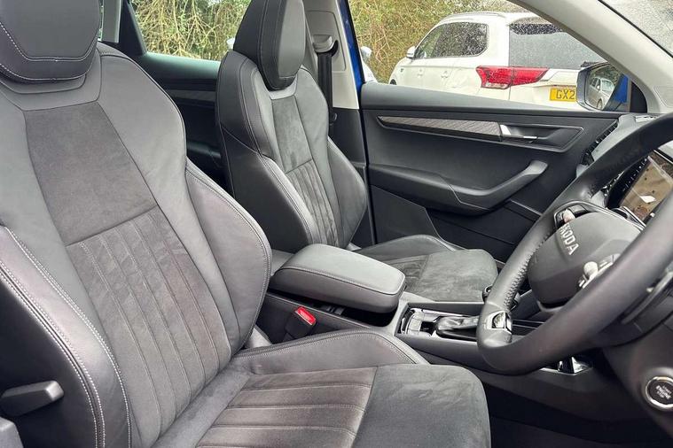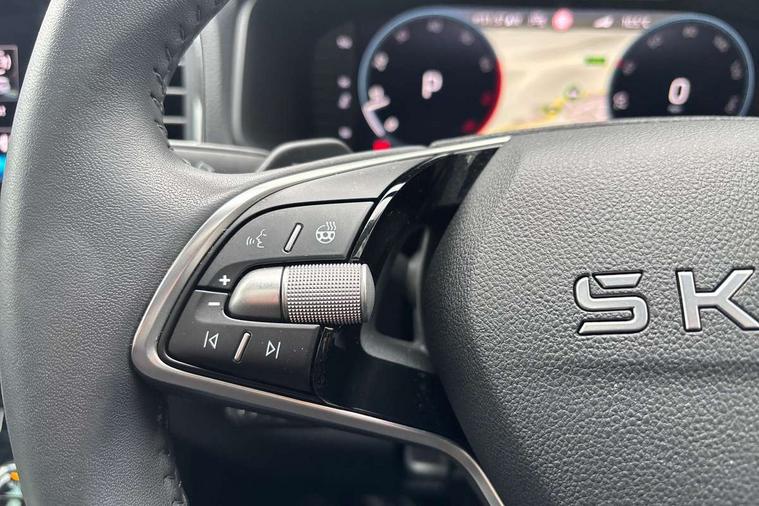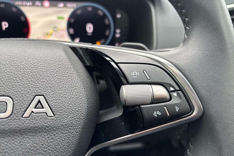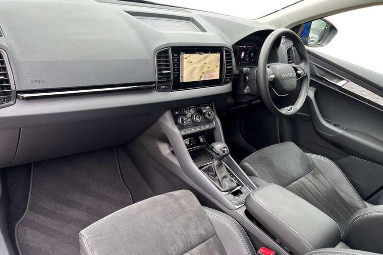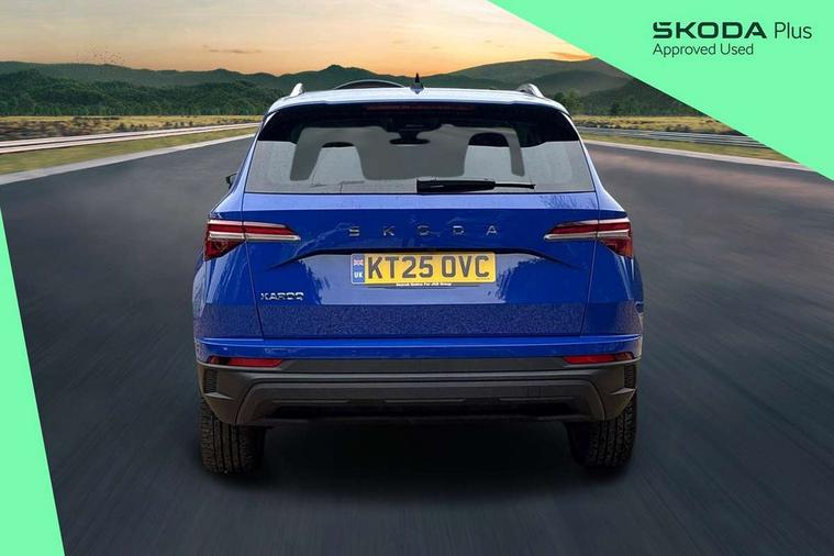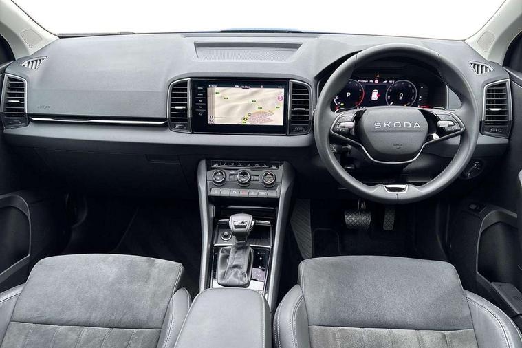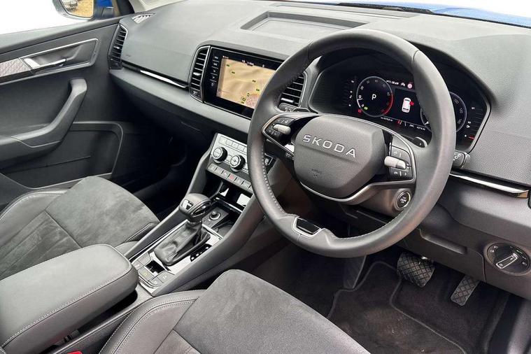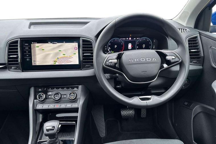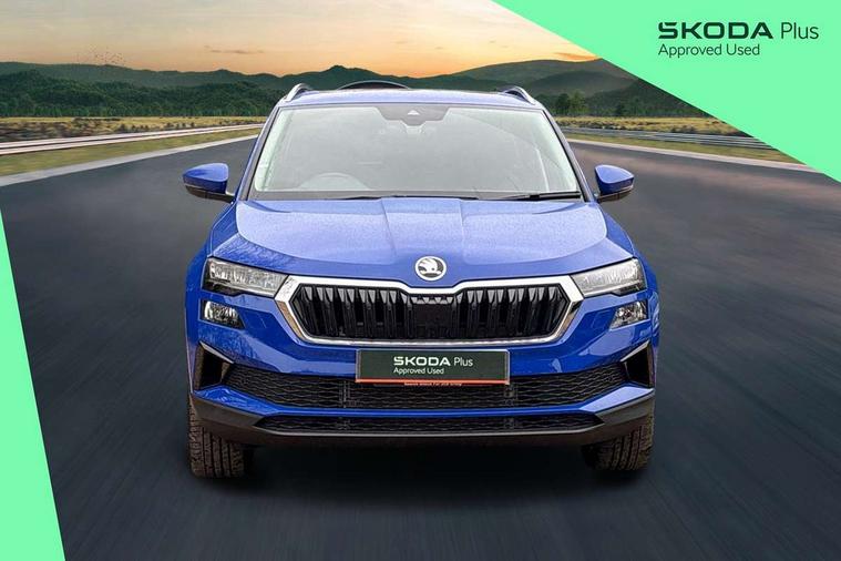Advanced driver attention and drowsiness monitor, Drive Mode Selection including ECO function, Electro-mechanical PAS, Emergency services call system, Outside temperature gauge, Sensor for driver assistance systems, Service interval indicator, SmartLink wireless for Apple and wired for Android, Start/stop system with regenerative braking, Traffic sign recognition, USB C Port x 2 in front centre console, Virtual Cockpit - 10.25" digital display, Virtual pedal with electrically operated boot door, Wireless smartphone charging, DAB radio with Bluetooth, USB connection, Acoustic glass, Aero front windscreen wipers with intermittent function, Auto dimming rear view mirror with light and rain sensors, Black electric window control buttons, Body colour door mirrors and handles, Electric front and rear windows with child proof lock, Extended rear roof spoiler, Heated rear windscreen, LED daytime running lights, LED rear lights with high functionality welcome effect and dynamic indicators, Light assistant (coming/leaving home/tunnel light), Plastic scuff plates in door apertures, Privacy glass, Rear side wing doors, Rear window wiper with washer system and intermittent control, Safety reflectors on front doors, Third brake light, Unique dark chrome design logo on alloy wheels, 1.5 litre bottle holders in driver and front passenger door panels, 12V socket in boot, 12v socket in front centre armrest with storage compartment and rear air vents, 2 spoke leather heated multifunction steering wheel with DSG paddles, 2 x Tablet holder, 3 rear height adjustable headrests, 3 seat bench in 2nd row, 4 foldable roof handles with rear coat hooks, Black floor carpet, Cargo elements in boot, Chrome inner door handles, Decorative door sills with KAROQ badging, Foldable hooks in the boot, Front head restraints, Height adjustable front three point seats belts with tensioners, Height/reach adjust steering wheel, Ice scraper, Illuminated glovebox, Illuminated luggage compartment, Interior noise suppression, Isofix child seat preparation for front passenger seat, Isofix child seat preparation outer rear, Manual lumbar support for front seats, Pearl grey interior ceiling, Pen holder, Pollen filter, Rear boot cover, Rear package tray, Rear reading lights, Rubbish bin door, Safety vest holder, Single front passenger seat, Skoda lettering on steering wheel, Storage box in upper central dashboard closed, Sunvisors with illuminated vanity mirrors, Textile floor mats, Ticket holder, Columbus pack - Karoq, Design Pack - Karoq, Non Smokers pack, Parking pack - Karoq, Automatic door unlocking in case of crash, Automatic fuel cut off in case of crash, Driver airbag, Electronic parking brake with auto hold function, Emergency rear braking signal, ESC (incl. ABS+MSR+ASR+EDS+HBA+DSR+RBS+MKB), Front side airbags, Head airbags, Hill hold control, Knee airbags, Passenger airbag with switch-off function, Pedestrian monitor, Power operated child safety locks, Seatbelt reminder signalisation and pretensioner for all seats, Three point seatbelts rear, Two tone horn, Tyre pressure monitor, Alarm with interior monitoring, back up horn and tilt sensor with safe function, Electronic engine immobiliser, Keyless entry and start/stop, Remote central locking with 2 remote folding keys, Black centre console, Chrome framed air vents, Satin black dashboard, Anti-theft wheel bolts protection, Breakdown and tool kit,