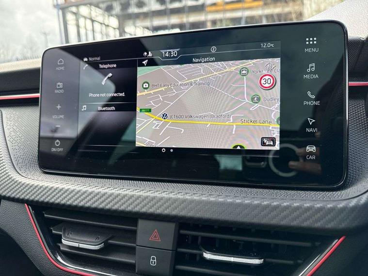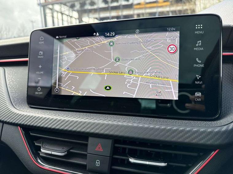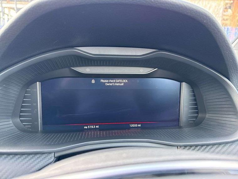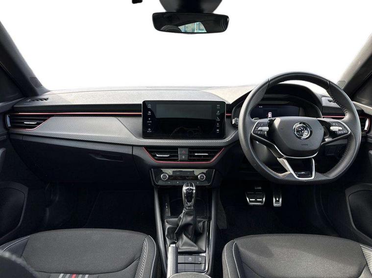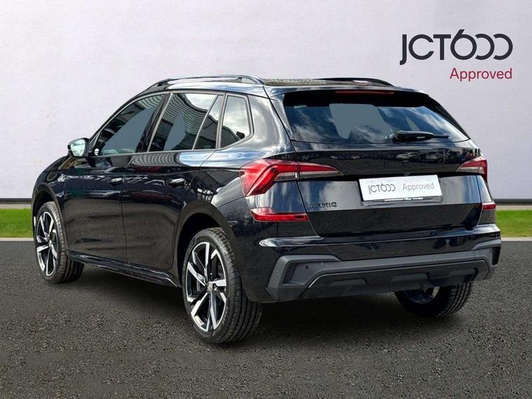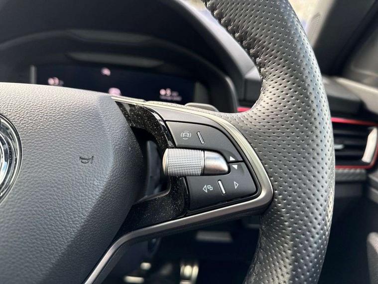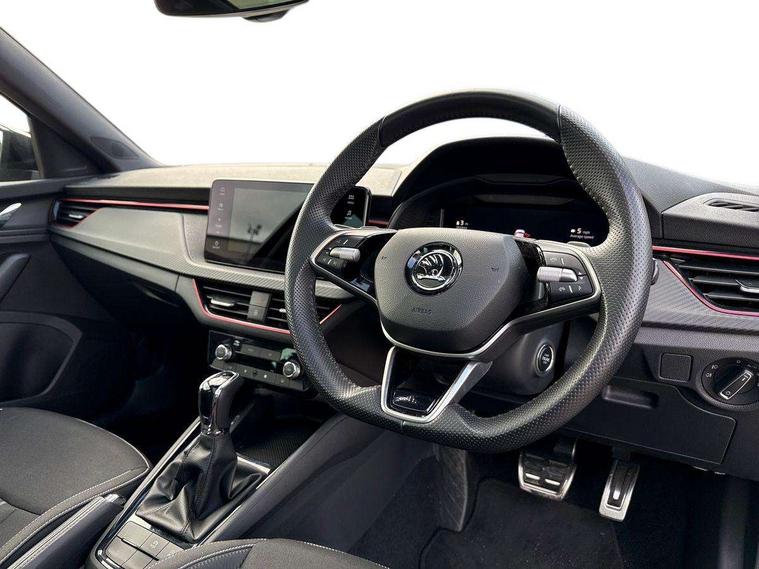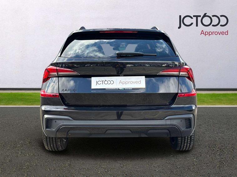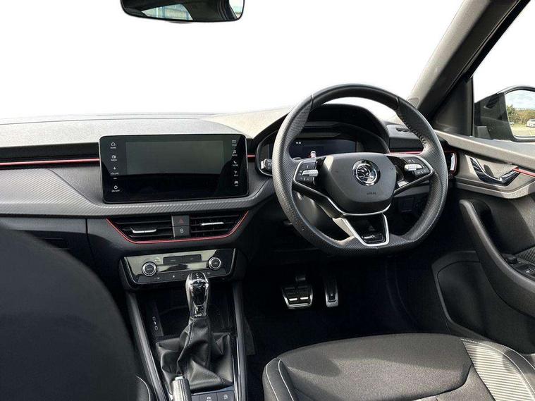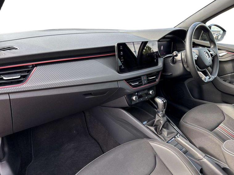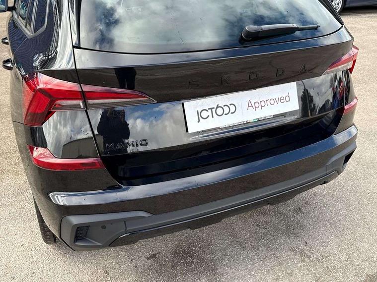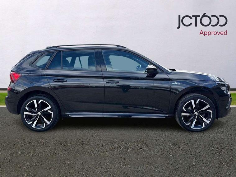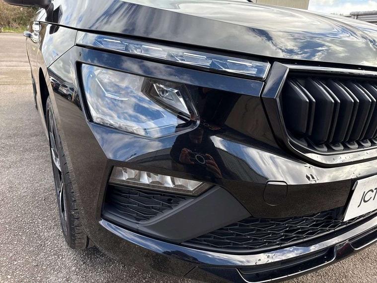 Advanced driver attention and drowsiness monitor, Bluetooth system, E-call, Front assist system, PAS, Rear parking sensors, Service indicator, Speed limiter, Traffic sign recognition, Virtual cockpit with 10.25" display, Voice control system, Wireless smartlink, 4 USB C ports, 8 speakers, 9.2" Skoda navigation display, DAB Digital radio, Auto dimming rear view mirror, Automatic headlight control with coming home and leaving home feature, Automatic headlights, Black door mirrors, Black radiator grille, Black rear diffuser, Black roof spoiler, Body colour bumpers, Body colour door handles, Boot lettering in black, Extended tailgate glass, Front and rear electric windows, Heated rear window, LED daytime running lights, LED high beam, LED low beam, LED third brake light, Monte carlo plaque, Panoramic sunroof with black roof rails, Privacy glass, Rear side wing doors, Rear wiper, Ticket holder inside windscreen, 12V socket in luggage compartment, 3 seat bench in 2nd row, Aluminium pedals, Ambient lighting in white/red, Art leather carbon decor inserts, Art leather carbon door inserts, Black roof lining, Cargo elements, Chrome inner door handles, Driver and passenger sun visors with vanity mirror, Dual zone climate control, Front and rear roof lights, Front centre armrest, Front head restraints, Glove compartment with illumination, Height adjustable driver seat, Height adjustable front passenger seat, Ice scraper, Inner circulation control with pollen filter, ISOFIX on front passenger seat, Isofix preparation for back seats, Leather gearknob and handbrake lever, Manual lumbar support for front seats, Monte Carlo cloth upholstery, Net package and top tether hooks in boot space, Net under rear shelf, Pocket on the back of both front seats include mobile phone pockets, Rake/reach adjustable steering wheel, Reading lights, Rear centre armrests, Red hotstamping, Single front passenger seat, Sports seats, Textile floor mats, Third rear headrest, Top tether for front passenger seat, Umbrella in driver's door, Light and view plus package - Kamiq, 3x3 point rear seatbelts, Airbags - driver and front passenger, Disc brakes, ESP, Extended and predictive pedestrian/cyclist protection, Front passenger airbag deactivation switch, Front side airbags with curtain airbags, Hill hold control, Manual leather parking brake, Manual rear child locks, One tone horn, Seatbelt reminder for driver an co-driver, Traction control, Tyre pressure monitor, Anti-theft alarm system with interior monitoring, backup horn, towing protection and remote central locking with SAFE system, Anti-theft wheel bolts, Electronic engine immobilizer, 18" Ursa black diamond cut alloy wheels,
