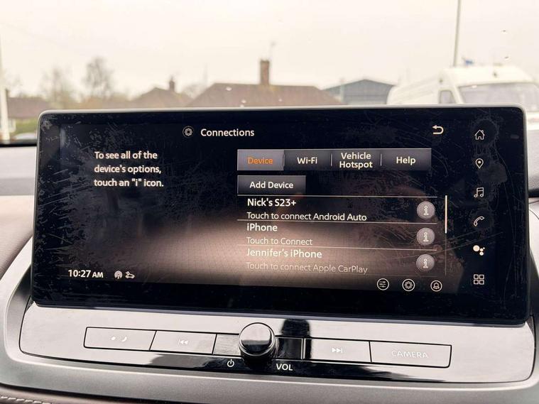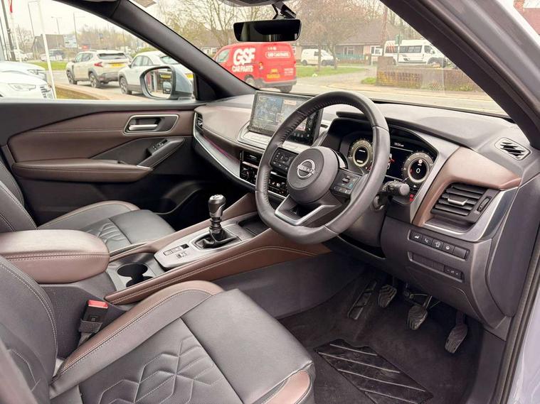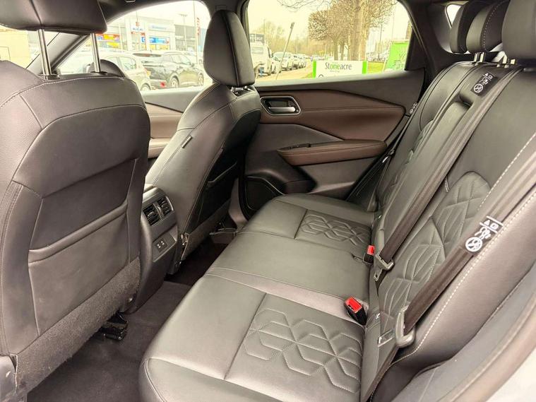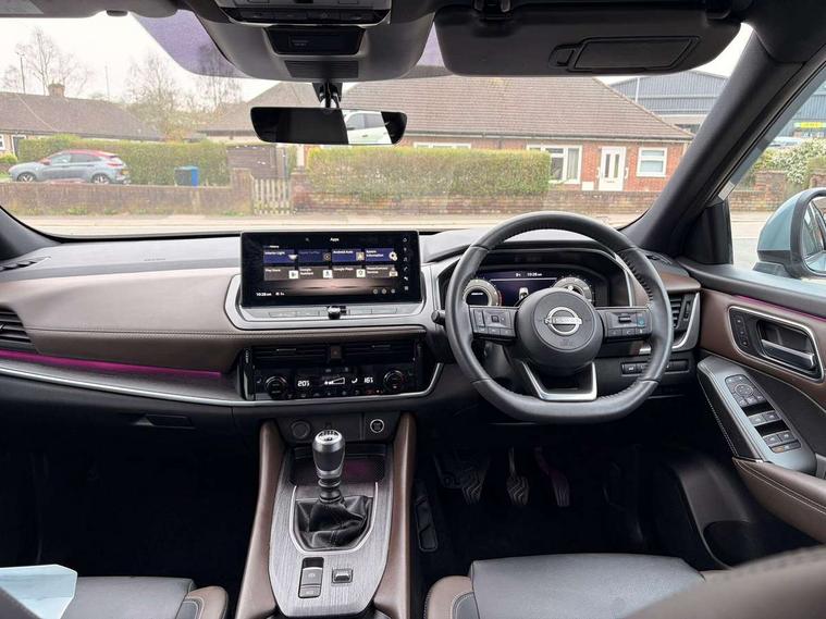 360 degree Intelligent around view monitor with moving object detection, Advanced windscreen head up display, Blind spot intervention, Blind spot warning, Drive assist, Drive assist custom mode, Drive modes (sport, normal, eco), Driver drowsiness and attention warning, Electric speed sensitive power steering, Emergency and breakdown call, Emergency lane keep assist, Emergency Stop Signal (ESS), Engine start/stop button, Event data recorder, Front and rear parking sensors, Full Digital 12.3" TFT Digital Combimeter, Google virtual personal assistance, Hands free power tailgate, Idle stop/start system, In-car WIFI hotspot, Intelligent Cruise control (ICC), Intelligent forward collision warning, Intelligent speed assist, Lane departure warning system, Nissan connect 12.3 inch touchscreen infotainment system, Nissan connect navigation with google maps, Nissan connect services 2.0 (Google Automotive System), Outside temperature sensor, Rear cross traffic alert, Reversing detection, Wireless Apple CarPlay/Android Auto, Wireless charging pad, Limited slip differential, 2 front USB-C ports, 2 rear USB-C ports, 6 speakers, AM/FM audio system with DAB, Bluetooth audio streaming, Auto dimming frameless rear view mirror, Auto rear wiper when reversing, Body colour mirror caps, Body coloured door handles, Bodyside mouldings, Chrome side window finisher, Electric auto folding door mirrors, Electrically adjustable and heated door mirrors with LED turn indicator, Follow me home headlights, Glossy black bumper inserts and fenders, High beam assist, Intelligent auto headlights, LED 3rd brake light, LED daytime running lights, LED headlights with adaptive driving beam, LED rear lights, LED sequential turn lights, One touch front and rear electric windows with remote opening and closing, One touch passenger window, Partially body coloured bumpers, Rear privacy glass, Rear roof spoiler, Rear side wing doors, Rear styling plate, Reverse tilting door mirrors, Shark fin antenna, Silver roof rails, Splash free rain sensing wipers, Super RED rear LED lights, Super UV and infrared cut glass, Thermaclear heated windscreen, 3 bench rear seats in 2nd row, 3 rear headrests, 60/40 split folding rear seat bench, Chrome interior door handles, Dark headlining, Driver seat back pocket, Dual zone automatic climate control with pollen filter, Fixed Glass roof with electric sunshade, Front door with bottle holders, Heated front seats, Heated steering wheel, Height adjustable front headrests, Leather shift knob, Luggage board system, Luggage space lighting, Multifunction steering wheel, Passenger seat back pocket, Quilted/PVC upholstery, Rear door bottle holders, RGB ambient light (Full area coverage), Single front passenger seat, Smooth leather steering wheel, Tilt/telescopic adjustable steering wheel, Two rear isofix child seat anchorage points with top tether, 3x3 point rear seatbelt pretensioners + load limiters, Autonomous emergency braking, Child locks on rear doors, Curtain and front side, far side airbags, Driver and passenger airbags, Driver, passenger and 2nd row rear seat belt reminder, Electric handbrake with auto hold function, Front seatbelt pretensioners + load limiters, Height adjustable front seatbelts, Hill start assist, intelligent front emergency braking, Rear automatic braking, Tyre pressure monitoring system, Vehicle dynamic control, Engine immobiliser, Intelligent key with walk away lock and approach unlock functions, Remote central door locking with deadlocking, Thatcham alarm, 19" Diamond cut alloy wheels, Tyre puncture repair kit,
