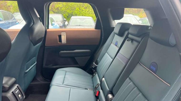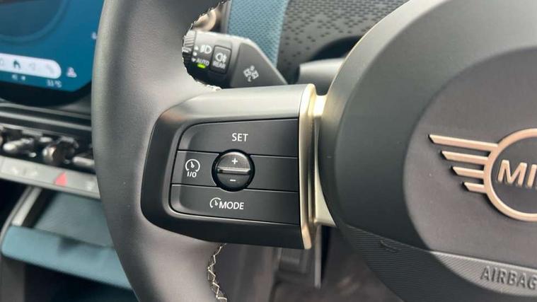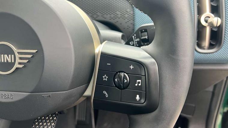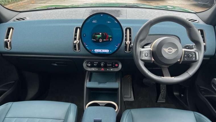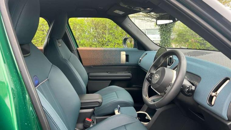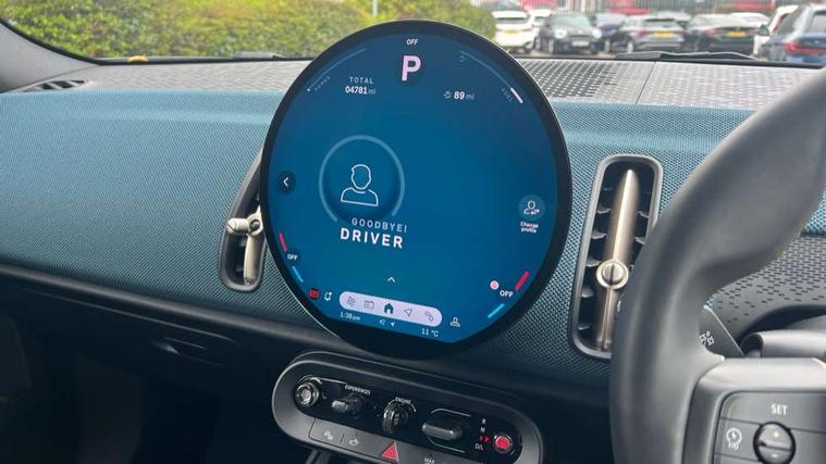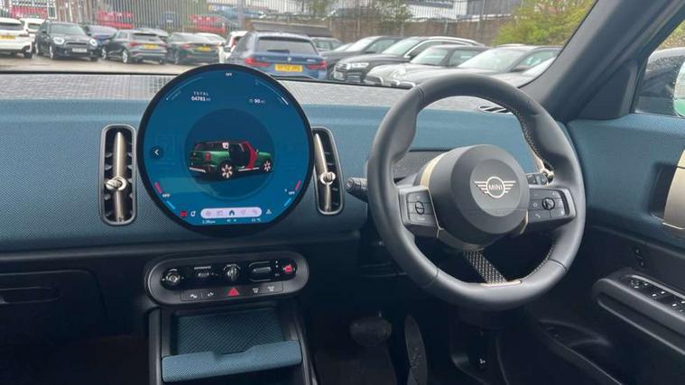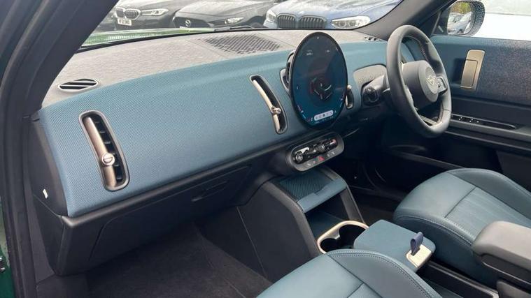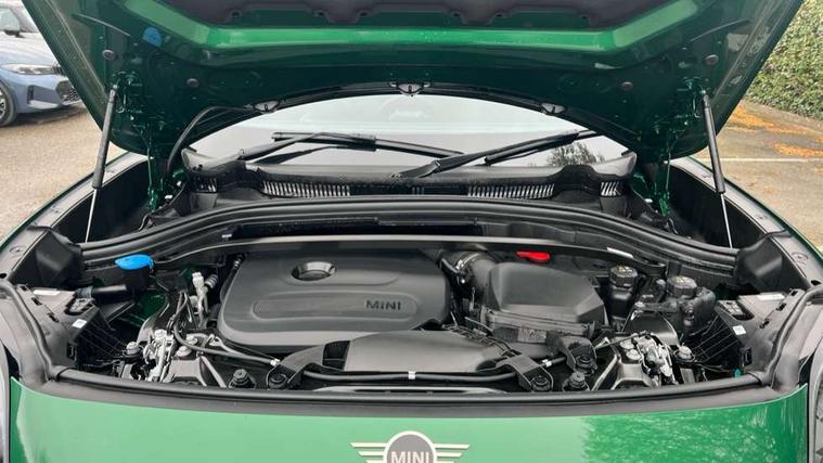 Bluetooth connection, Circular OLED Screen, Compatible mobile phone bluetooth with audio streaming, Cruise Control (DCC), Digital dashboard display, E-call, Electro-mechanical speed dependant steering assistance, MINI Experience Modes, Mini navigation system, MINI TeleServices, Parking assistant in camera and ultrasound based assistance system, rear view camera, parking aid and distance control, Auto transmission with Paddles, 6 speakers, DAB Digital radio, Personal eSim, Auto tailgate, Electric adjustable heated door mirrors, Front and rear electric windows, Heated rear window, LED daytime running lights, LED Headlights, LED rear lights, LED third brake light, Logos in Vibrant Silver, Rain sensor with auto headlights, Rear side wing doors, Rear window wiper, Roof rails, Vibrant silver grille surround, 3 seat bench in 2nd row, 60/40 split rear bench seat, Anthracite headliner, Auto air conditioning, Floor mats, Front armrest, Front headrests, Front sport seats, Heated steering wheel, Height and length steering column adjustment, Lidded storage box in Petrol knit, Rear headrests, Single front passenger seat, Sport Vescin Steering Wheel, Sunvisors with vanity mirrors, Vescin synthetic leather upholstery, Vibrant Silver sill inlay, 3x3 point rear seat belts, 6 Airbags - front, side, head and seat belt tensioners, ABS, DSC - Dynamic Stability Control, Electronic handbrake, Electronic Stability Programme (ESP), Front ISOFIX (iSize), Hill hold assist, Hill start assist, Manual rear child locks, Traction control, Tyre pressure monitoring system, Warning triangle, Alarm system with tilt sensor, monitoring doors, bonnet interior and tailgate, Auto drive away locking, Deadlocking function, Electronic vehicle immobiliser, Locking wheel bolts, Remote control locking, Start/stop toggle with keyless go, Petrol/Brown dashboard knit, MINI Mobility Kit,