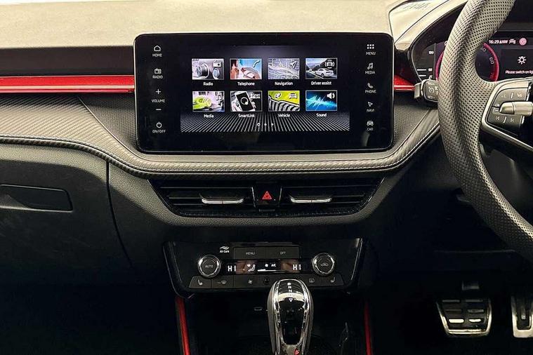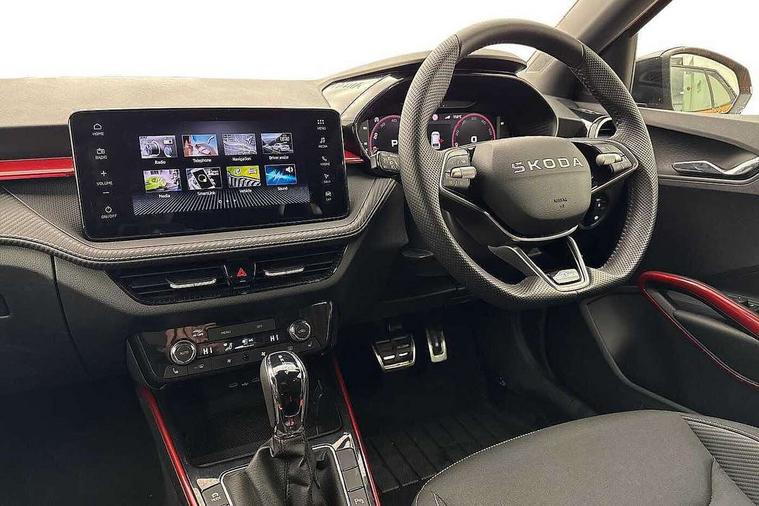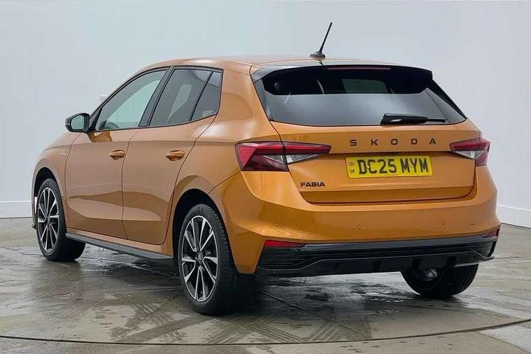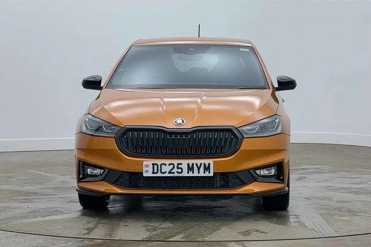 Advanced driver attention and drowsiness monitor, Bluetooth connection, Driver alert system, Electromechanical power steering, Exterior temperature gauge, Service interval indicator, Traffic sign recognition, Virtual cockpit with 10.25" colour display, Wireless SmartLink for Apple CarPlay and Android Auto, 6 Speakers (4 in front and 2 in rear), 9.2" colour display skoda navigation system with voice control and web radio, Auxiliary socket for external MP3 player, DAB digital radio reception, Auto dimming rear view mirror, Black radiator grille, Body coloured bumpers, Door mirror integrated indicators, Dynamic headlight range control, Front and rear electric windows, Front window wiper intermittent control, Ice scraper in fuel cap, LED 3rd brake light, LED daytime running lights with coming and leaving home feature, LED rear lights, Monte Carlo badging, Privacy glass, Rear LED fog light, Rear side wing doors, Rear window wiper with washing nozzles, Roof mounted spoiler, SKODA tailgate lettering in black, Sports bumpers, Unique dark chrome design logo on alloy wheels, 2 LED reading lights in front and rear, 3 rear headrests, Aluminium pedals, Backrest split and folding, Black headlining, Central console with fixed cup holder and storage box, Chrome handbrake release button, Door sills with fabia badging, Dual zone air conditioning with climatronic electronic control, Fabric/artificial leather upholstery, Front centre armrest, Front sports seats, Gearshift knob/handle in leather, Hand brake lever handle in leather, Height adjustable front headrests, Height adjustable front seats, Height adjustable steering wheel, ISOFIX and TopTether anchorage points to the outer rear seats, ISOFIX and TopTether on the front passenger seat, Luggage compartment lighting, Manually adjustable lumbar support in front seats, Metallic painted red central console cover, Metallic red interior door handles, Pollen filter, Rear seat bench unsplit, Single front passenger seat, Skoda lettering on steering wheel, Sun visors with mirror and airbag label on passenger side, Textile floor mats, Ticket holder, Umbrella in drivers door, Ambient lighting pack - Fabia Hatchback, Convenience pack - Fabia, Light and view pack plus - Fabia, 3-point height adjustable front seats belts with pretensioner and force limiter, Automatic warning lights in case of crash, Driver and passengers airbag with switch off function, e-Call+, ESC including ABS, MSR, ASR, EDS, HBA and XDS, Front and rear seat belt warning, FRONT ASSIST (AEB City and AEB Inter Urban), Front side airbags, Head airbags, Hill hold control, One tone horn, Pedestrian protection, Three rear 3-points safety seat belts with pretensioner and force limiter including stop function for outer rear seat belts, Tyre pressure monitoring system, Anti-theft alarm system including immobiliser, interior monitoring, backup horn, and towing protection, Central locking with radio remote control, interior controls, SAFE function and 2 foldable keys, Carbon effect door and side trim panels, Carbon effect lower decorative trim with white stitching, Monte carlo air vents, Red metallic upper decorative trim, Anti-theft wheel bolts protection, Super-low rolling resistance tyres,