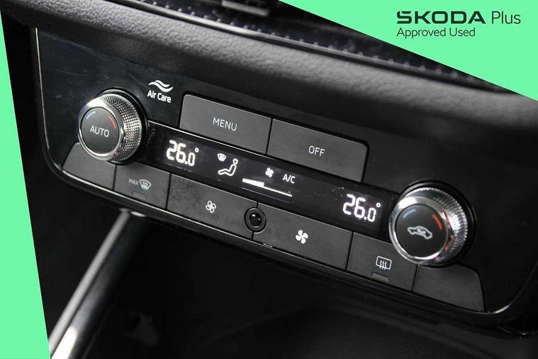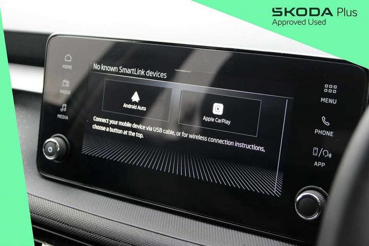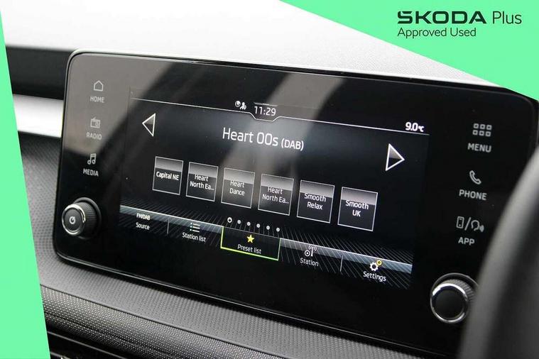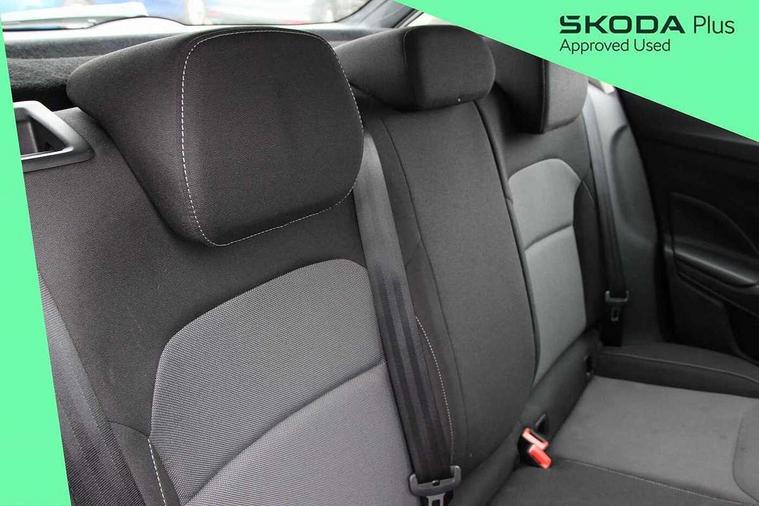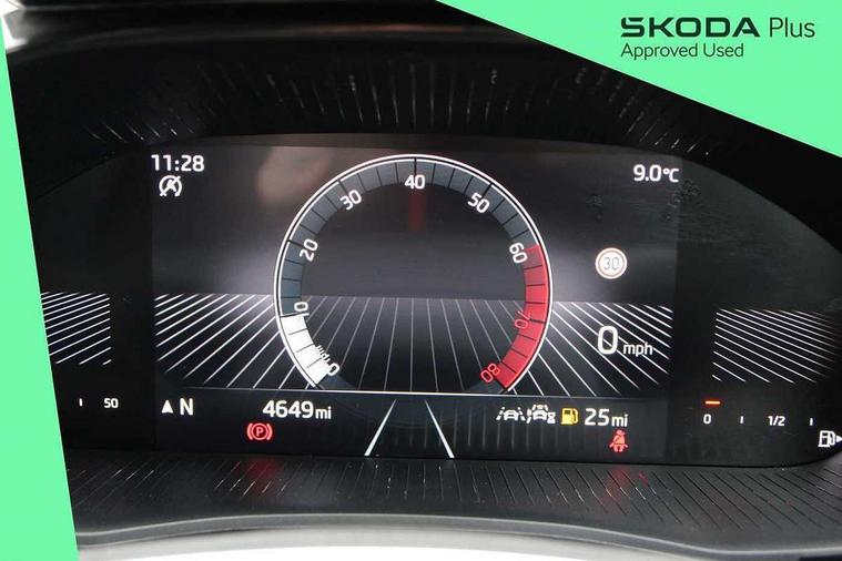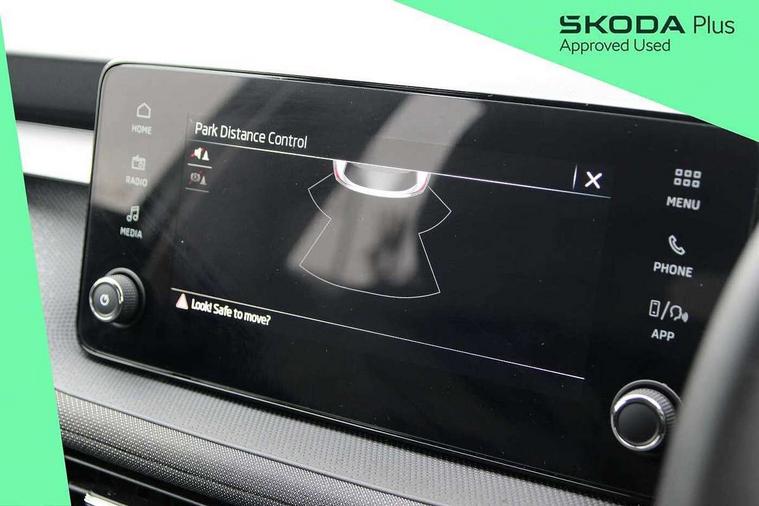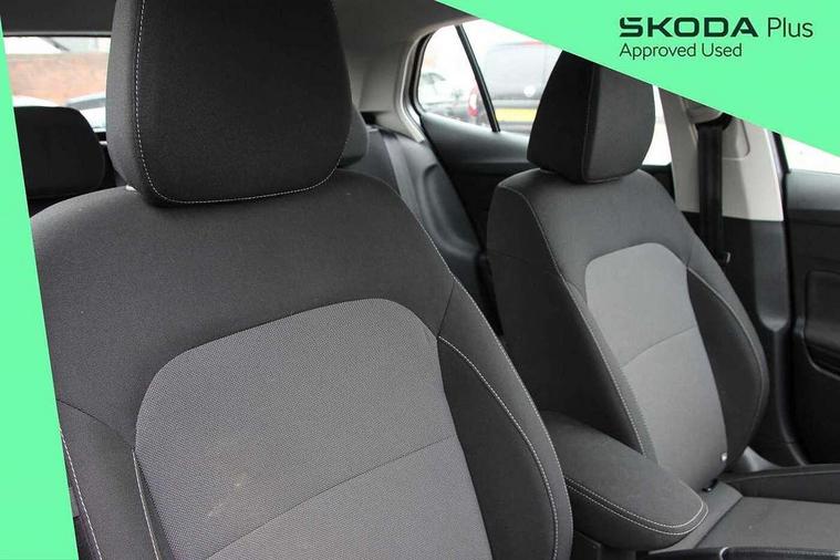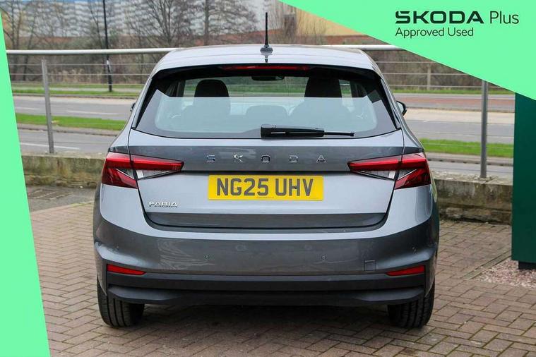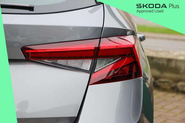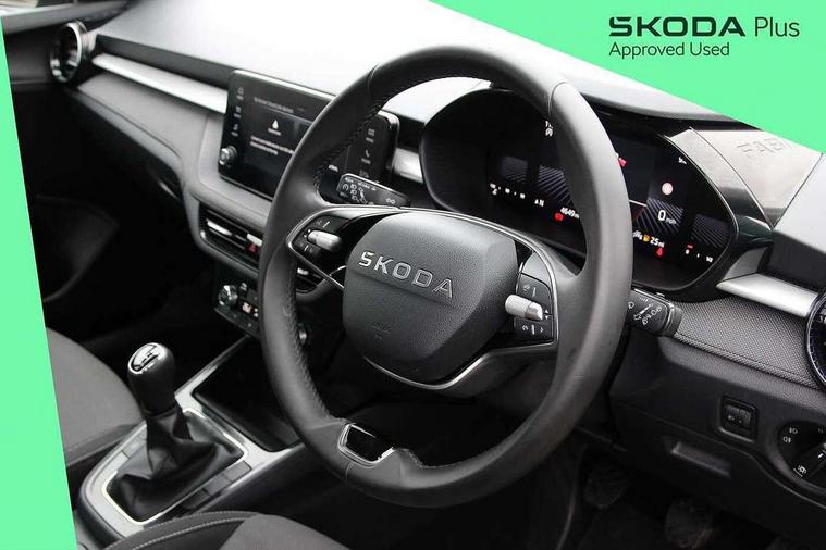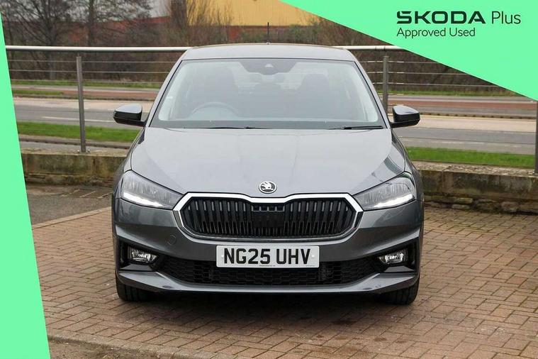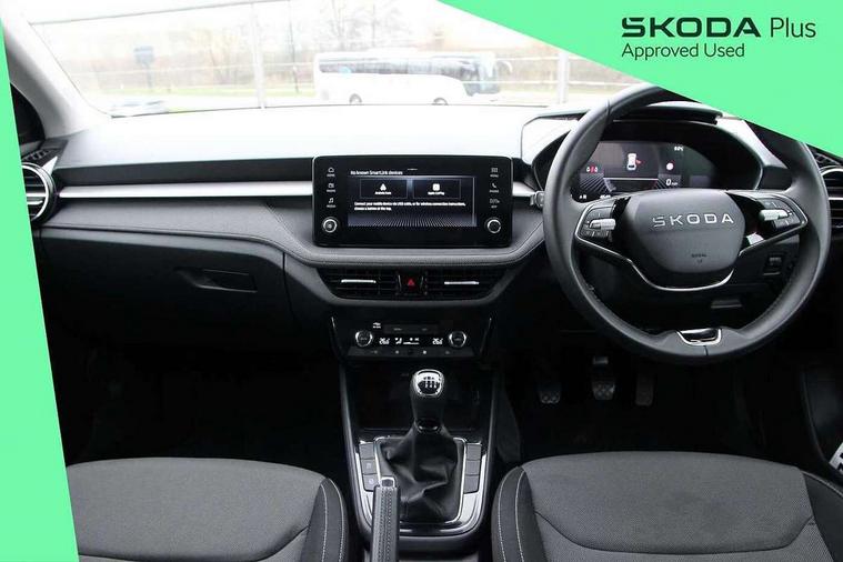 8" Digital instrument display, Advanced driver attention and drowsiness monitor, Bluetooth connection, Driver alert system, Electromechanical power steering, Exterior temperature gauge, Service interval indicator, Traffic sign recognition, Wireless SmartLink for Apple CarPlay and Android Auto, 6 Speakers (4 in front and 2 in rear), 8.25" Skoda infotainment touchscreen display, Auxiliary socket for external MP3 player, DAB digital radio reception, Auto dimming rear view mirror, Body colour door mirrors, Body coloured bumpers, Door mirror integrated indicators, Front and rear electric windows, Front window wiper intermittent control, Headlight range control - Automatic, Ice scraper in fuel cap, LED 3rd brake light, LED daytime running lights with coming and leaving home feature, LED rear lights, Rear LED fog light, Rear side wing doors, Rear window wiper with washing nozzles, Roof mounted spoiler, SKODA tailgate lettering in chrome, Unique dark chrome design logo on alloy wheels, 2 reading lights in front and 2 reading lights in rear, 3 rear headrests, Backrest split and folding, Central console with removable cup holder and storage box, Chrome handbrake release button, Dual zone air conditioning with climatronic electronic control, Fabric upholstery, Front centre armrest, Gearshift knob/handle in leather, Grain satin black interior door handles, Hand brake lever handle in leather, Height adjustable front headrests, Height adjustable front seats, Height adjustable steering wheel, ISOFIX and TopTether anchorage points to the outer rear seats, ISOFIX and TopTether on the front passenger seat, Luggage compartment lighting, Manually adjustable lumbar support in front seats, Pollen filter, Rear seat bench unsplit, Single front passenger seat, Skoda lettering on steering wheel, Storm grey headlining, Sun visors with mirror and airbag label on passenger side, Textile floor mats, Ticket holder, Umbrella in drivers door, Ambient lighting pack - Fabia Hatchback, 3-point height adjustable front seats belts with pretensioner and force limiter, Automatic warning lights in case of crash, Driver and passengers airbag with switch off function, e-Call+, ESC including ABS, MSR, ASR, EDS, HBA and XDS, Front and rear seat belt warning, FRONT ASSIST (AEB City and AEB Inter Urban), Front side airbags, Head airbags, One tone horn, Pedestrian protection, Three rear 3-points safety seat belts with pretensioner and force limiter including stop function for outer rear seat belts, Tyre pressure monitoring system, Anti-theft alarm system including immobiliser, interior monitoring, backup horn, and towing protection, Central locking with radio remote control, interior controls, SAFE function and 2 foldable keys, Black painted air vents, Grain satin black central console cover, Metallic grey upper decorative trim, Satin black door and side trim panel in front, Textile Kota grey lower decorative inserts, Anti-theft wheel bolts protection, Super-low rolling resistance tyres,