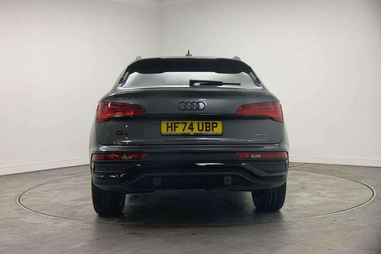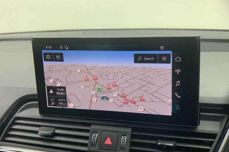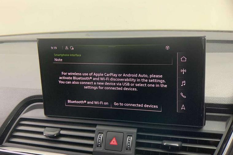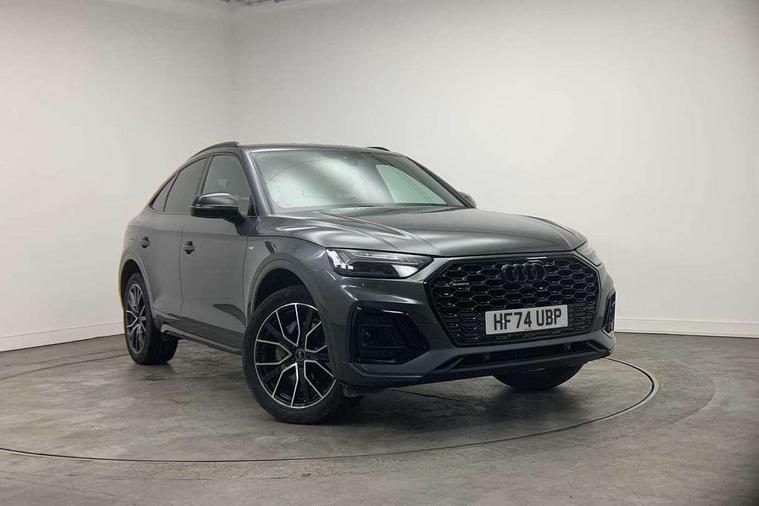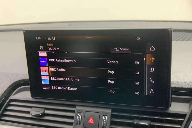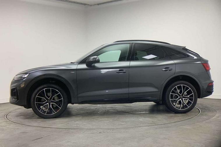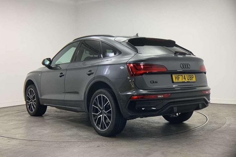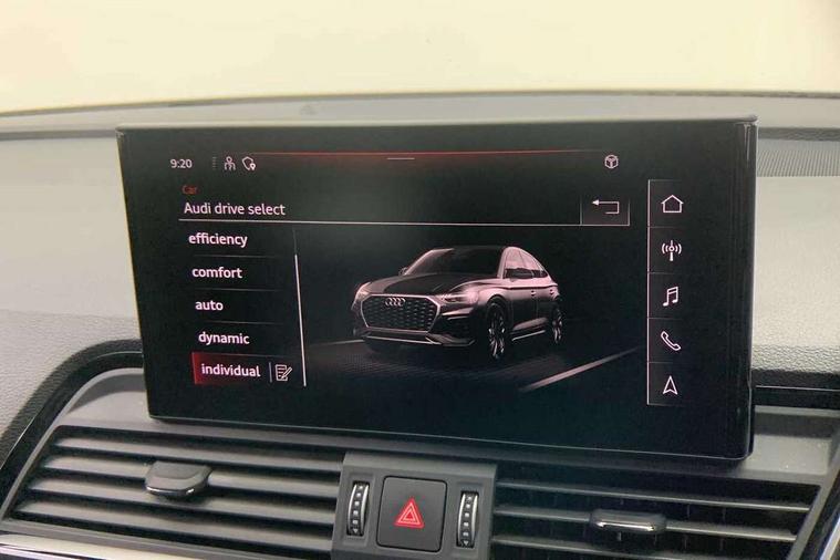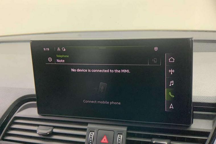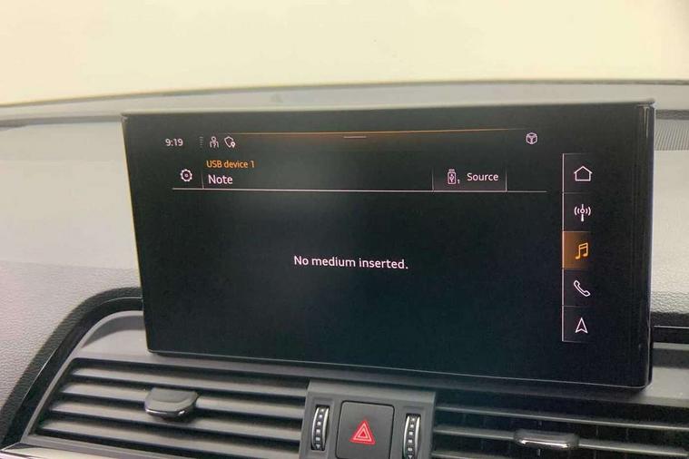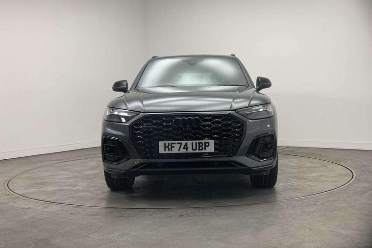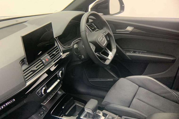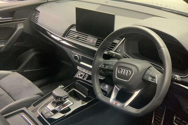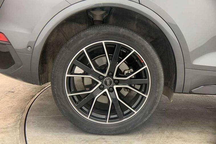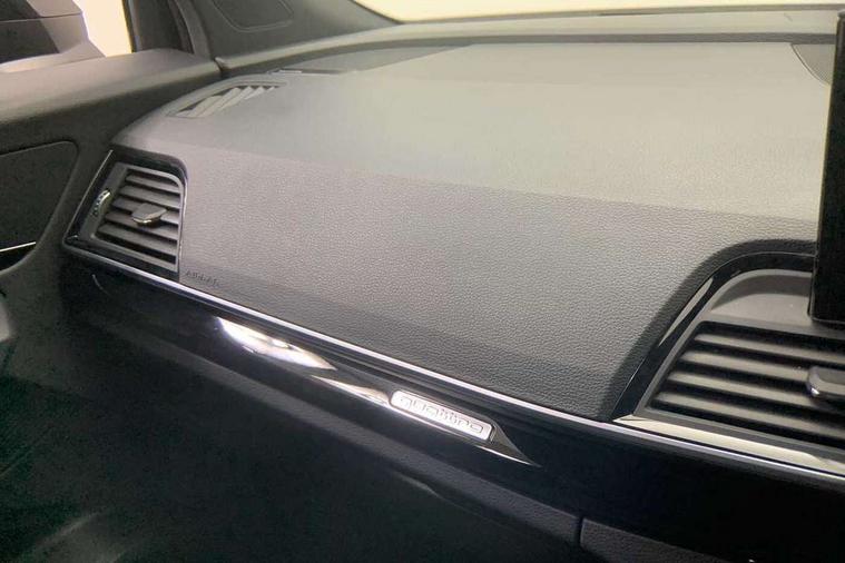 Acoustic front and rear parking sensor, Audi connect safety and service (e-call), Audi drive select, Audi virtual cockpit plus with 12.3" screen and three different layout designs, Audi wireless smartphone interface, Automatic start-stop system with coasting functionality and efficiency programme, Bluetooth interface, Camera based traffic sign recognition, Electro - mechanical power assisted steering, Lane departure warning, MMI navigation plus with 10.1" touch screen, Power tailgate, Reversing camera, Service interval indicator, Voice control system with Audi hotword activation "Hey Audi", Diesel particulate filter, Quattro on demand, S line sports suspension, 2 x USB charging port with aux input socket, 8 loudspeakers, DAB Digital radio, Acoustic windscreen, Auto dimming door mirrors, Auto dimming frameless rear view mirror, Automatic headlight adjustment, Automatic headlights and windscreen wipers, Black roof rails, Black styling with black rings, Body colour bumpers, Body colour rear diffuser with matt aluminium silver surrounds, Body colour underbody protection, Chrome plated exhaust trims, Daytime running lights, Door sills in Selenite silver, Electric adjustable/heated/folding door mirrors, Front air inlet surrounds in aluminium, Front and rear electric windows, Front radiator grille in honeycomb design, LED 3rd brake light, LED headlights and LED tail lights, Loading edge protection in stainless steel, Lower bumpers painted in contrast Manhattan grey, Rear chrome trim strip below lights, Rear privacy glass and rear side windows, Rear side wing doors, Rear wiper, Roof bars, S Line badges on the front wing panels, S Line front and rear bumpers, S Line rear spoiler, S Line side skirts, 3 rear headrests, Black cloth headlining, Comfort front centre armrest, Contrast stitching on seats, steering wheel and gear lever gaiter, Deluxe 3 zone electronic climate control, Front head restraints, Front sport seats with S embossed logo, Front/rear floor mats, Gear lever in black leather, Heated front seats, Height/reach adjustable steering column, Illuminated door sill trims with S logo, Luggage compartment cover, Manual seat adjustment with 4-way electric lumbar support, Single front passenger seat, Stainless steel pedals, Sunvisors with vanity mirrors, Top surface of the rear centre armrest in artificial leather, High gloss pack - Q5, LED interior light pack - Q5, 3 point seatbelts on all seats, 6 airbags - Driver, front passenger, curtain and side airbags, Attention and drowsiness assist, Electrically operated child locks on rear doors, Electromechanical parking brake, Electronic stabilisation control including ABS, ASR and EDL, First aid kit with warning triangle and vests, Front passenger airbag deactivation, Hill descent control, Hill hold assist, ISOFIX child seat mounting for front passenger seat and ISOFIX child seat mounting with Top Tether for outer rear seats, Multi collision brake assist, Pop-up bonnet for pedestrian protection, Pre sense city, Seatbelt monitoring, Tyre pressure warning, Anti theft alarm, Anti-theft wheel bolts, Remote central locking, Remote control key with SAFELOCK and keyless go, Air vents inserts and centre console in gloss black, Tool kit, Tyre repair kit,