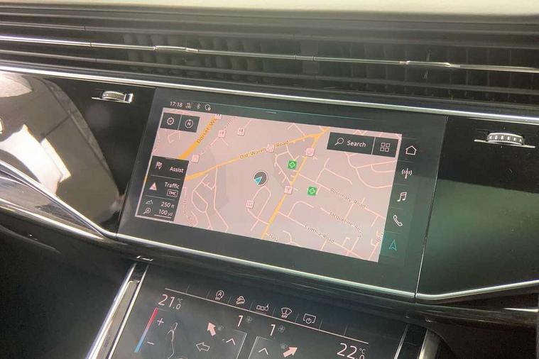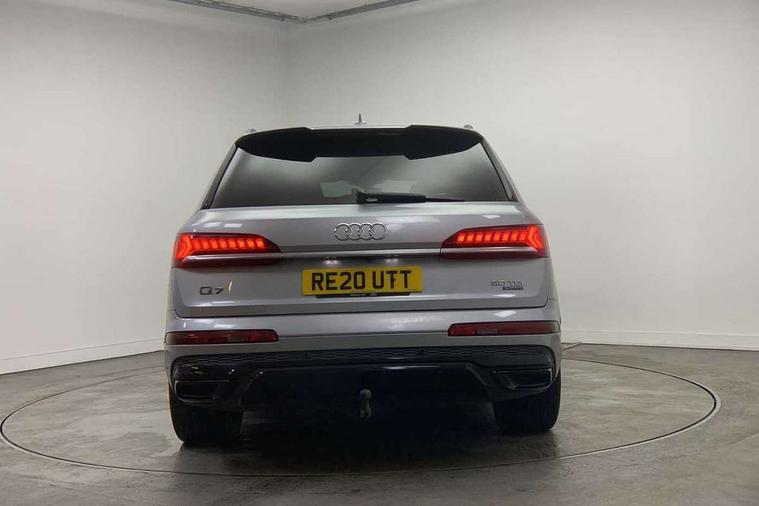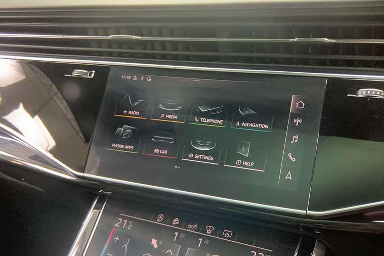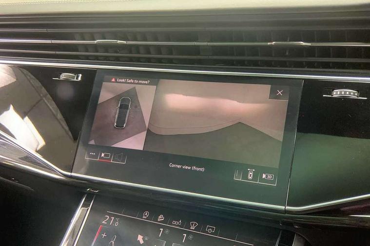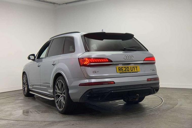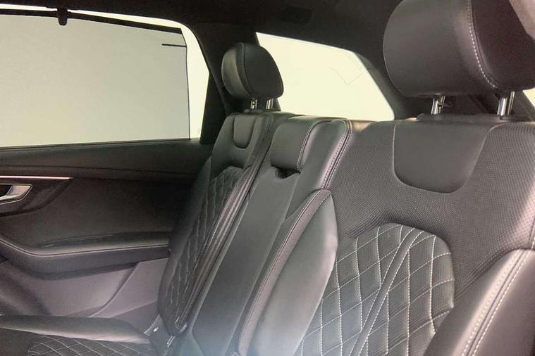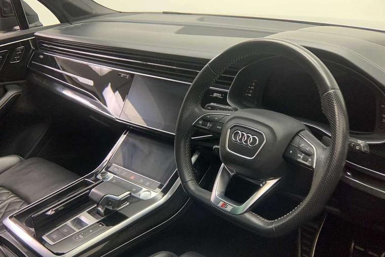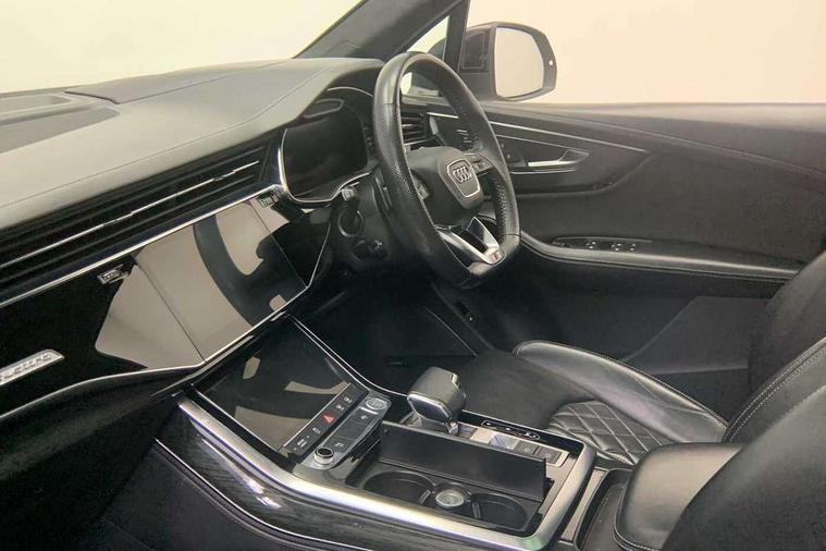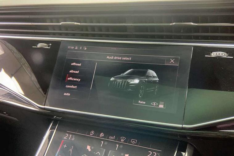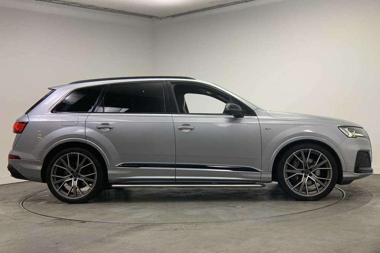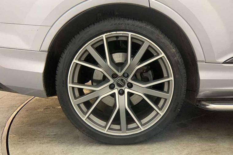 All wheel steering, Audi connect safety and service (e-call), Audi drive select (Auto, Comfort, Dynamic, Efficiency, Individual, Off-road and All road), Audi phone box with wireless charging, Camera based traffic sign recognition, Head up Display, MMI navigation plus with MMI touch screens includes 10.1" and 8.6" screens with haptic feedback, Natural voice recognition, PAS, Power door closure, Power operated tailgate, Smartphone interface includes wireless Apple carplay/Android Auto, Start/stop system, 48V Mild hybrid technology, Adaptive air sports suspension, Quattro all wheel drive with self locking centre differential, 2 USB-C ports with charging functionality in the rear, DAB digital radio module, Audi Beam uses LEDs to project Vorsprung logo, Audi HD matrix LED headlights with Audi laser light + dynamic front and rear indicators, Auto dimming frameless rear view mirror, Black roof rails, Bumpers in contrast paint scandium grey finish includes door trim and wheel arch trim strips, inlays in door strip contain quattro embossing, Electric panoramic glass sunroof, Electrically adj heated/folding + automatically dimming exterior mirrors with memory + automatic kerb side function for passenger side exterior mirror, Headlight washers, Heat insulating glass in windshield, LED daytime running lights, LED rear tail lights, Privacy glass - dark tinted rear and rear side windows from B-pillar backwards, Side running boards, 3 spoke flat bottomed high multi-function leather sport steering wheel with gearshift paddles, 4 zone deluxe automatic climate control, 7 seat layout with ISOFIX points for the front passenger seat and rear passenger seat, Black alcantara headlining includes double sun visors with extendable driver and front passenger side illuminated vanity mirrors, Comfort front centre armrest, Electric height/reach adjustable steering column with memory + auto easy-entry and exit function, Folding rear seats, Front head restraints, Front/rear floor mats, Heated front and outer rear seats for second row, LED interior ambient lighting, Rear head restraints, Seat ventilation and massage function in the front, Stainless steel pedals, Valcona leather upholstery with front super sport seat + S embossed, electric adj front seats/backrest bolsters, lumbar support, memory functionality, City assist pack - Q7, Comfort and sound pack with Bang + Olufsen premium sound system - Q7, Extended leather pack - Q7, Titanium black styling pack - Q7/SQ7, Tour pack with Adaptive cruise assist - Q7, 3 point seatbelts on all rear seats, Audi pre sense front, Driver and front passenger, front side and curtain airbags, Electromechanical parking brake, Electronic Stabilisation Control (ESC) including ABS, ASR and EDL, Extended pedestrian protection measures, Hill hold assist, Seatbelt monitoring, Tyre pressure loss indicator, Warning triangle and first aid kit, Anti theft alarm, Anti-theft wheel bolts and wheel loosening detection, Keyless go with remote central locking, Polished oak trim with grey finish inlay, Tool kit, Tyre repair kit,