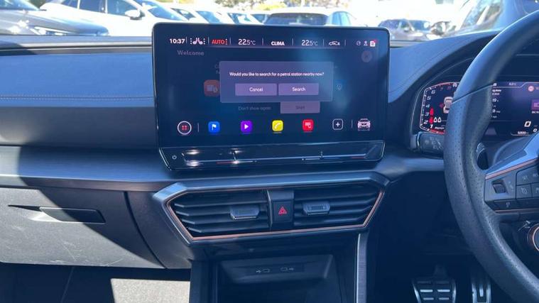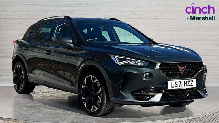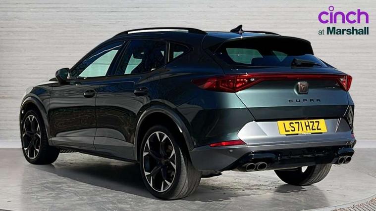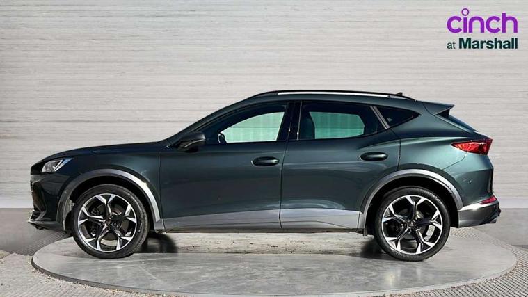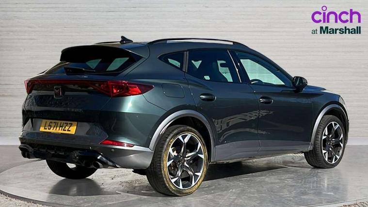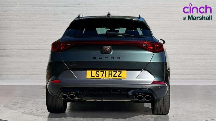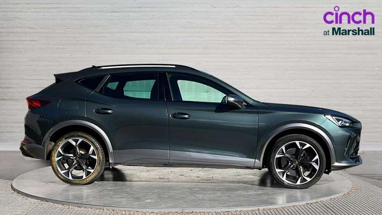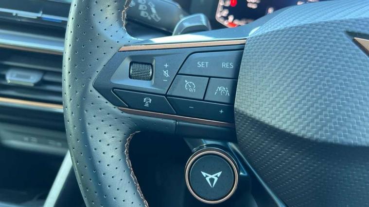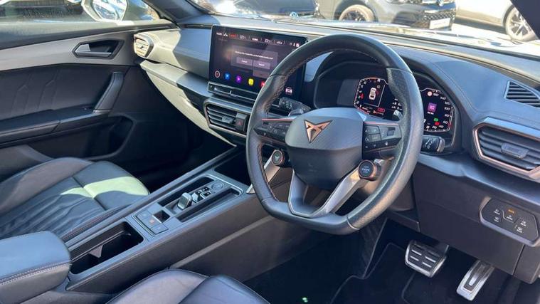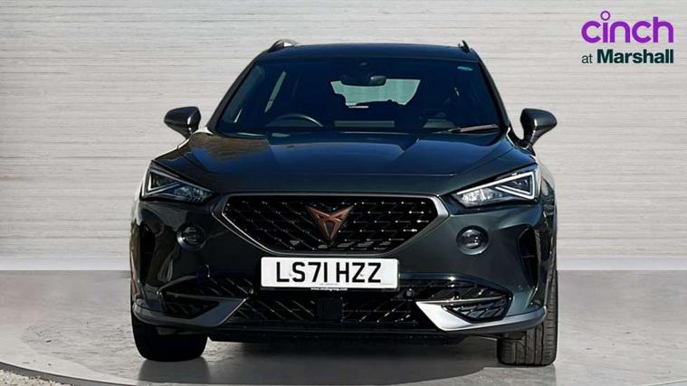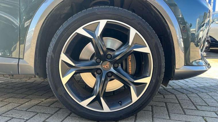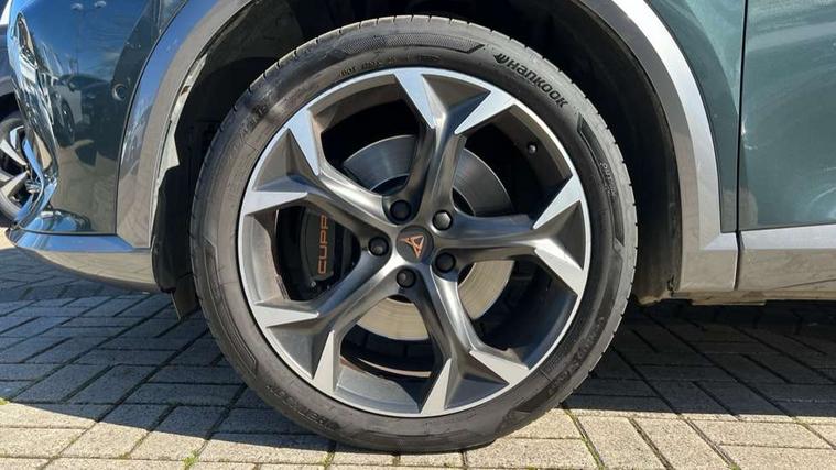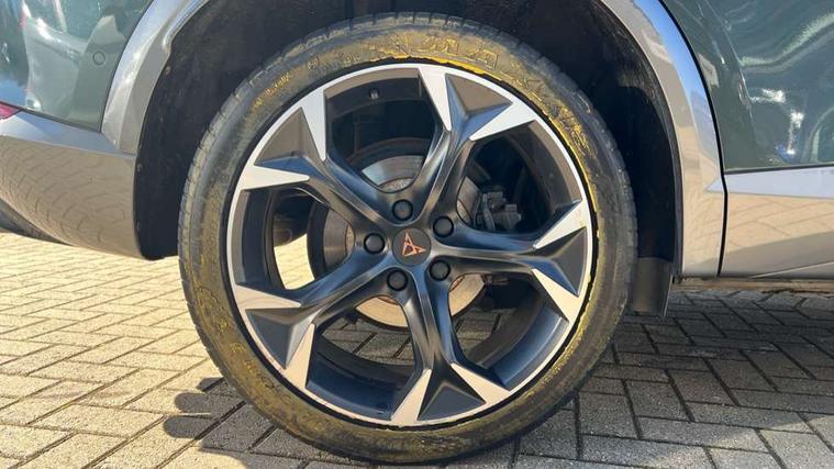 Digital cockpit and configurable dashboard, Driver alert system, Dynamic chassis control with driving profile selection (Comfort, Sport, CUPRA, Individual), Forward collision warning with automatic braking, Lane assist, Park assist (inc front/rear parking sensors), Predictive adaptive cruise control with speed limiter, RPM, trip computer, outside temp gauge, instrument light brightness, low fuel warning light, lights on reminder, gearshift indicator, Service interval indicator, Speed sensitive power steering, Start/stop system with regenerative braking, Virtual pedal and electric tailgate, Wireless apple carplay, Wireless phone charger, Electronic locking differential and dynamic traction support, Sports suspension with front shock absoption, 2 front and 2 rear USB type C sockets, Auxiliary input socket, DAB radio, Auto dimming rear view mirror, Body colour door handles, Body coloured bumpers, Dark grey wing mirror, Daytime running light with automatic headlight control and coming home feature, Dynamic headlight range control, Electric front/rear windows, Electrically adjustable heated and folding door mirrors with memory function, Front fog lamps with cornering function, Gloss black roof rails and window surrounds, LED Headlights, LED Taillights with dynamic indicator, Rain sensing wipers, Rear diffuser with twin exhaust pipe on each side, Rear wash/wipe, Sports bumpers, Tinted rear windows, Welcome lights, 12v power supply in centre console, 12V socket, 12v socket in loadspace, 2 front and 2 rear reading lights, 230V socket, 60/40 split rear bench seat with armrest and mechanical seat release, Black headlining, Cupra sports pedals, Dust/pollen filter, Front and rear head restraints, Front centre armrest, Height/reach adjust steering wheel, Illuminated interior front door sills, Illuminated sunvisor with mirror, Isofix, Leather heated multi-function sports steering wheel with start stop, CUPRA mode button and gear shift paddles, Luggage tie-down hooks, Three zone climate control with control panel in rear, Variable luggage/load compartment floor, Wraparound lighting, Genuine Nappa leather Pack - Cupra, Navigation system pack - Formentor, Safety and driving pack (XL) - Formentor, 3 point seatbelts on all rear seats, ABS, Brake control system - ESC and brake booster, Child proof door locks, Driver and front passenger airbags with front passenger airbag de-activation, Electronic parking brake, Front and rear disc brakes, Front side curtain airbags, Hill hold control, Seat belt reminder for front and rear seats, Tyre pressure monitoring system, Anti theft alarm system, Keyless entry and start system (KESSY), Locking wheel bolts, Copper and aluminium interior detailing, 19" 'Exclusive' machined sport matte black and silver alloy wheels, Space saver spare wheel,