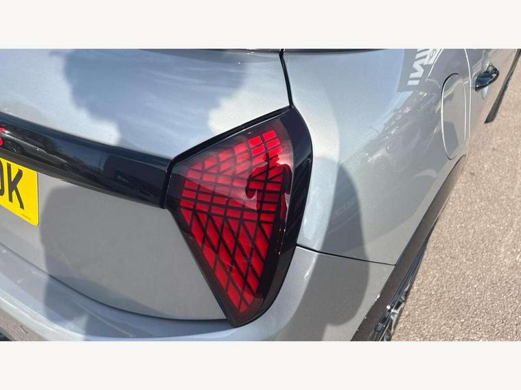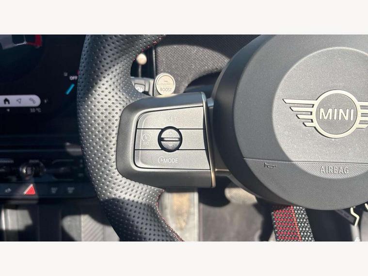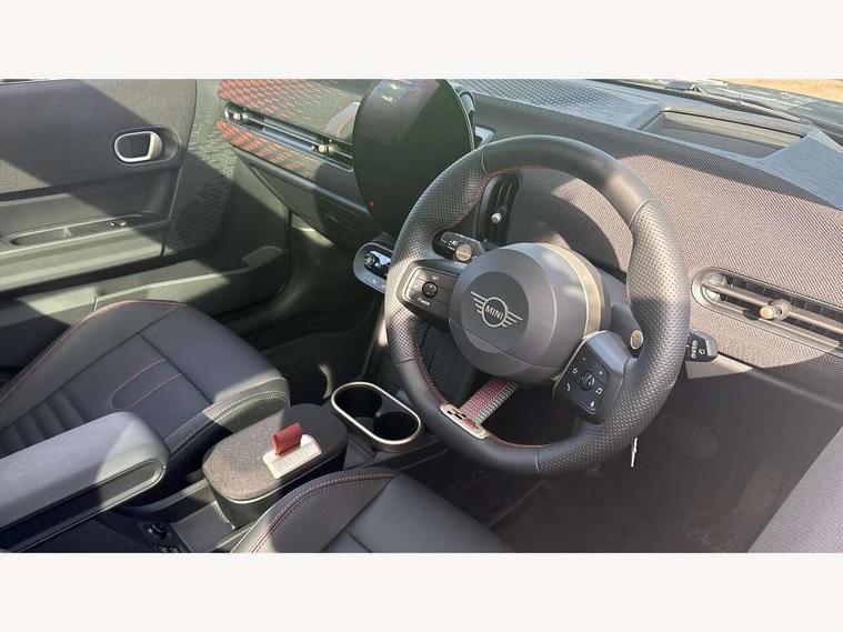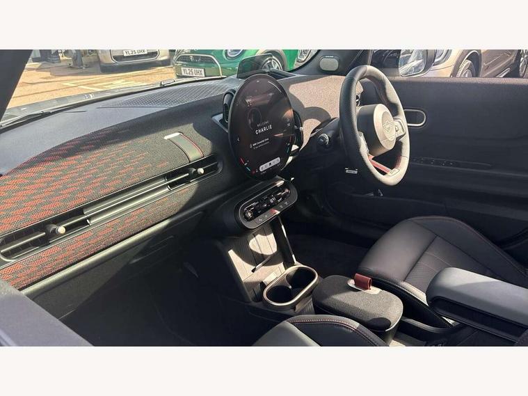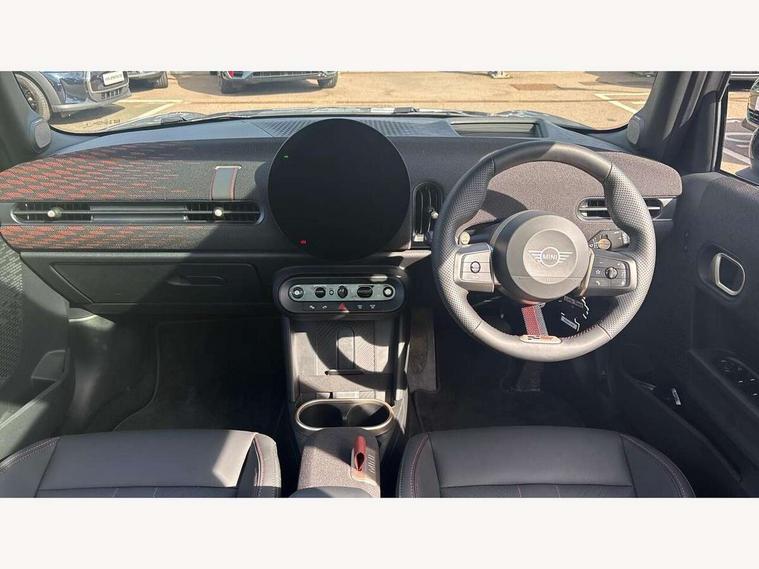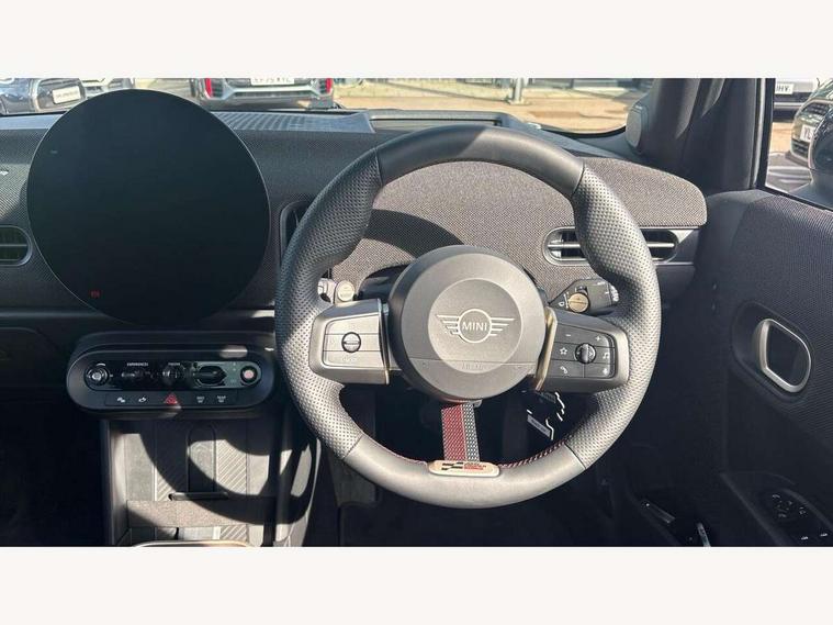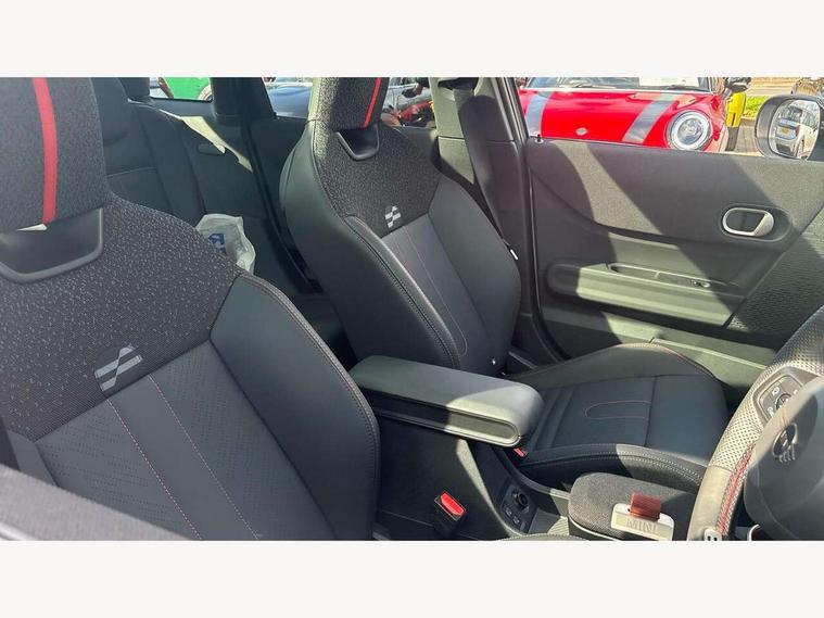 Central toggle bar, Circular OLED Screen, Compatible mobile phone bluetooth with audio streaming, Cruise control, Digital instrument cluster, Electro-mechanical speed dependant steering assistance, Emergency call service, Gaming controller with intelligent personal assistant voice update, MINI Experience Modes, Mini navigation system, On board computer, Service interval indicator, Tailgate, 7 speed sport transmission with double clutch, Adaptive suspension, DAB Digital radio, Front USB charger, Personal eSim, Rear USB charger, Adaptable light signatures, Auto headlights, Electric adjustable heated door mirrors, Electric front+rear windows, Front and rear apron, Heated rear window, Heated windscreen washer jets, High gloss hexagonal patterned grille surround, Jet black mirror caps, LED 3rd brake light, LED daytime running lights, LED indicator lights, LED rear lights, Rain sensor window wipers, Rear fog lights, Rear roof spoiler with airblades, Rear side wing doors, Rear window wiper, 2 zone automatic air conditioning, 3 seat bench in 2nd row, 60/40 rear seat bench, Ambient lighting, Black lower band in high gloss, Cupholders, Dark headliner, Floor mats, Front and rear head restraints, Front compact armrest, Heated steering wheel, Height adjustable passenger seat, Lidded storage box in Black/Red knit, Luggage compartment lighting, Partially perforated vescin steering wheel with red accent, black/red decorative strap, Single front passenger seat, Steering wheel paddle shift, Sunvisors with vanity mirrors, Driving assistant pack - Cooper Hatchback, Level 1 pack - Mini Hatchback, Park assistant pack - Cooper Hatchback, 3 point seatbelts on all five seats, 6 Airbags - front, side, head and seat belt tensioners, Anti-lock braking system (ABS), Brake caliper in Black with JCW badge, Child locks on rear doors, DSC - Dynamic Stability Control, Electronic parking brake, Front and rear disc brakes, Front ISOFIX (iSize), Front passenger airbag deactivation, JCW Sport Brakes, Traction control, Tyre pressure monitoring system, Alarm, Immobiliser, Remote central locking, Black/Red decorative dash strap, Tyre repair kit,