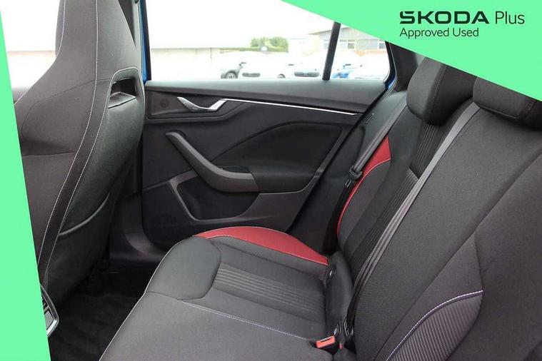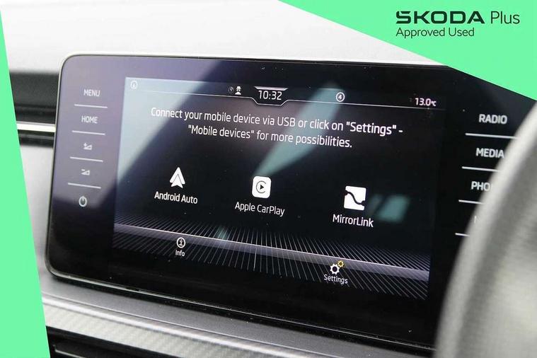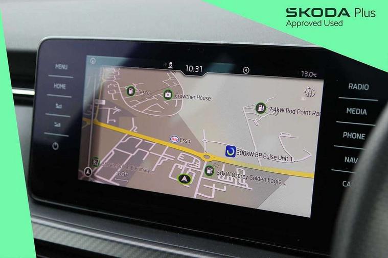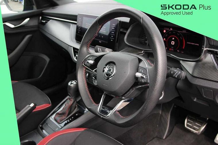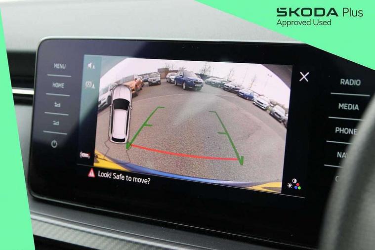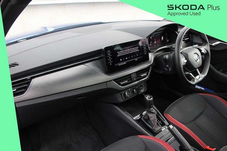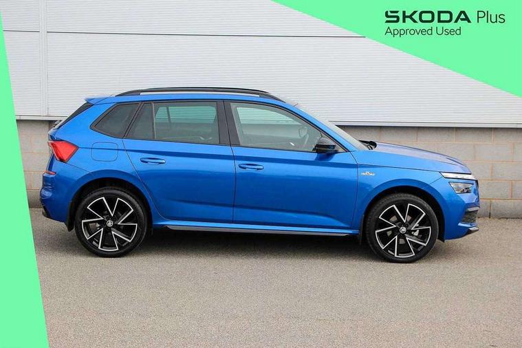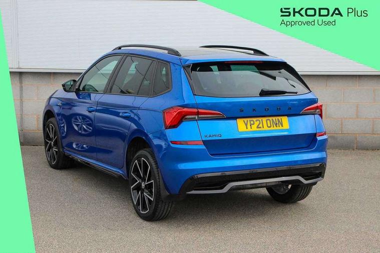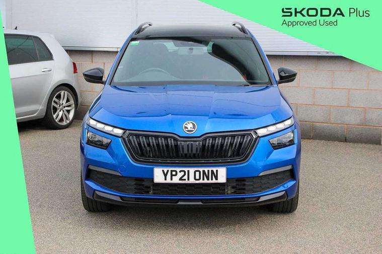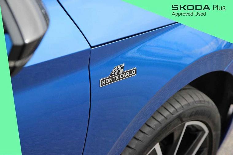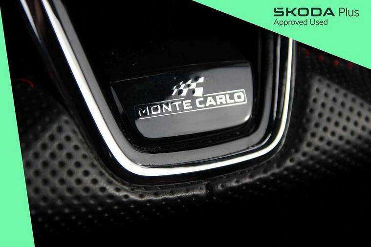 Amundsen satellite navigation with 9.2" touchscreen display, voice control, virtual cockpit and web radio, Bluetooth system, E-call, Front assist system, Lane assist, PAS, Service indicator, Speed limiter, Trip computer, Virtual cockpit with 10.25" display, Wireless SmartLink for apple car play, android auto and mirrorlink, 2 USB - C ports with 1x adaptor cable, Auxiliary input socket, DAB Digital radio, Auto dimming rear view mirror, Black door mirrors, Black radiator grille, Black rear diffuser, Body colour bumpers, Body colour roof spoiler, Boot lettering in black, Chrome grille surround, Electrically adjustable and heated door mirrors, Front and rear electric windows, Front sport bumper, Full LED headlights with adaptive front light system, dynamic indicators, cornering function and fog lights, Headlight range control, Heated rear window, High functionality rear led lights with dynamic indicators, KAMIQ Door sills, Monte carlo plaque, Panoramic sunroof with black roof rails, Privacy glass, Rear fog lights, Rear wiper, 12V Accessory socket in centre console, Aluminium pedals, Black ceiling for black/beige interior, Chrome inner door handles, Cloth upholstery, Front gesture control, Front head restraints, Glove compartment with illumination, Height adjustable passenger seat, Ice scraper, Isofix child seat fittings on outer rear seats, ISOFIX on front passenger seat, Leather gear lever, Manual lumbar support for front seats, Rake/reach adjustable steering wheel, Reading lights for driver and front passenger, Sports seats, Sun visor with make up mirror for front passenger, Textile floor mats, Third rear headrest, Top tether for front passenger seat, Umbrella in driver's door, 3x3 point rear seatbelts, Airbags - driver and front passenger, ESP, Front passenger airbag deactivation switch, Front side airbags with curtain airbags, Hill hold control, Manual parking brake, One tone horn, Rear disc brakes, Seatbelt reminder for driver an co-driver, Traction control, Tyre pressure monitor, Alarm with interior monitoring, back up horn and tilt sensor with safe function and towing protection, Anti-theft wheel bolts, Immobiliser, Remote central locking with SAFE system, Chrome air vent surrounds, 18" Vega alloy wheels in black,