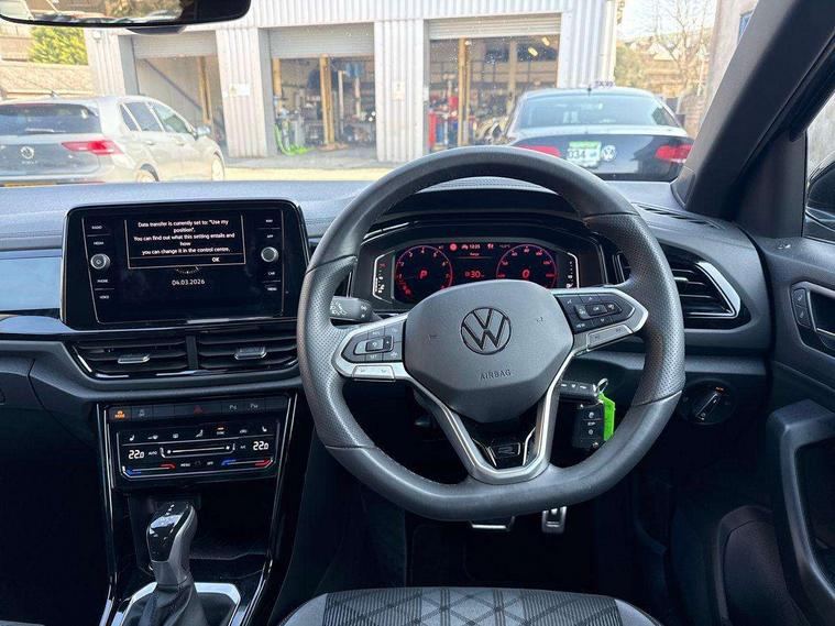 10.25" Digital cockpit pro, Advanced driver attention and drowsiness monitor, Emergency call service, Lane keeping system Lane Assist, Mobile phone interface, Modified key software - reduce switch off time for key status change to Long no motion, Online services, Park assist including front and rear parking sensors, Service interval indicator, Tailgate/trunk lid release from outside, Think blue trainer driver tips and journey analysis, Warning sound and light for front seatbelts unfastened, Wireless app connect, Battery regeneration during braking, Start/stop function with battery regeneration, DAB Digital radio, Diversity antenna for FM reception, Front and rear 6 speakers, Music playback - MP3, WMA and AAC files, Premium USB cable in choice of either Apple or Android smartphone compatibility, SD card slot, Simultaneous pairing of 2 compatible mobile devices, Title and cover art display, We Connect and We Connect Plus functionality, Auto dimming interior rear view mirror, Automatic hazard lights activation under emergency braking, Automatic headlight control with LED separate daytime running lights with coming/leaving home function, Body coloured exterior mirror housings and door handles, Electrically adjustable and heated door mirrors, Extended roof spoiler, Exterior mirrors aspherical on driver side, convex on front passenger side, External USB type C socket and charging sockets, Front windscreen wiper with intermittent wipe and 4 position delay, Heated rear window, LED 3rd brake light, LED rear combination lamps, LED rear number plate lights, Power windows with comfort operation and circuit breaker, Privacy glass for rear side windows and rear window, R-Line design body coloured bumpers, Rain sensor, Rear exhaust tailpipe, Rear fog light on one side and reversing lights on both sides, Rear side wing doors, Rear wash/wipe with intermittent wipe setting, Remote electrically foldable door mirrors, puddle lights and reverse activated passenger's door mirror, 12V power socket in centre console, 3 rear head restraints, 3 seat bench in 2nd row, 4 load lashing points in luggage compartment, Air care climatronic air conditoning system with active combination filter and 2-zone temperature control, Black roof lining, Chrome plated decorative trims, Chrome plated radiator grille inserts, air vent surrounds and light switch surrounds, Door and side trim panel with leatherette insert, Front + rear carpet mats, Front centre armrest, Front cupholders x 2, Front footwell illumination, Front reading light, Front scuff plates with R Line logo, Front seat back storage pockets, Glove compartment door with light, Instrument lighting, white adjustable panel illumination, Interior ambient lighting and surround lighting, Interior light delay, Isofix child seat preparation, Leather gearshift handle, Load-through provision with cup holder when folded down ('Unsplit rear seat bench, split folding backrest, with centre armrest), Luggage compartment lighting, Single front passenger seat, Stainless steel pedals, Storage compartment in left and right luggage area, Storage compartment in rear doors, Storage compartments in driver and front passenger doors, Sunvisors with illuminated vanity mirrors, Variable boot floor, height adjustable and removable, Driver assistance pack without proactive passenger protection - T-Roc, 3 point height adj front seatbelts + pretensioners, 3 point seatbelts in outer rear with ECE label, ABS, Child locks on rear doors, City emergency braking and pedestrian monitoring, Driver and front passenger airbag with front passenger airbag deactivation, Driver and front passenger safety-optimised head restraints, Drivers seatbelt reminder, Electronic parking brake, Electronic Stability Control (ESC) inc EDL (Electronic Differential Lock) and ASR (Traction Control), Front and rear passengers curtain airbag system including front side airbags, Hill start assist, Predictive pedestrian protection, Rear disc brakes, Two tone horn, Tyre pressure loss indicator, Volkswagen roadside assistance, Piano black decorative inserts in dashboard and front door trim panels, Trims for alloy wheels,