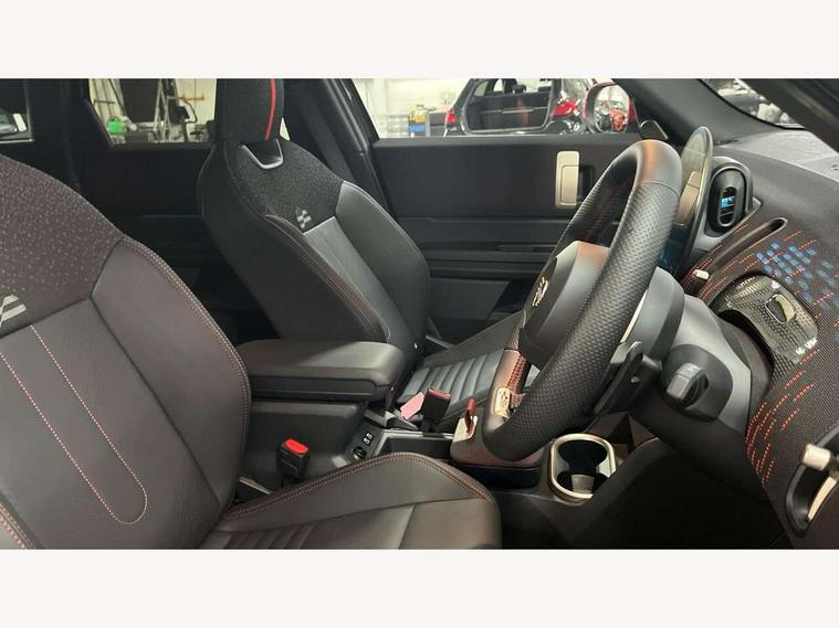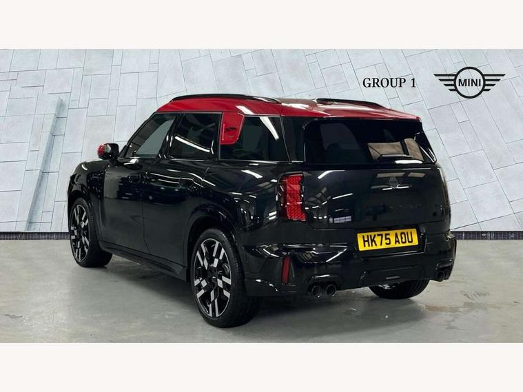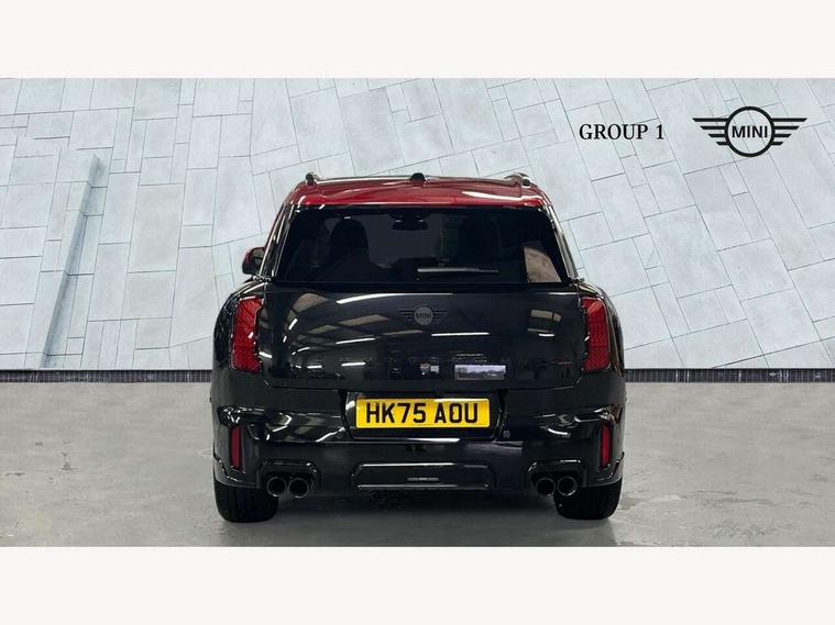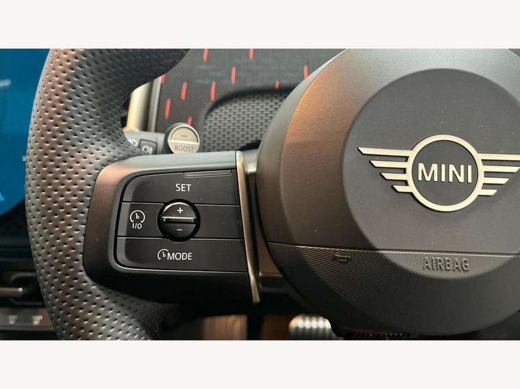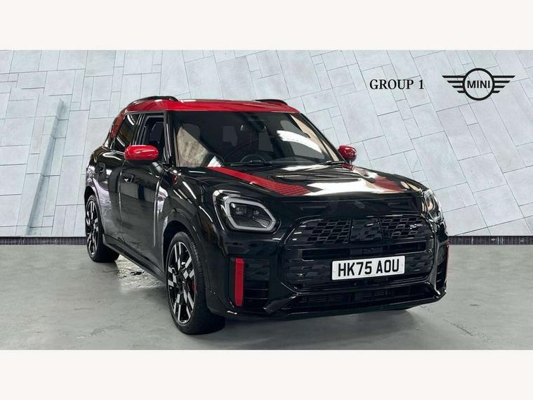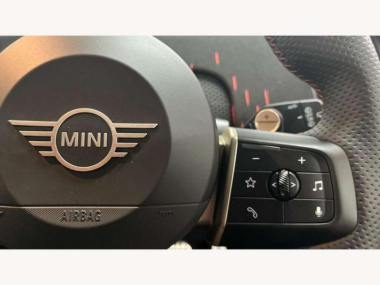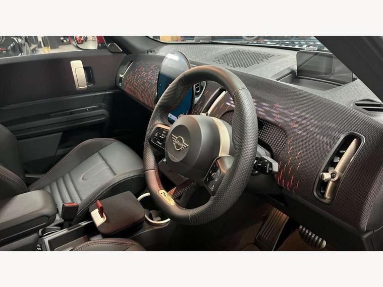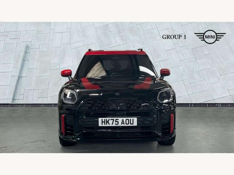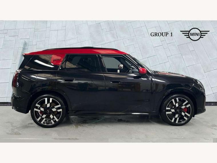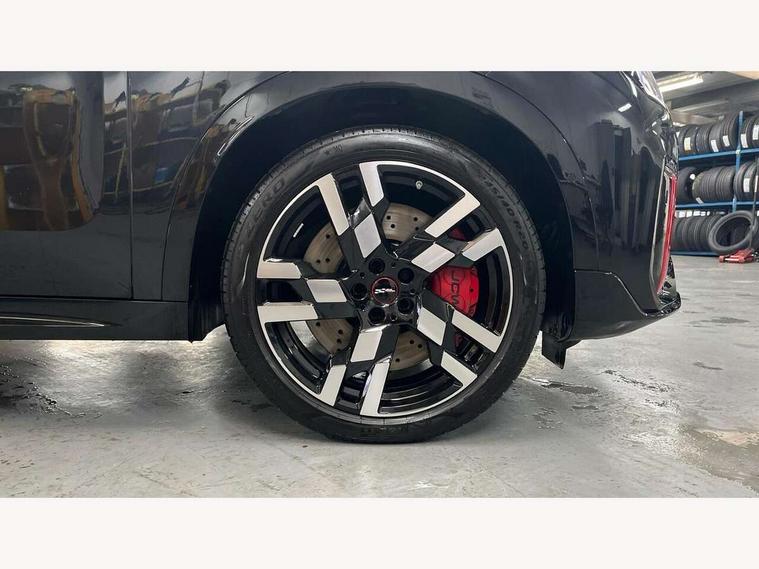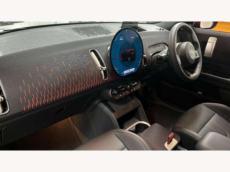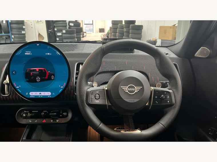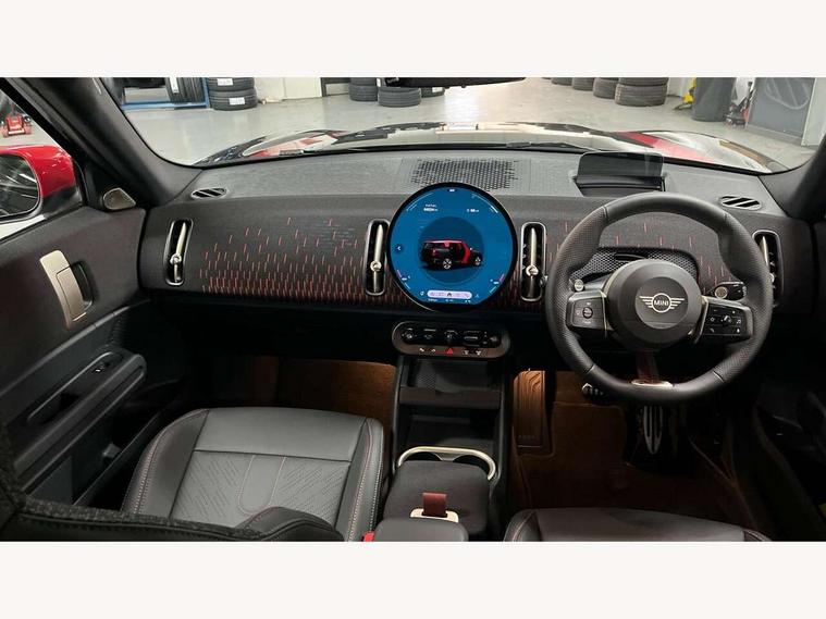 Bluetooth connection, Circular OLED Screen, Compatible mobile phone bluetooth with audio streaming, Cruise Control (DCC), Digital dashboard display, Driving assistant, Driving Assistant Plus Preparation, E-call, Electro-mechanical speed dependant steering assistance, MINI Experience Modes, MINI Head up display, Mini navigation system, MINI TeleServices, Parking assistant in camera and ultrasound based assistance system, rear view camera, parking aid and distance control, Adaptive suspension, Double clutch sports transmission, Larger capacity fuel tank, Quad exhaust system, DAB Digital radio, Harman Kardon surround sound system, Personal eSim, Auto tailgate, Electric adjustable heated door mirrors, Front and rear apron, Front and rear electric windows, Heated rear window, High beam assistant, High gloss hexagonal patterned grille surround, Interior rear-view mirror with automatic anti-dazzle function, LED daytime running lights, LED headlights with extended contents including Adaptable light signatures, LED rear lights, LED third brake light, Rain sensor with auto headlights, Rear roof spoiler with airblades, Rear side wing doors, Rear window wiper, Roof rails, 3 seat bench in 2nd row, 60/40 split rear bench seat, Anthracite headliner, Auto air conditioning, Driver and front passenger seat heating, Floor mats, Front armrest, Front headrests, Heated steering wheel, Height and length steering column adjustment, JCW Front sports seats, Lidded storage box in Black/Red knit, Luggage compartment separating net, Perforated Vescin steering wheel, Rear headrests, Seat adjustment for rear seats, Single front passenger seat, Sunvisors with vanity mirrors, Wireless charging tray, Interior and exterior mirror package - Mini Countryman, 3x3 point rear seat belts, 6 Airbags - front, side, head and seat belt tensioners, ABS, DSC - Dynamic Stability Control, Electronic handbrake, Electronic Stability Programme (ESP), Front ISOFIX (iSize), Hill descent control, Hill hold assist, Hill start assist, JCW logo in brake calipers, JCW Sport brakes with Chilli Red calipers, Manual rear child locks, Traction control, Tyre pressure monitoring system, Warning triangle, Alarm system with tilt sensor, monitoring doors, bonnet interior and tailgate, Auto drive away locking, Comfort access system, Deadlocking function, Electronic vehicle immobiliser, Locking wheel bolts, Remote control locking, Start/stop toggle with keyless go, 19" JCW Runway Spoke Black alloy wheels, Tyre repair kit plus,
