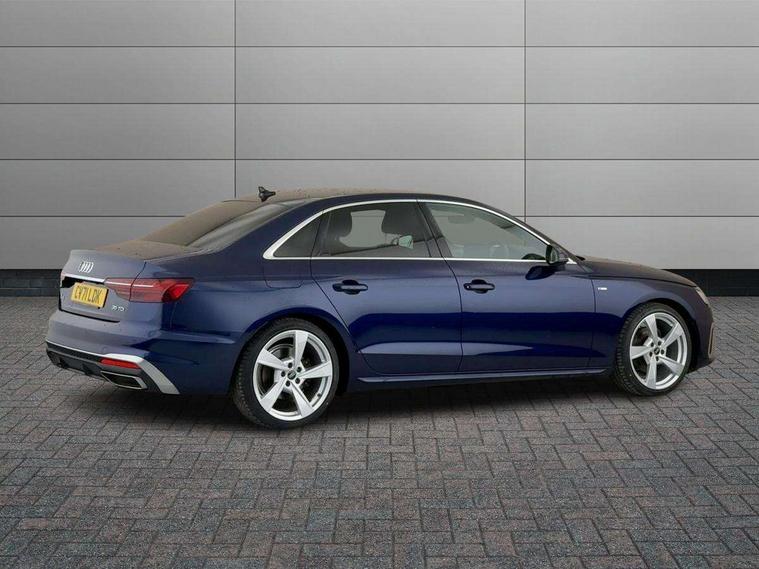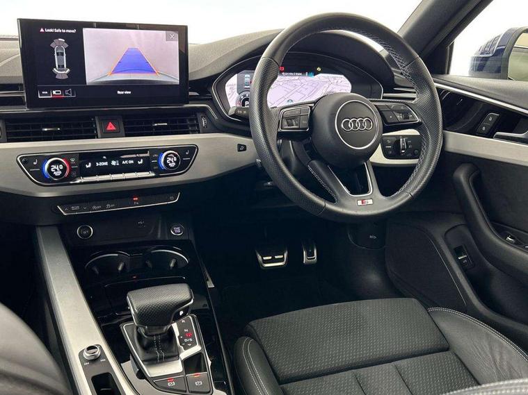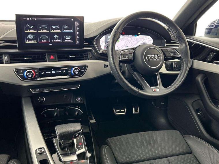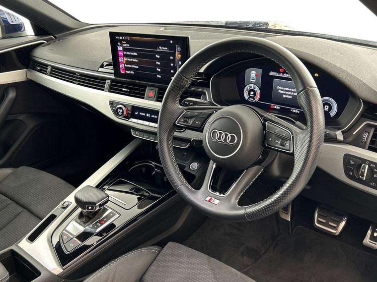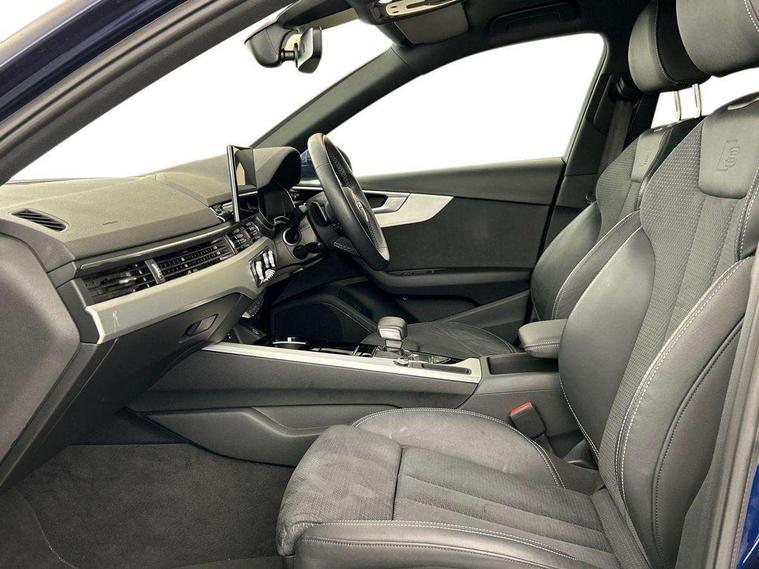 Audi connect safety and service (e-call), Audi connect with Amazon Alexa Integration, Audi drive select, Audi parking system plus with front and rear sensors, Audi smartphone interface, Audi virtual cockpit, Automatic start-stop system with coasting functionality and efficiency programme, Bluetooth interface, Electric boot lid release, Electromechanical power steering, Email, calendar and text messages displayed via MMI, MMI Navigation plus with MMI touch includes 10.1" high resolution colour MMI display, 3D map, Rear view camera, Voice control system, Sports suspension lowered by 23mm, 2 USB charging ports, 8 passive loudspeakers, DAB digital radio reception, Auto dimming rear view mirror, Body colour door handles, Body colour front spoiler lip, Body colour side sill trim, Body coloured door mirrors, Electrically folding auto dimming/adjustable/heated door mirrors with LED side indicators and kerb view function for passenger side, Grained matt black side air inlets with matt aluminium silver inlay, High beam assistant, Honeycomb structure radiator grille in grained matt black, LED headlights with LED rear lights + dynamic rear indicators + headlight adjustment and high beam, turning light + LED daytime running lights, Matt aluminium silver tailpipe trim, Privacy glass, Rain and light sensors, S Line badges on the front wings, S line front and rear bumpers with side skirts, S Line rear diffuser in matt titanium black with trim strip in matt aluminium silver, Windscreen with acoustic glazing, 4 way electric lumbar support for driver and front passenger, 40/20/40 split folding 3 rear seat bench in 3 parts with rear centre armrest, Black cloth headlining, Black perforated leather gearknob, Contrast stitching on seats, steering wheel and gear lever gaiter, Deluxe 3 zone electronic climate control, Door sill trims with aluminium inlay, Front and rear head restraints, Front centre armrest, Heated front seats, Illuminated door sill trims with S logo, ISOFIX child seat mounting and top tether, Manual seat adjustment, Stainless steel pedals and foot rest, High gloss package - A4, LED Interior light pack - A4/S4, 3 rear seatbelts, 6 airbags - Driver, front passenger, curtain and side windows, Electronic Stabilisation Control (ESC) including ABS, ASR and EDL, Hill hold assist, Multi collision brake assist, Pop-up bonnet for pedestrian protection, Pre sense city, Seatbelt monitoring, Warning triangle and first aid kit, Anti theft alarm, Anti theft wheel bolts, Keyless Go, Matt brushed aluminium inlays, Tool kit, Tyre repair kit,
