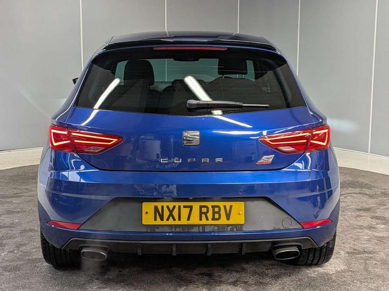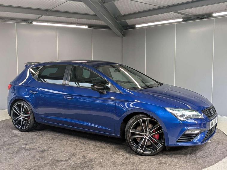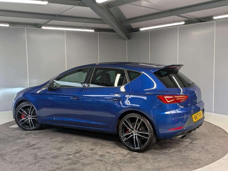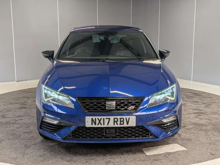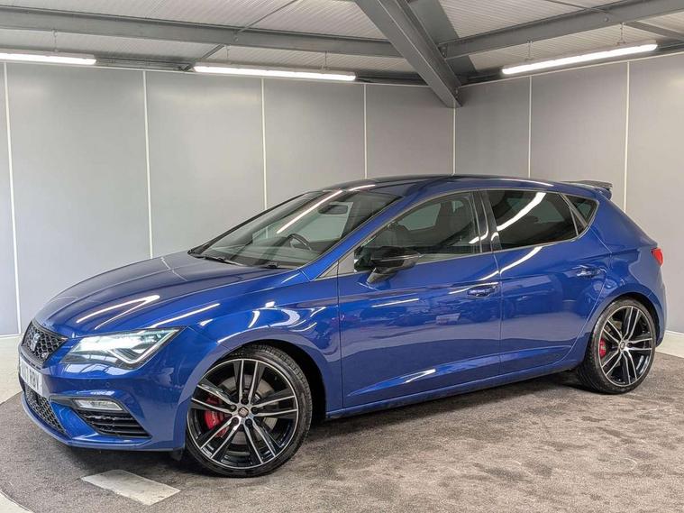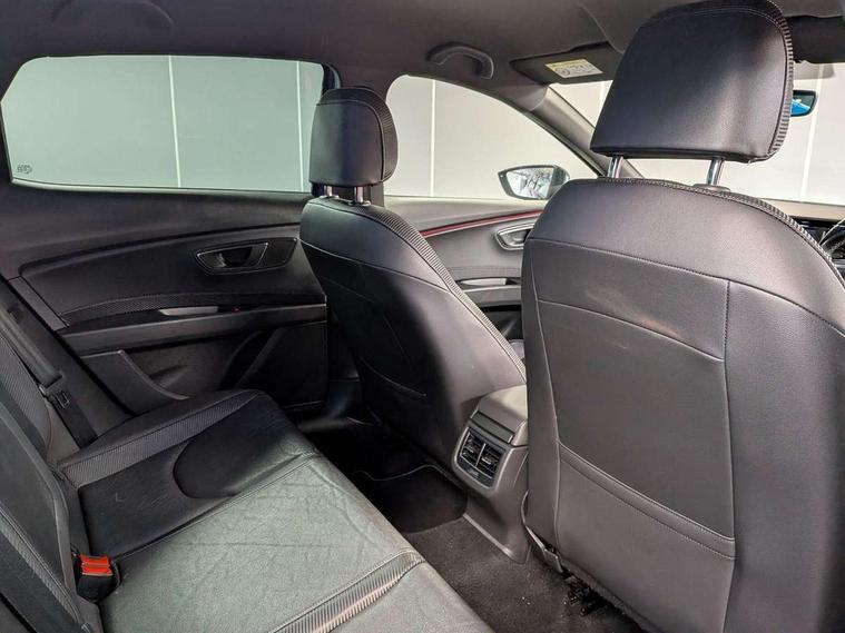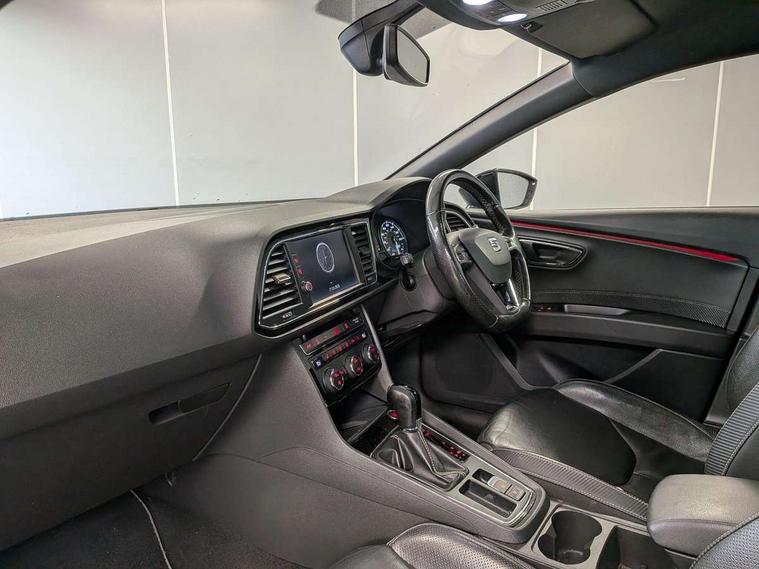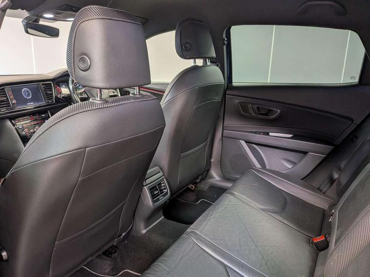 'Lights On' Reminder warning buzzer, 8" touch screen, Bluetooth Handsfree Phone Connection, Front parking sensors, Full Link App interface, Low fuel warning light, Outside temperature gauge, Progressive power assisted steering, Rear parking sensors, Remote fuel flap release, SEAT Drive profile, SEAT logo boot release, Service interval indicator, Touch screen display, Trip computer, Voice control system, Dynamic chassis control, Electronic limited slip differential, 2 USB ports, 2x SD card slot, Auxiliary input socket, Bluetooth audio streaming, DAB Digital radio, Radio/CD + MP3, Steering wheel mounted audio/phone controls, Aluminium front door sills, Black bodyside mouldings, Body colour door handles, Body coloured bumpers, Dark tinted rear windows, Electric adjustable/heated/folding door mirrors, Electric front/rear windows with one touch/auto up/down, Electric headlamp adjustment, Gloss black door mirrors, High gloss black finish B and C pillars, High gloss black front grille surround, LED indicators in door mirrors, Rear wash/wipe, Reverse activated kerb-view adjustment on passenger's door mirror, Twin exhaust pipes, 12v power point in centre console, 3 height adjustable rear headrests, 60/40 split folding rear seat, Active head restraints, Additional heating and ventilation outlet in rear of centre console, Aluminium pedals, Ambient lighting, Black roof lining, Boot net, Driver seat height adjust, Driver seat lumbar adjustment, Driver/passenger sunvisors with illuminated vanity mirrors, Dual zone climate control, Dust/pollen filter, Front adjustable head restraints, Front armrest with storage box, Front cupholders x 2, Front seat and rear pockets, Front sports seats, Front/rear floor mats, Height/reach adjust steering wheel, Illuminated glovebox, Illuminated rear centre console, Instrument lighting with brightness control, Leather handbrake, LED reading lights, Luggage tie-down hooks, Passenger seat height adjuster, Passenger seat lumbar adjust, Perforated leather steering wheel with white stitching + gear knob, Rear armrest, Rear top tether child seat ISOFIX attachment, Steering wheel gearshift paddles, Storage boxes under front seats, Full LED headlight pack - Leon, 3 point seatbelts on all rear seats, ABS + traction control, Child proof door locks, Collision mitigation braking system, Curtain airbags, Driver/Front Passenger airbags, Drivers knee airbag, Electronic parking brake with auto hold, ESP+EBA, Front seatbelt pretensioners, Front Seatbelt warning, Front side airbags, Hill hold control, Manual passenger airbag deactivation function, Red brake calipers, Tyre pressure monitoring system, 2 folding remote keys with window open/close function, Engine immobiliser, Locking wheel bolts, Remote central locking + deadlocks, Volumetric alarm with back up horn, Gloss black interior trim, 19" Cupra Machined alloy wheels 30/2, Space saver spare wheel,