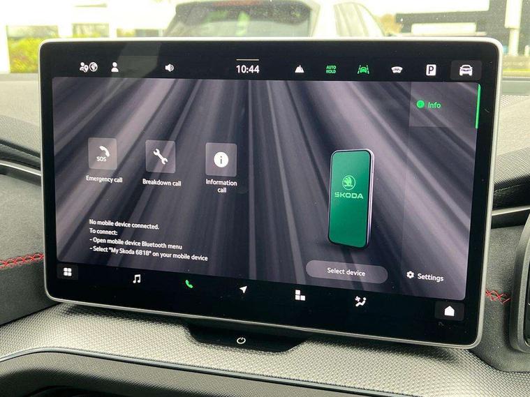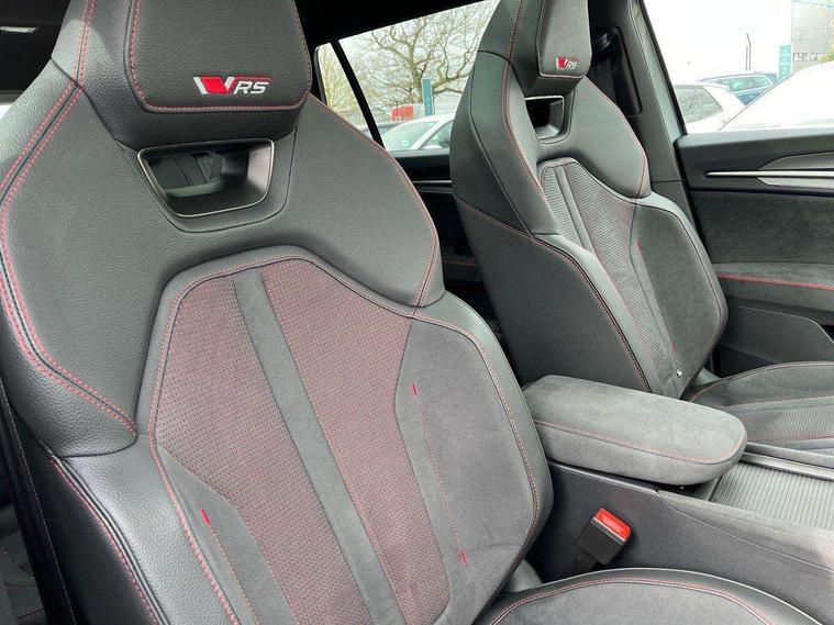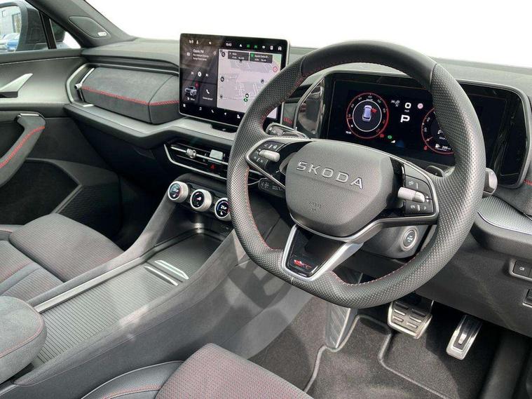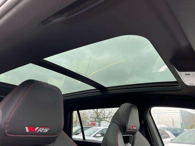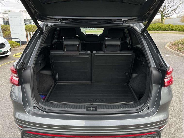 13" satellite navigation touchscreen display, Blind spot detection with door exit warning, Bluetooth system, ChatGPT functionality, Driver alert - Fatigue and drowsiness monitor, Dry display cleaner, Emergency call, Front and rear parking sensors, Front cross traffic assist, Lane assist, Off road modes, PAS, Rear traffic assist, Tailgate unlocking from outside, Traffic sign recognition, USB C Port x 2 in front centre console, Virtual Cockpit - 10.25" digital display, Voice control system, Wireless charging for two smartphones (15W) with cooling function, Wireless SmartLink for Apple CarPlay and Android Auto, Stop/start function, 2x USB-C in the rear, DAB Digital radio, Dynamic sound booster, Aero front windscreen wipers with intermittent function, Auto dimming rear view mirror, AWL (all weather lighting) and all weather light with cornering function, Black roof rails, Black vRS styling including front grille surround and upper part of window surround, Black wheel arch surrounds, Body colour door handles, Cornering light and poor weather light, Electric folding /adjustable/separted heated/folding door mirrors, auto dimming with boarding sports and memory function, Electric front and rear windows, Exterior black decorative trims, Front grille with horizontal light strip, Gloss black door mirrors, Gloss black window frame and D pillar, Heat insulating glass in windshield, Heated rear window, Ice scraper in fuel tank cap, LED daytime running lights, LED matrix headlights with AFS and LED fog lights, LED rear light with welcome effect and dynamic turn signals, LED third brake light in rear spoiler, Light assistant with automatic headlight control and coming home feature, Logo projection in door mirrors, Multiple matrix beam, Privacy glass, Rear roof spoiler, Rear side wing doors, Rear window wiper, Red decorative strip between rear LED lights, Safety reflectors on front and rear doors, Tailgate lettering in Black, Unique dark chrome design logo on alloy wheels, vRS badging on front grille and tailgate, vRS front and rear bumpers, vRS rear diffuser and visible tailpipe in stainless steel, Window control switches with black trim, Windscreen wipers with rain sensor, Without engine designation, 1.5l bottle holder points in all door, 1x centre rear reading light, 2 seat bench in 3rd row, 3 configurable smart dials with 32mm coloured display, 3 seat bench in 2nd row, 3 spoke multi-function leather heated sports steering wheel with vRS logo and paddles, 4 foldable roof handles with rear coat hooks, Aluminium pedals, Ambient interior lighting - Dashboard, front-door stowage compartments, front and rear door panels and footwell lighting, Automatic gear selector on steering column, Chrome interior door handles, Driver/front passenger reading lights, Fabric headlining, Fixed bench 40:60:40 split folding backrests, Front and rear floor mats, Front centre armrest with jumbo box storage compartment, cup holder and 12V socket, Front sport seats, Height adjustable front headrests, Interior black decorative trims, Isofix child seat fittings in outer middle row rear seats and front passenger with top tether, Manually adjustable steering column, Pollen filter, Rear centre armrest with cupholders, Rear seat boot backrest release, Single front passenger seat, Skoda lettering on steering wheel, Storage pocket including mobile phone pockets on the backs of the front seats, Sunvisors with illuminated vanity mirrors, Three rear height adjustable headrests, Ticket holder on A Pillar, Tri zone climate control, Umbrella in door panel x1 made from sustainable materials, Upper and lower glovebox with card holder and coin compartment, USB C port by rear view mirror for charging only (15W), Acoustic package - Kodiaq, Convenience plus pack - Kodiaq SE L/Sport Line/vRS, Performance package - Kodiaq vRS, Simply clever cargo package - Kodiaq, Auto door release and activation of warning lights in the event of an accident, Driver and front passenger airbag with knee airbag and front passenger airbag deactivation, Electric child locks, Electronic parking brake, ESC (incl. ABS+EMD+MSR+ASR+EDL+HBA+DSR+RBS+ESBS+MCB+TSA+XDS), Front assist with braking reaction to vehicles, pedestrians and cyclists, Front disc brakes, Fuel cut off safety device, Height adjustable front 3 point seatbelts + pretensioners, Hill hold assist, Junction assist with automatic emergency braking, Rear disc brakes, Red brake calipers, Safety vest holder in door, Seat belt reminder for all seats, Three point rear seat belts, Two tone horn, Tyre pressure monitor, Alarm with interior monitoring and tilt sensor with safe function, Anti-theft wheel bolts, Immobiliser, Remote central locking with 2 keys, 20" Elias black polished alloy wheel,
