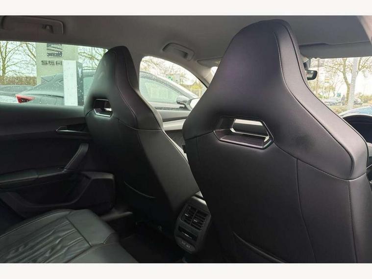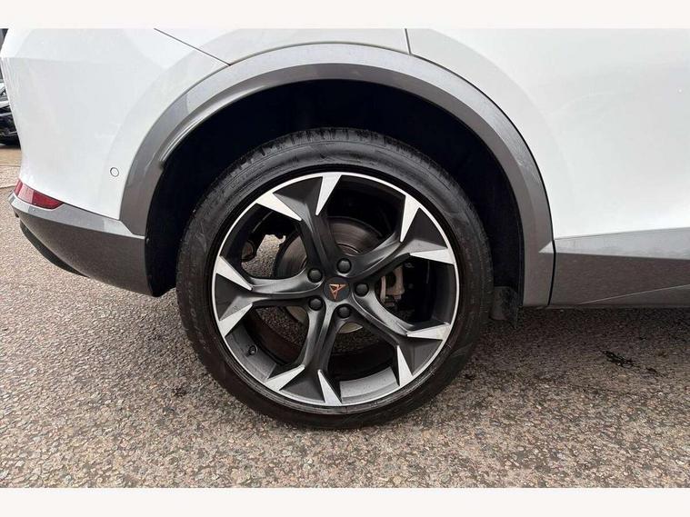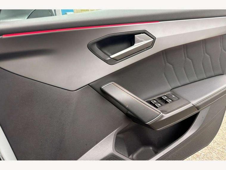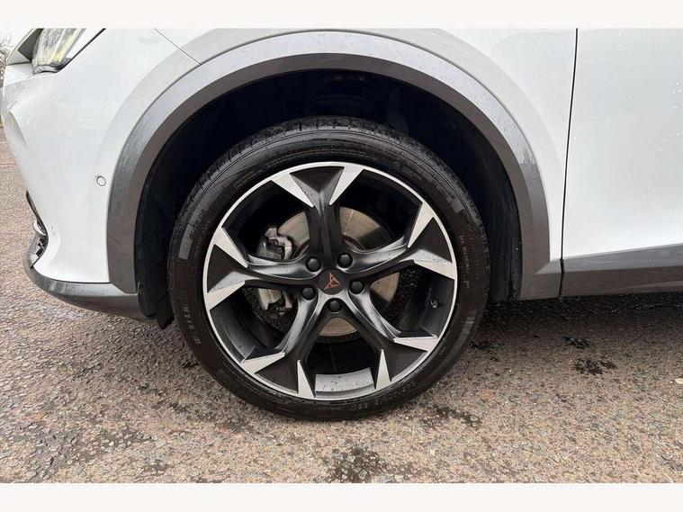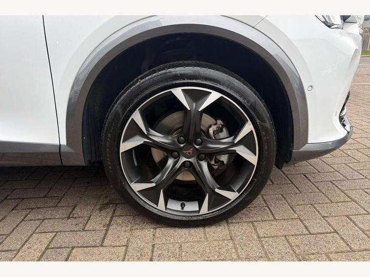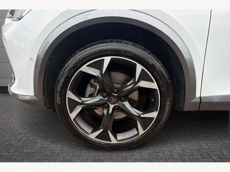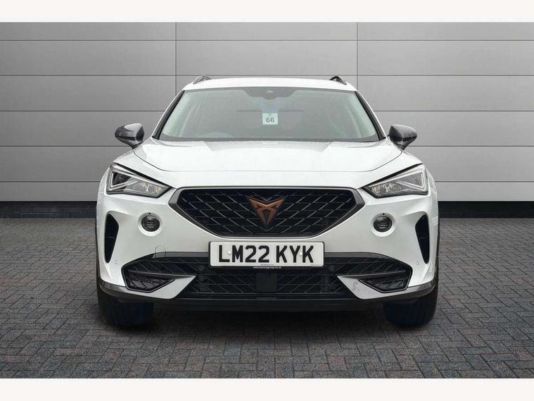 Digital cockpit and configurable dashboard, Driver alert system, Driving profile selection, E-call, Forward collision warning with automatic braking, Lane assist, Park assist (inc front/rear parking sensors), PAS, Predictive adaptive cruise control with speed limiter, Rear view camera, RPM, trip computer, outside temp gauge, instrument light brightness, low fuel warning light, lights on reminder, gearshift indicator, Service interval indicator, Start/stop system with regenerative braking, Wireless apple carplay, Wireless phone charger, Electronic locking differential and dynamic traction support, Standard suspension, 2 front and 2 rear USB type C sockets, Auxiliary input socket, DAB radio, Auto dimming rear view mirror, Body colour door handles, Body coloured bumpers, Dark grey wing mirror, Daytime running light with automatic headlight control and coming home feature, Dynamic headlight range control, Electric front/rear windows, Electrically adjustable heated and folding door mirrors with memory function, Front fog lamps with cornering function, Gloss black roof rails and window surrounds, LED Headlights, LED Taillights with dynamic indicator, Rain sensing wipers, Rear diffuser with black simulated exhaust pipes, Rear side wing doors, Rear wash/wipe, Third brake light, Tinted rear windows, Welcome lights, 12v power supply in centre console, 12V socket, 12v socket in loadspace, 2 front and 2 rear reading lights, 230V socket, 3 seat bench in 2nd row, 60/40 split rear bench seat with armrest and mechanical seat release, Dust/pollen filter, Front and rear head restraints, Front centre armrest, Height/reach adjust steering wheel, Illuminated interior front door sills, Illuminated sunvisor with mirror, Isofix, Leather multi function heated steering wheel with gear shift paddles, Luggage tie-down hooks, Single front passenger seat, Three zone climate control with control panel in rear, Variable luggage/load compartment floor, Wraparound lighting, Genuine Nappa leather Pack - Cupra, Navigation system pack with 10" navigation system - Formentor, 3 point seatbelts on all rear seats, ABS, Brake control system - ESC and brake booster, Child proof door locks, Driver and front passenger airbags with front passenger airbag de-activation, Electronic parking brake, Front and rear disc brakes, Front side curtain airbags, Hill hold control, Seat belt reminder for front and rear seats, Tyre pressure monitoring system, Anti theft alarm system, Keyless entry and start system (KESSY), Locking wheel bolts, Copper and aluminium interior detailing, 19" 'Exclusive' machined sport matte black and silver alloy wheels,