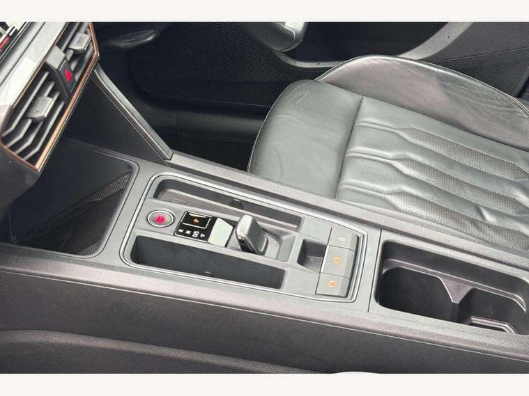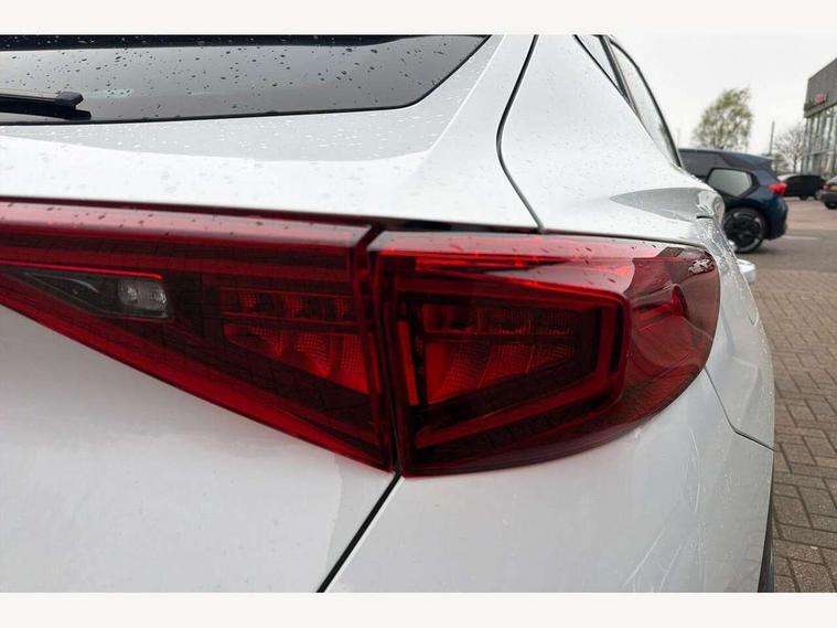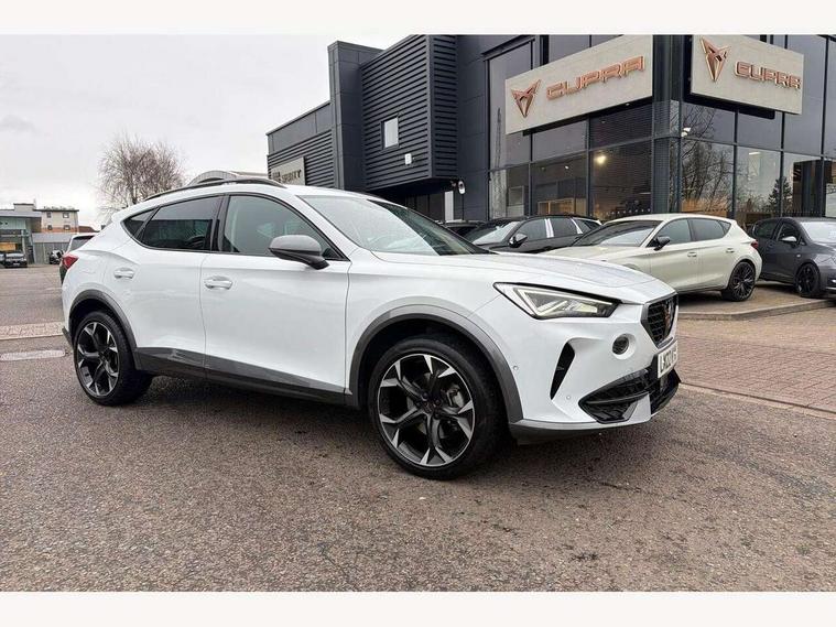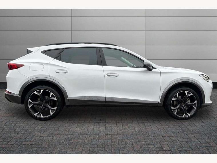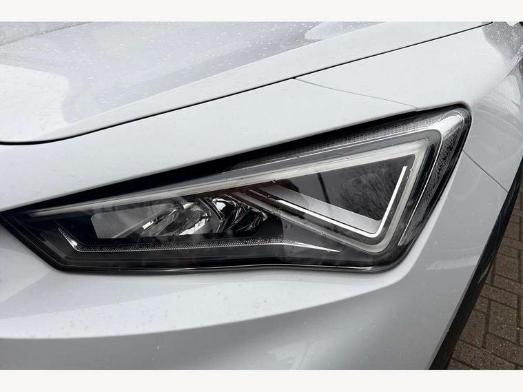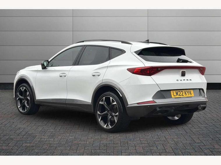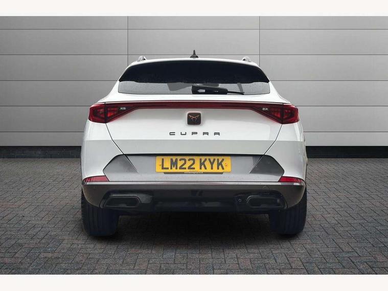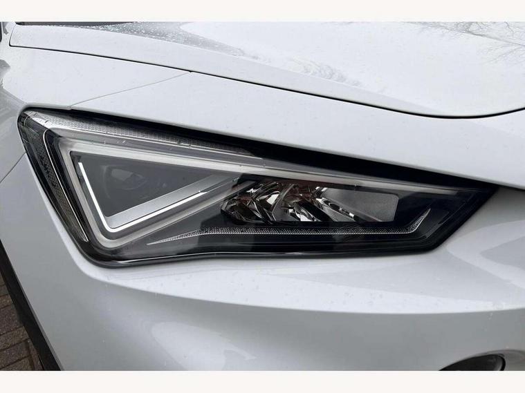 Digital cockpit and configurable dashboard, Driver alert system, Driving profile selection, E-call, Forward collision warning with automatic braking, Lane assist, Park assist (inc front/rear parking sensors), PAS, Predictive adaptive cruise control with speed limiter, Rear view camera, RPM, trip computer, outside temp gauge, instrument light brightness, low fuel warning light, lights on reminder, gearshift indicator, Service interval indicator, Start/stop system with regenerative braking, Wireless apple carplay, Wireless phone charger, Electronic locking differential and dynamic traction support, Standard suspension, 2 front and 2 rear USB type C sockets, Auxiliary input socket, DAB radio, Auto dimming rear view mirror, Body colour door handles, Body coloured bumpers, Dark grey wing mirror, Daytime running light with automatic headlight control and coming home feature, Dynamic headlight range control, Electric front/rear windows, Electrically adjustable heated and folding door mirrors with memory function, Front fog lamps with cornering function, Gloss black roof rails and window surrounds, LED Headlights, LED Taillights with dynamic indicator, Rain sensing wipers, Rear diffuser with black simulated exhaust pipes, Rear side wing doors, Rear wash/wipe, Third brake light, Tinted rear windows, Welcome lights, 12v power supply in centre console, 12V socket, 12v socket in loadspace, 2 front and 2 rear reading lights, 230V socket, 3 seat bench in 2nd row, 60/40 split rear bench seat with armrest and mechanical seat release, Dust/pollen filter, Front and rear head restraints, Front centre armrest, Height/reach adjust steering wheel, Illuminated interior front door sills, Illuminated sunvisor with mirror, Isofix, Leather multi function heated steering wheel with gear shift paddles, Luggage tie-down hooks, Single front passenger seat, Three zone climate control with control panel in rear, Variable luggage/load compartment floor, Wraparound lighting, Genuine Nappa leather Pack - Cupra, Navigation system pack with 10" navigation system - Formentor, 3 point seatbelts on all rear seats, ABS, Brake control system - ESC and brake booster, Child proof door locks, Driver and front passenger airbags with front passenger airbag de-activation, Electronic parking brake, Front and rear disc brakes, Front side curtain airbags, Hill hold control, Seat belt reminder for front and rear seats, Tyre pressure monitoring system, Anti theft alarm system, Keyless entry and start system (KESSY), Locking wheel bolts, Copper and aluminium interior detailing, 19" 'Exclusive' machined sport matte black and silver alloy wheels,