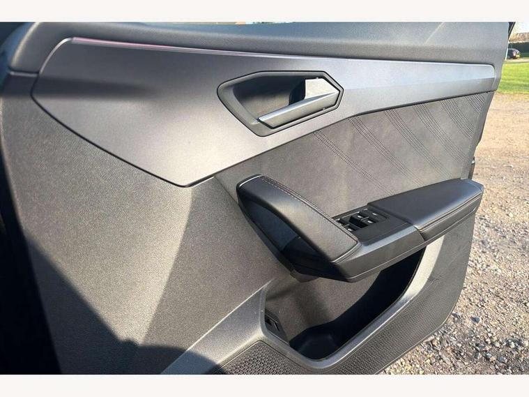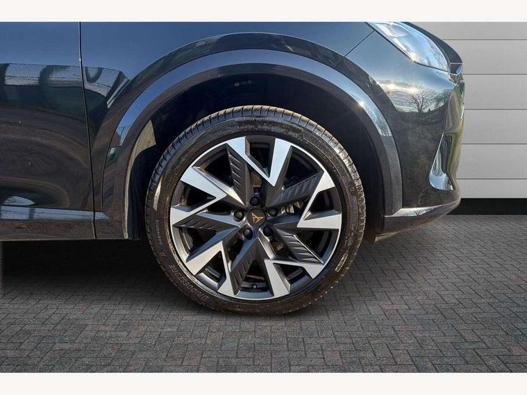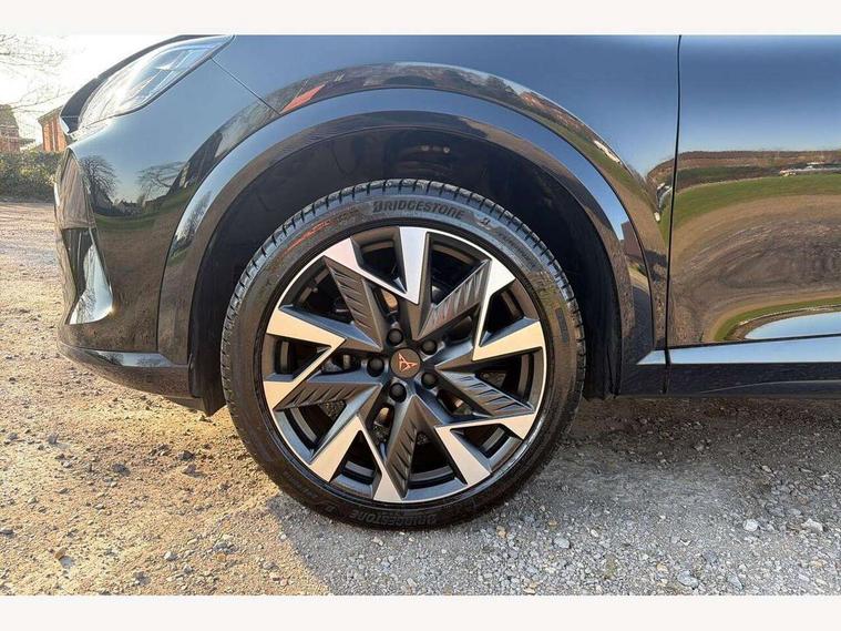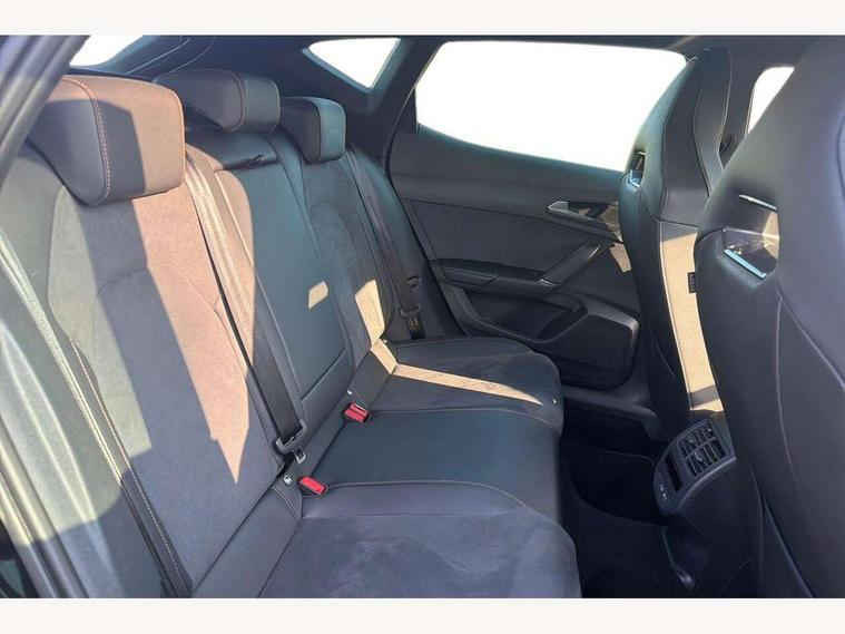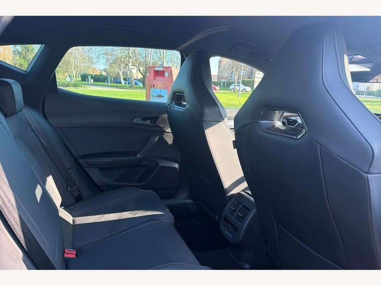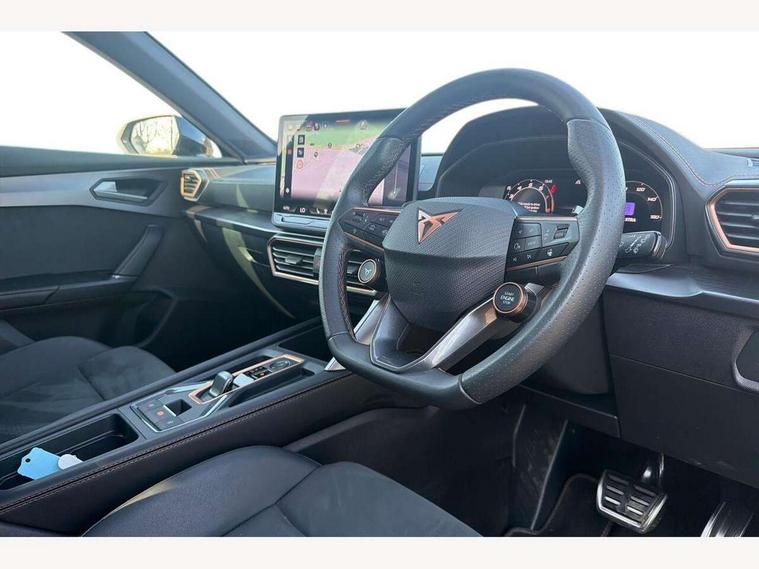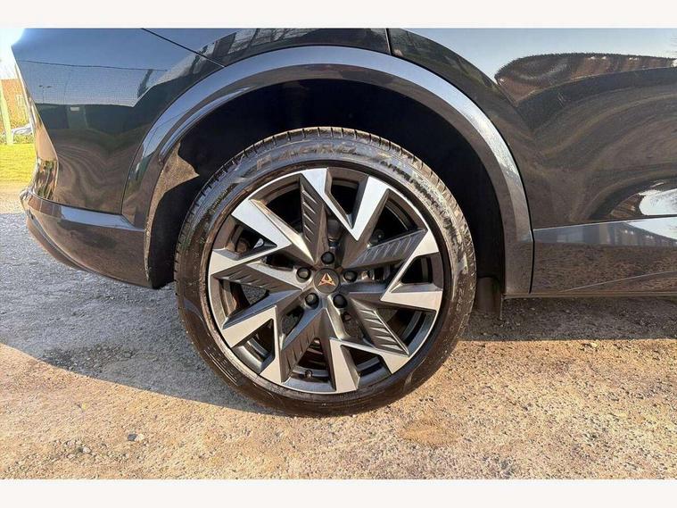 10.25" digital cockpit and configurable dashboard, Adaptive cruise control with follow-to-stop and speed limiter, Advanced driver alert system, Driving profile selection, Dynamic road sign display, Emergency steering support with turn assist, Forward collision warning with automatic braking, Front and rear parking sensors, Full link phone integration, Lane assist, Progressive steering, Rear view camera, RPM, trip computer, outside temp gauge, instrument light brightness, low fuel warning light, lights on reminder, gearshift indicator, Service interval indicator, Start/stop system with regenerative braking, Virtual pedal and electric tailgate, Voice control system, Wired Android Auto, Wireless apple carplay, Wireless phone charger, CUPRA sport suspension, Electronic locking differential and dynamic traction support, 2 front and 2 rear USB type C sockets, Media system with navigation, 12.9" touchscreen display, voice control, DAB, steering wheel mounted controls, Auto dimming rear view mirror, Body colour door handles, Body coloured bumpers, Dark grey wing mirror, Daytime running light with automatic headlight control and coming home feature, Door panel ambient lighting, Dynamic headlight range control, Electric front/rear windows, Electrically adjustable heated and folding door mirrors with memory function, Gloss black roof rails and window surrounds, High beam assist, LED 3rd brake light, LED front fog lamps with cornering function, LED Headlights, LED Taillights with dynamic indicator, Rain sensing wipers, Rear diffuser with black simulated exhaust pipes, Rear fog lights, Rear side wing doors, Rear wash/wipe, Tinted rear windows, Welcome lights (within exterior mirror housing), 12V socket, 2 front and 2 rear reading lights, 3 seat bench in 2nd row, 60/40 split rear bench seat with armrest and mechanical seat release, Black headlining, Black interior roof lining, Cupra sports pedals, Dust/pollen filter, Electrically adjustable driver's seat with memory and lumbar support, Front and rear head restraints, Front centre armrest, Heated front seats, Heated supersports multifunction leather steering wheel with satellite buttons and gear shift paddles, Height/reach adjust steering wheel, Illuminated aluminium doorsteps, Illuminated interior front door sills, Illuminated sunvisor with mirror, Isofix, Leather dashboard, door insert and side trim panel, LED smart wraparound lighting, PVC/Dinamica microfiber upholstery + bucket seats, Satellite steering wheel, Single front passenger seat, Storage pockets on rear of front seats, Three zone climate control with control panel in rear, Variable luggage/load compartment floor, 3 point seatbelts on all rear seats, ABS, Brake control system - ESC and brake booster, Child proof door locks, Driver and front passenger airbags with front passenger airbag de-activation, Electronic parking brake, Front and rear disc brakes, Front side curtain airbags, Hill hold control, Public e-call, Seat belt reminder for front and rear seats, Tyre pressure monitoring system, Anti theft alarm system, KESSY Advanced - Keyless start, keyless entry with SAFELOCK, Locking wheel bolts, Copper and aluminium interior detailing, 19" Sandstorm machined sport black and silver alloy wheels,