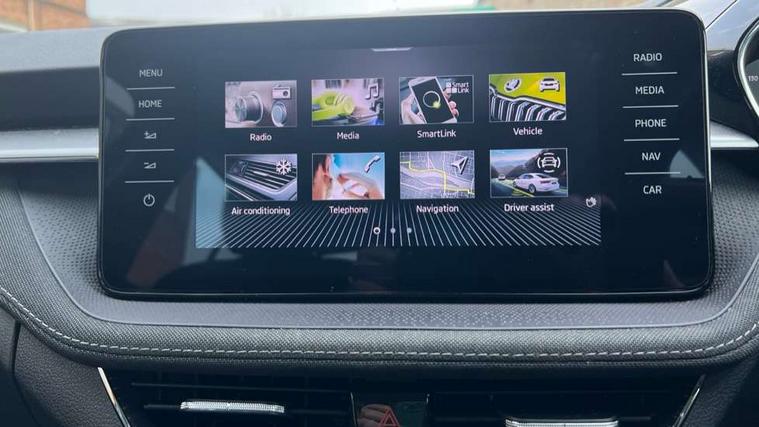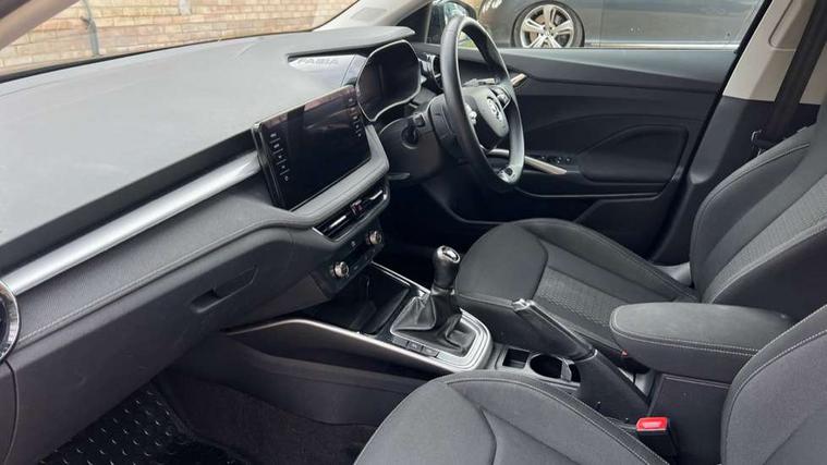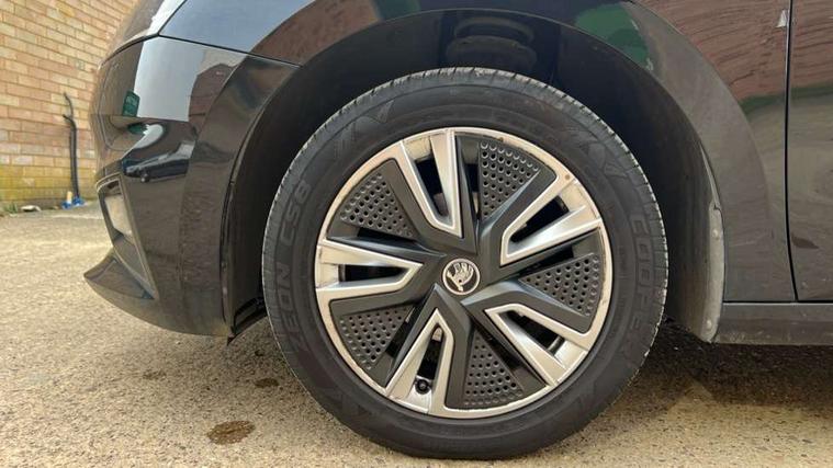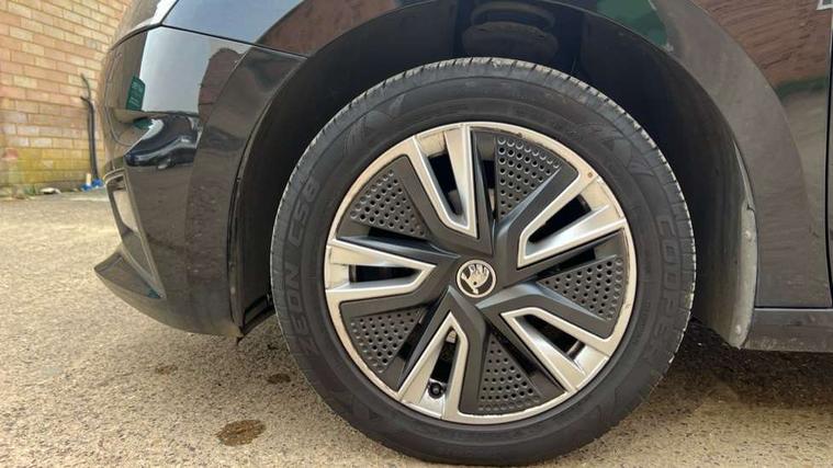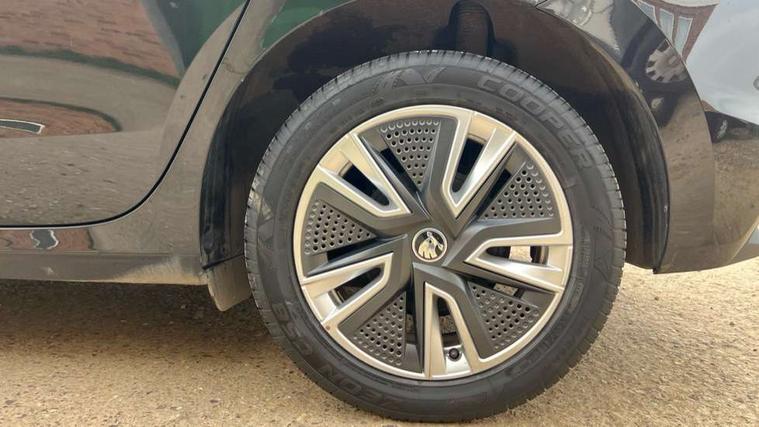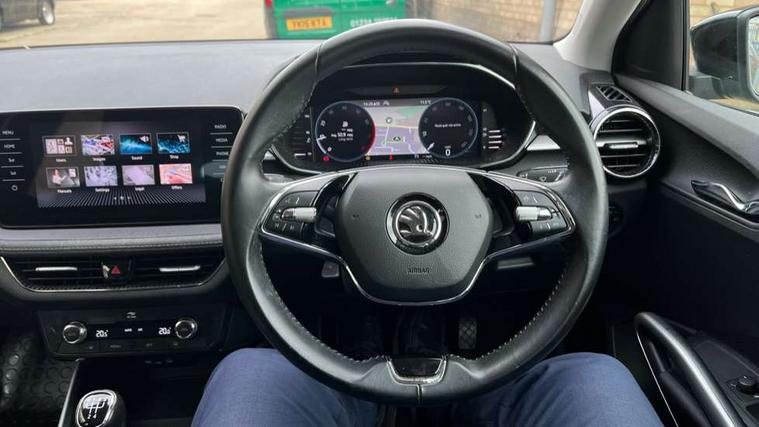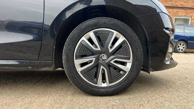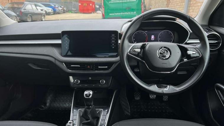 Bluetooth connection, Driver alert system - DAS, Electromechanical power steering, Exterior temperature gauge, Service interval indicator, 2x USB-C in the front (for data transmission and charging), 6 Speakers (4 in front and 2 in rear), Auxiliary socket for external MP3 player, DAB digital radio reception, Web radio, Auto dimming rear view mirror, Basic rear light, Body colour door mirrors, Body coloured bumpers, Chrome window surround, Door mirror integrated indicators, Electrically adjustable and heated door mirrors, Front and rear electric windows, Front window wiper intermittent control, Headlight range control - Automatic, Ice scraper in fuel cap, LED daytime running lights with coming and leaving home feature, Rear LED fog light, Rear side wing doors, Rear window wiper with washing nozzles, Roof mounted spoiler, SKODA tailgate lettering in chrome, Third brake light, 3 rear headrests, Backrest split and folding, Central console with fixed cup holder and storage box, Chrome handbrake release button, Comfort seats, Fabric upholstery, Front centre armrest, Gearshift knob/handle in leather, Hand brake lever handle in leather, Height adjustable front headrests, Height adjustable front seats, Height adjustable steering wheel, ISOFIX and TopTether anchorage points to the outer rear seats, ISOFIX and TopTether on the front passenger seat, Luggage compartment lighting, Manually adjustable lumbar support in front seats, Pollen filter, Rear seat bench unsplit, Removable cup holder, Single front passenger seat, Storm grey headlining, Sun visors with mirror and airbag label on passenger side, Textile floor mats, Ticket holder, Umbrella in drivers door, Ambient lighting pack 2 - Fabia Hatchback, 3-point height adjustable front seats belts with pretensioner and force limiter, Automatic warning lights in case of crash, Driver and passengers airbag with switch off function, e-Call+, ESC including ABS, MSR, ASR, EDS, HBA and XDS, Front and rear seat belt warning, FRONT ASSIST (AEB City and AEB Inter Urban), Front side airbags, Head airbags, One tone horn, Pedestrian protection, Three rear 3-points safety seat belts with pretensioner and force limiter including stop function for outer rear seat belts, Tyre pressure monitoring system, Anti-theft alarm system including immobiliser, interior monitoring, backup horn, and towing protection, Chrome edged air vents, Satin black door and side trim panel in front, Anti-theft wheel bolts protection, Super-low rolling resistance tyres,
