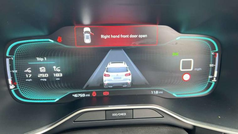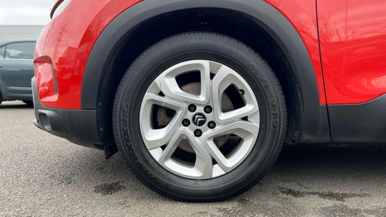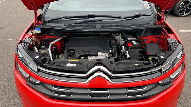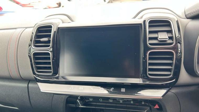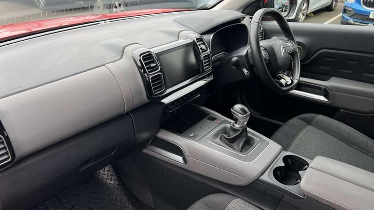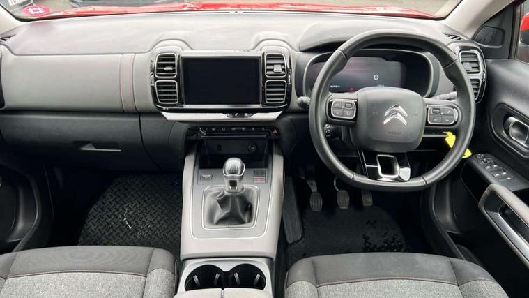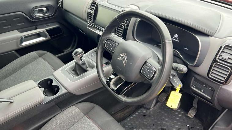 12.3" customisable TFT instrument display, Active lane departure warning system, Bluetooth telephone facility, Central 8" capacitive touch screen, Citroen connect box emergency assist system, Coffee Break Alert, Eco+ mode, Electric power steering, Exterior temperature indicator with ice warning, Gear efficiency indicator, Mirror screen with mirror link, apple carplay and android auto, Multi function trip computer, Programmable cruise control and speed limiter, Rear parking sensors, Speed limit recognition and recommendation, Traffic sign recognition and recommendation, Suspension with Progressive Hydraulic Cushions, 2 USB sockets, Auxiliary input socket, DAB (Digital Audio Broadcasting), AM/FM and MP3 compatible radio with two tweeters and four speakers, 3D effect LED rear lights, Acoustic laminated windscreen with rain and brightness sensors, Automatic hazard light activation upon heavy brake application, Automatic headlight activation via windscreen mounted sensors, Automatic triggered rear windscreen wiper in reverse gear, Automatic windscreen wipers, Body colour door handles, Body coloured electric and heated door mirrors with integrated LED indicator, Body coloured roof, C5 Aircross monogram on boot rear, Citroen logo and monogram on rear, Front fog lights with cornering function, Front windscreen wiper with magic wash cleaning system, Gloss black finish on A and B pillar and aerodynamic trim, Guide me home headlight function, Halogen headlights, Halogen rear fog lights, Halogen rear number plate lights, Headlights left on audible warning, Heated rear windscreen with integrated antenna, High level LED centre brake light, LED daytime running lights, Light tinted rear windows and rear windscreen, Matte black lower rear skirt, Matte black rear bumper facia, Matte black side sill with anodised silver colour touch, Matte black upper and lower grille, Matte black wheel arch extensions, One touch electric front/rear windows with pinch protection, Painted front bumper, Painted rear bumper, Roof coloured rear spoiler, Satin chrome C signature, Satin chrome window surround, 12V socket in boot, 12V socket in cabin, 2 cup holders in the front and rear centre console, 2 Position boot floor, 2 way lumbar adjustment for driver, 2x Rear coat hooks, 3 Independent full size rear seats with adjustable recline angle, 3x Grab handles retractable with damping, Air recirculation when reverse gear is engaged, Anti odour and pollen filter, Central front armrest with butterfly wing opening and illuminated storage compartment, Dual zone automatic climate control, Fixing rings 4 in load compartment, Front central console with two cup holders, Front door pockets store up to 1.5L bottle and A4 note pad, Front interior light with 2 reading spotlights and rear interior light with timer, Front reading and welcome lights, Front seat back map pockets, Height and reach adjustable leather steering wheel with 2 control zones, Hinged rear parcel shelf, Isofix child seat preparation for front passenger seat, Leather effect interior door handles, Leather steering wheel with satin chrome inserts and radio controls, Manual driver seat adjustment (height, fore/aft and backrest angle), Manual passenger seat adjustment (height, fore/aft and backrest angle), Multi function steering wheel, Open central storage area below touch screen, Open central storage compartment, Rear centre console ventilation system, Rear door pockets store up to 0.5L bottle, Rear passenger air vents, Satin chrome digital instrument panel and touchscreen trim, Satin chrome gear lever, Satin chrome interior door handles, Seatbelt not fastened audible and visual alert for front seats, Seatbelt unfastened on the move audible and visual alert for front and rear seats, Smooth opening flocked glove box with lighting, 2x Isofix child seat fitting on outer rear seats, 3x Rear three point retractable seatbelts with pretensioners and force limiters in the outer rear seats, ABS/EBD, Adaptive driver and front passenger airbags with passenger airbag deactivation function, Collision risk alert, Driver and front passenger side airbags, DSC (Dynamic Stability Control) and ASR (Electronic Anti-skid System), Electric child locking functionality on rear windows and doors, Electronic parking brake, ESP including traction control and stability programme, Front and rear curtain airbags, Front optimised safety headrests and 3 x rear retractable headrests with height adjustable, Front three point retractable seatbelts height adjustable with pre tensioners and force limiters, Front ventilated disc brakes and rear disc brakes, Hill start assist, Mono-tone horn, Tyre under inflation indicator, Alarm - perimetric and volumetric alarm with anti-lifting mechanism, Automatic door locking, Electronic code immobiliser, Remote central locking + deadlocks, Gloss black touch screen surround with integrated tactile buttons and chrome finisher, Leather effect dashboard facia, Satin chrome air vent decors, Soft touch matte dashboard with grey insert,