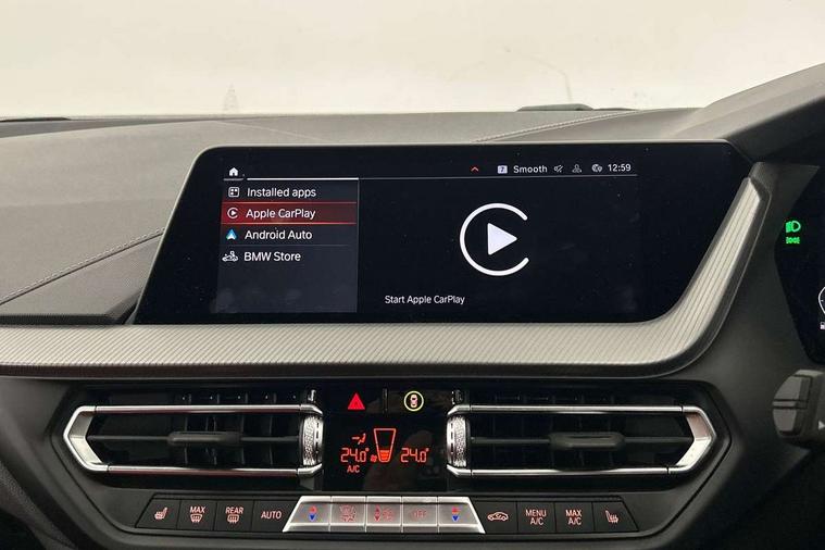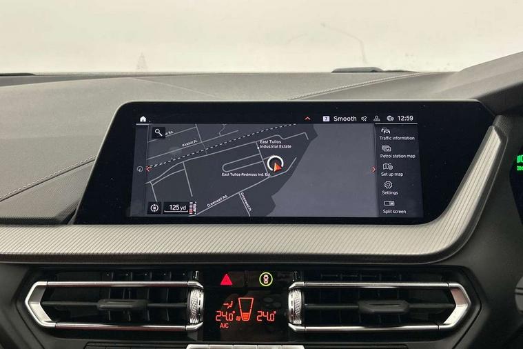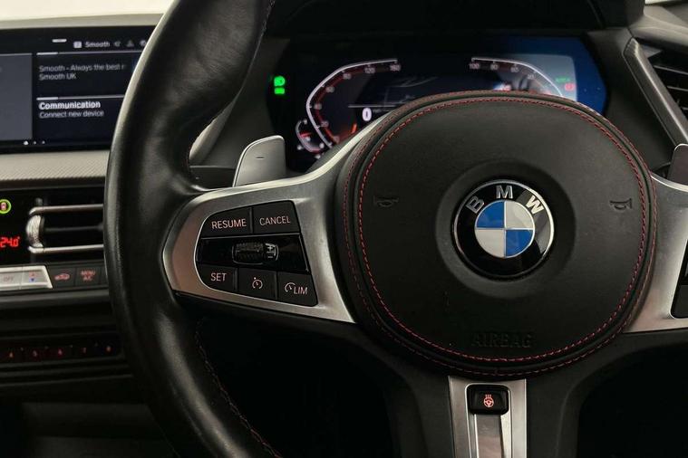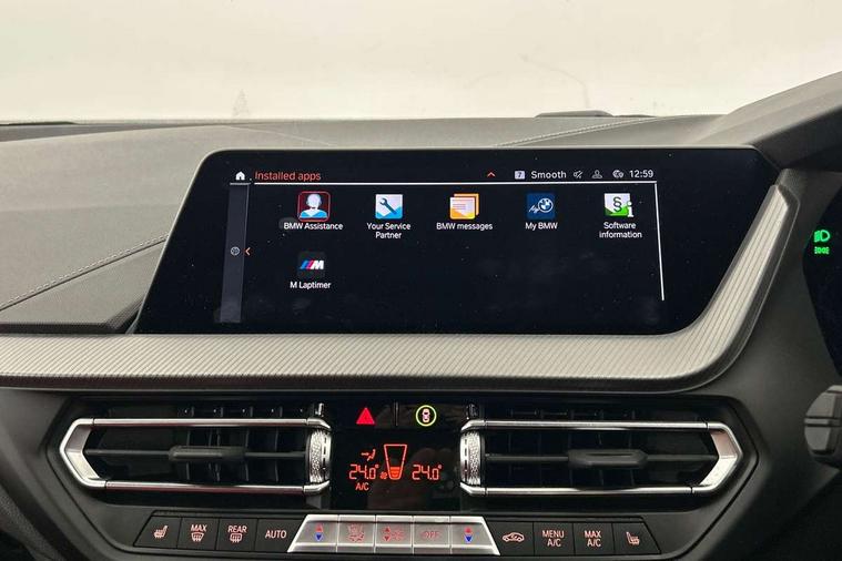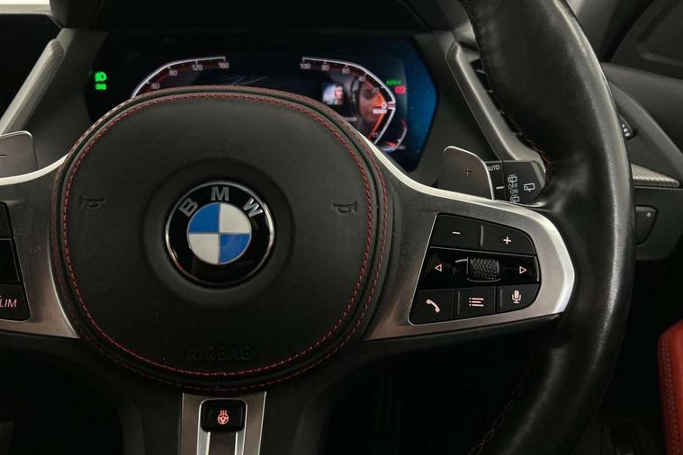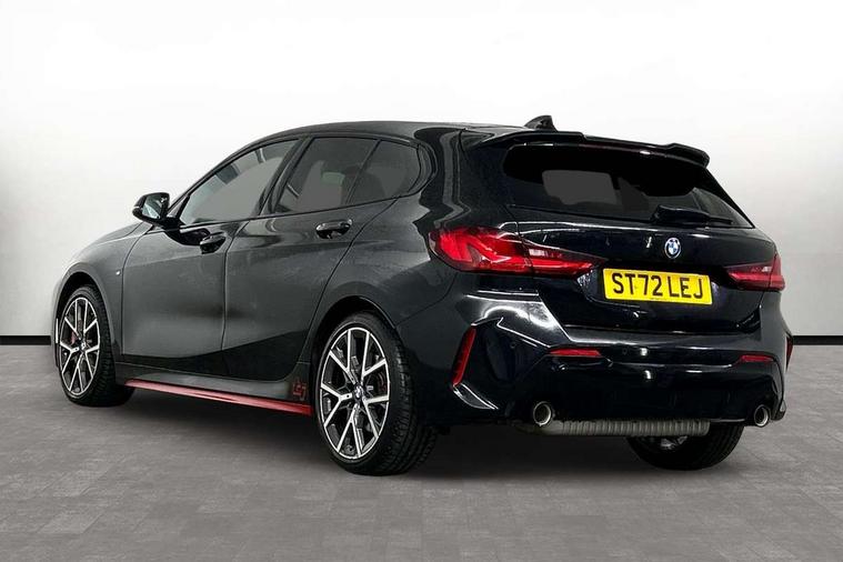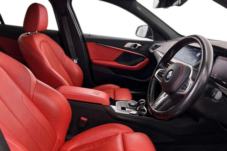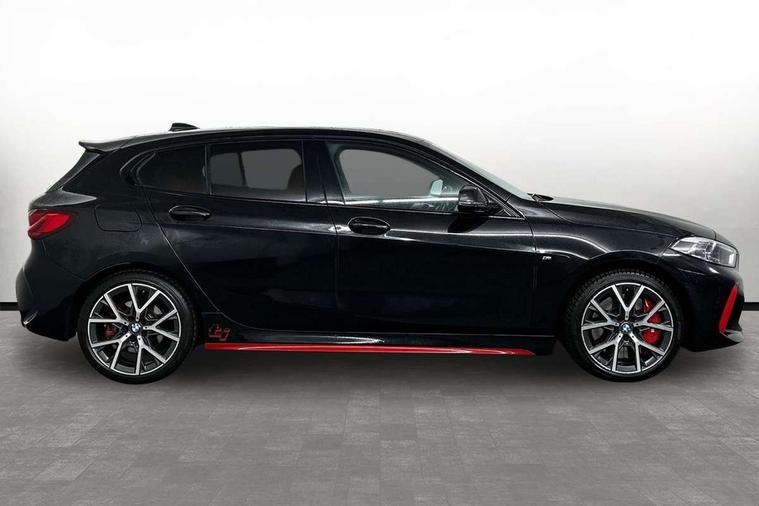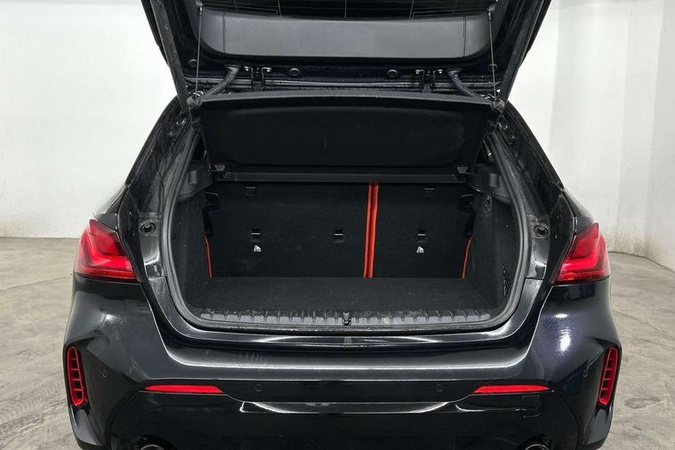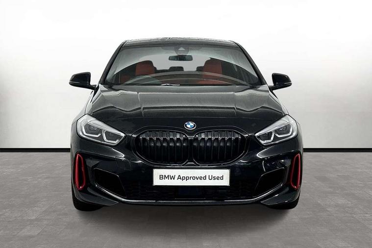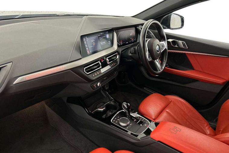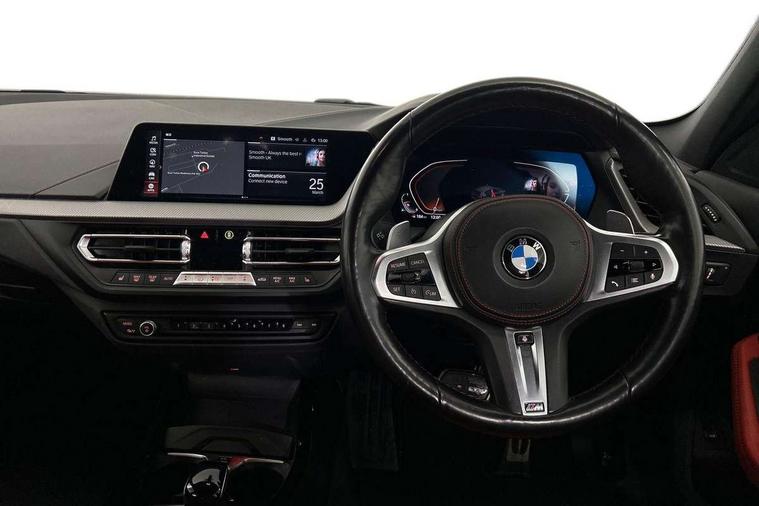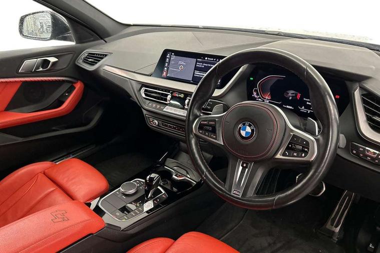 Active guard plus, Attentiveness assist, BMW ConnectedDrive online services, BMW Teleservices, Check Control warning system for monitoring of lights and door/luggage compartment open warning, Cruise control with brake assist, Eco pro mode, Electric power steering with Servotronic steering optimised at all speed ranges, Front axle single joint with specific axle kinematics to minimise drive influences on steering + provide increased rigidity agile driving behaviour, Integrated owners handbook, Lane departure warning system, Oil sensor for level and grade, On board computer, Optimum shift indicator, Personal Profile, Pull away assistant, Rigidly mounted rear subframe - Multi link construction with separate spring / damper configuration and excellent driving characteristics, Speed limit Info including no-overtaking indicator, Speed limiter, Aluminium lightweight construction, Anti roll bar front and rear, Balancer shaft, Double VANOS twin scroll turbocharging system, Drive Performance Control, Eight speed sport automatic transmission with gearshift paddle switches, Electronic differential lock, High precision injection, Larger fuel tank capacity (50 litres), M sport suspension with M128i xDrive specific settings, Petrol Particulate Filter, Twin tube gas filled shock absorbers with degressive characteristic curve, VALVETRONIC engine management, DAB Digital radio, Auto dimming rear view mirror, Automatic headlight beam throw control, Automatic windscreen wipers and automatic headlight, Black chrome tailpipe finishers, BMW individual high gloss shadow line with extended content, Body colour door handles, Body colour mirror caps, Body colour roof trims, Chrome 'M' logo side designation, Chrome kidney grille frame with Satin Aluminium struts, Direction indicator side lights in exterior mirrors, Fading support, Folding side mirrors with auto dimming/folding wing mirrors with auto dimming, Follow me home headlights, Front and rear bumper system with replaceable deformation elements, Front and rear electric windows with open and close fingertip control, anti trap facility and comfort closing, Front door sill finishers in black plastic with M designation in metallic look, Green tinted heat protection glazing, Heated, electrically adjustable exterior mirror aspheric on driver side, convex on passenger side, High gloss shadowline window frame, Recess cover mirror frames and B/C pillar embelisher trim, High level third brake light, Integrated front windscreen with washer jets, Kidney frame and struts in high gloss black extended, LED daytime running lights, LED eyebrow turn indicators, LED front fog lights, LED Headlights, Lightweight engineering, Matt black air guide grilles, Matt black wheel arch trim, Model designation on electric bootlid, Nearside reverse light in rear light cluster, Preparation for high beam assistant, Rear fog lights, Rear side wing doors, Rear window wiper, Shark fin antenna, Trailer stabilisation logic, Visible VIN plate, Welcome lighting, 12V power socket in front centre console with blanking plug, 3 rear seat head restraints, 3 seat bench in 2nd row, Anthracite headlining, Black boot net with lashing eyes, Cargo function on 2nd seat row, Centre armrest in black/red highlight including embroidered 'ti' designation in red, Child seat ISOFIX attachment for two outer rear seats and front passenger seat with anchorage points, Conditioned based service, Driver and front passenger seat heating, Floor mats with red binding, Folding rear clothes hook, Four grab handles integrated in roof lining, Front and rear door pockets with bottle holders, Front and rear side armrest integrated into door trim, Front armrest, Front sports seats, Glove compartment, Height adjustable front head restraints, Instrument panel top section , door armrests and door panels in black/red highlight, Luggage compartment for bag hooks on left and right, foldable luggage compartment liner and four lashing eyelets, Manual adjust steering wheel, Multi-function controls for steering wheel, Single front passenger seat, Storage compartment in centre console, Sun visors with vanity mirrors and insert tab, Three spoke M sport design multi function leather steering wheel in unique red stitching, Two front centre console cupholders, Two zone automatic air conditioning, Additional interior lighting pack - 1 Series, BMW live cockpit professional pack- 1 Series, Connected pack professional - 1 Series, Interior lights pack - 1 Series, M Sport exterior styling aerodynamics pack - 1 Series, 2 tone horn, 3 point seatbelts on all seats, front pyrotechnic belt tensioners, stopper and belt force limiters, rear coded belt buckles, Airbags - Front driver/passenger, front and rear curtain head protection, front side, manual deactivation of front passenger airbag, Anti lock braking system (ABS) with brake assist, BMW emergency call, Brake drying, Braking readiness, Child proof locking system in rear door, City braking function, Comfort modes, Cornering brake control, Crash sensor activating central locking release, hazard warning lights, fuel cut off, interior lighting + activation of safety battery terminal clamp, Driver and front passenger seat belt security check, Dynamic stability control + (DSC+), Dynamic Traction Control - DTC, Electrically operated hand brake including automatic hold function, Front and rear disc brakes, M Sport brakes with red calipers, M Sport seatbelts, Seatbelt warning, Side impact protection, Tyre pressure monitoring system, Warning triangle and first aid kit, Central locking switch for all doors, fuel filler cap and luggage compartment, Deadlocking function system to all doors, Drive away locking system on all doors and luggage compartment with de-activated in iDrive settings, Locking wheel bolts, Remote control with integrated key with High-gloss Black inlay and M designation and 1 button for open/ close lock, window, open luggage compartment, Start/stop button illuminated in centre console with keyless e