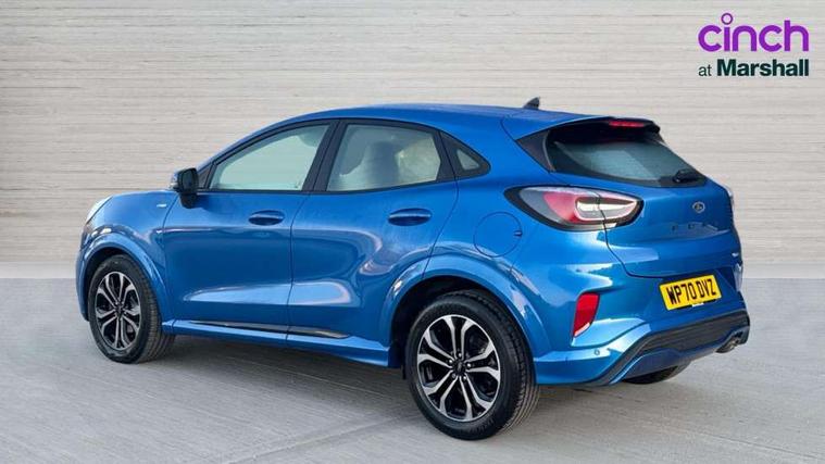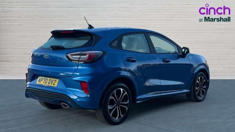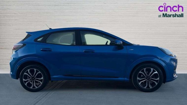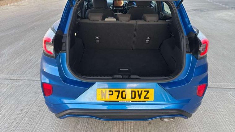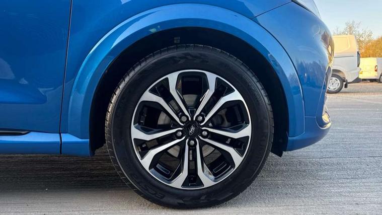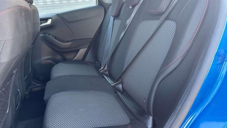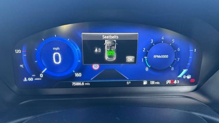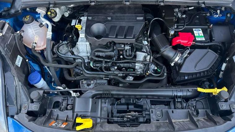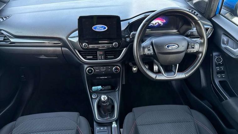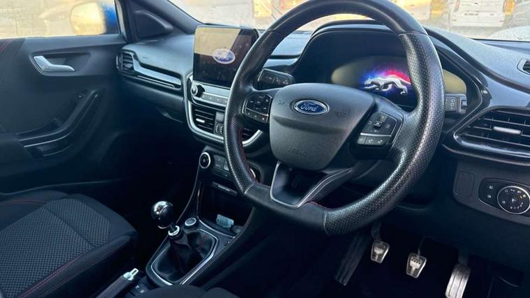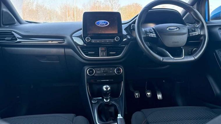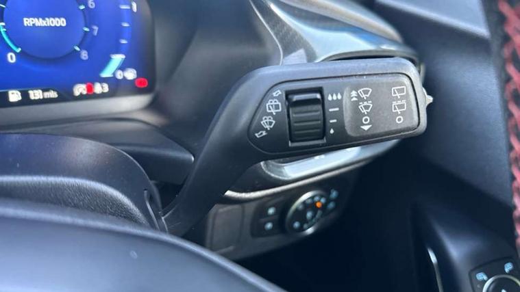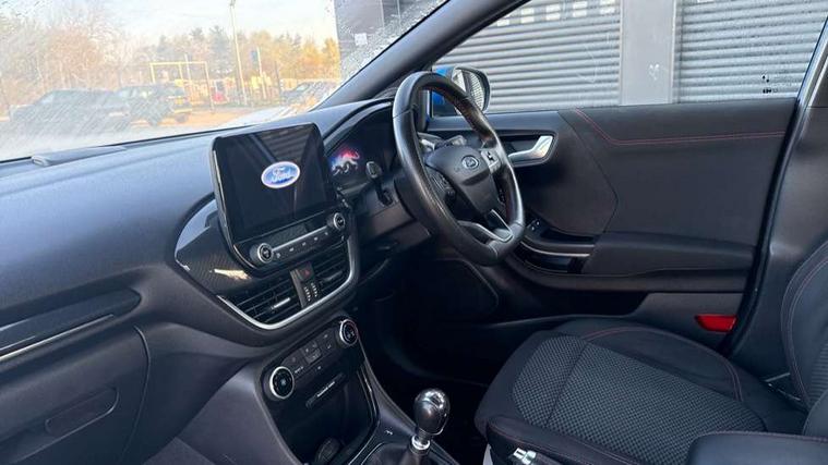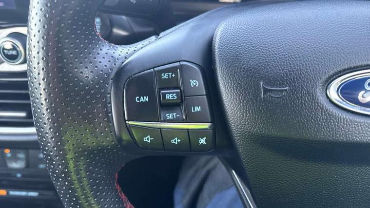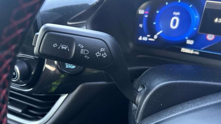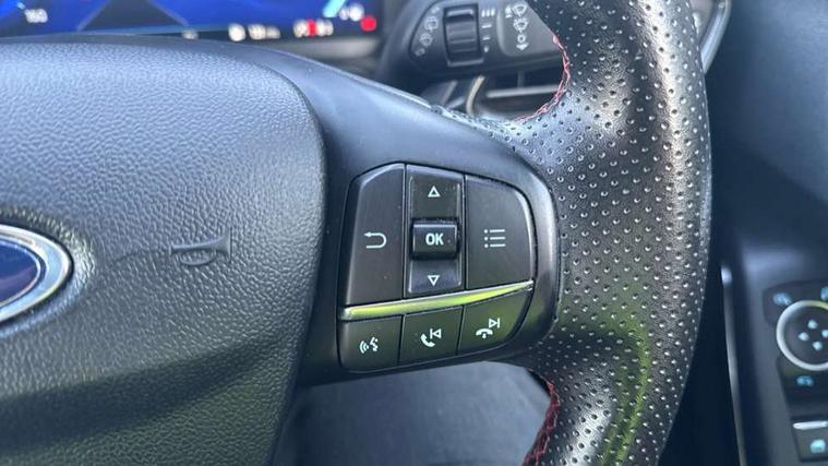 Ford easy fuel, Full digital 12.3" instrument cluster, Lane keeping aid with lane departure warning, Power assist steering, Rear parking sensor, Selectable drive modes(Normal, Eco, Sport, Slippery and Trail), Automatic headlights with rain sensing wipers and auto high beam, Body coloured door mirrors, Front fog lights with cornering lights and LED rear lamps, Power foldable heated door mirrors with puddle lamps, Quickclear heated windscreen, Rear wiper, ST-Line body kit with large rear spoiler wth sports suspension, Alloy sports pedals, Centre console with armrest and stowage, Cloth upholstery, Driver seat height/lumbar adjust, Ford megabox extended bootspace, Front and rear floor mats, Front and rear head restraints, Manual air conditioning, ST-Line flat bottomed sensico leather steering wheel with leather handbrake and aluminium gear knob, 3 rear seatbelts, Electronic stability control (ESC) and hill start assist, Pre-collision assist with autonomous emergency braking, pedestrian/cyclist detection & post-collision braking, Tyre pressure monitoring system (TPMS), Thatcham alarm,