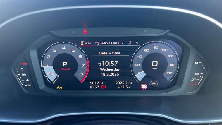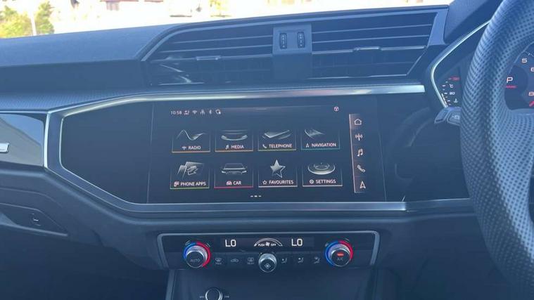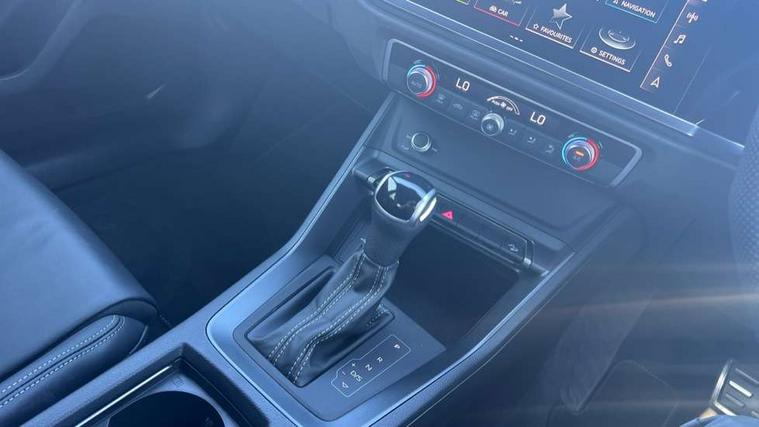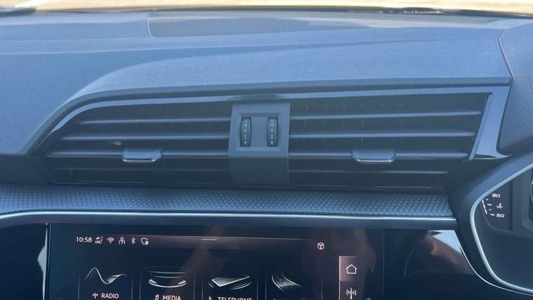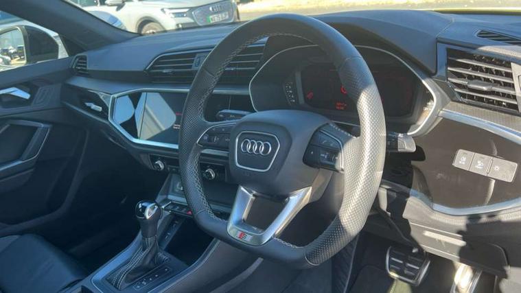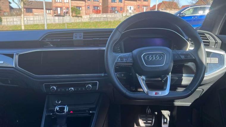 Amazon alexa Integration, Audi connect safety and service, Audi drive select, Audi lane departure warning, Audi Virtual Cockpit - 10.25" display, Bluetooth interface, Camera based traffic sign recognition, Distraction and Fatigue warning, Legal emergency call, MMI Navigation Plus with high resolution 10.1 inch touchscreen colour display, Power operated tailgate, Progressive steering, Service interval indicator, Smartphone interface includes wireless Apple carplay/Android Auto, Start stop system with recuperation, Voice control system with natural language interaction, Sports suspension, 2 USB-C ports with charge and data functions, 6 passive loudspeakers, DAB digital radio module, Acoustic windscreen, Anthracite black radiator grille, Audi Beam uses LEDs to project the Audi logo onto the ground as you exit your Q3, Auto dimming door mirrors, Auto dimming frameless rear view mirror, Black roof rails, Electrically folding, adjustable and heated door mirrors with integrated LED side indicators and kerb view function for passenger side, Front and rear electric windows, Front fog lights, Grille vertical bars in aluminium silver/Matt, High gloss black finish B and C pillars, LED Dynamic rear indicators, LED headlights with LED daytime running lights, LED rear lights, LED third brake light, Privacy glass dark tinted rear and rear-side windows (from B-pillar backwards), Rain and light sensors, Rear diffuser grille in grained matt black, Rear diffuser strip in matt anthracite black, Rear side wing doors, Rear wiper, S line bumpers in contrasting Manhattan grey, Variable front intermittent wipers, 12V socket in rear centre console, 3 seat bench in 2nd row, 40:20:40 folding with manual adjustment for 60:40 forwards/backwards position and backrest angle, Adjustable rear seat bench/backrest with centre armrest and cupholder, Black carpet mats, Black cloth headlining, Dual zone electronic climate control, Electric lumbar support, Front and rear black floor mats with contrast stitching in rock grey, Front and rear headrests, Front centre armrest, Height and reach adjustable steering wheel, Illuminated door sill trims with S logo, ISOFIX child seat mounting for front passenger with airbag deactivation and outer rear seat including top tether attachment point for outer rear seats, Luggage compartment sill protection in stainless steel, Manual front seats with height adjustment, Perforated leather gearknob, Single front passenger seat, Stainless steel pedals, Twin leather upholstery with front sport seats + S embossing, Black styling pack - Q3, Non smoking pack - Q3, 3x3 point rear seatbelts, 6 airbags - Driver, front passenger, curtain and side windows, Audi pre-sense front with pedestrain and cyclist recognition, Electrically operated child locks on rear doors, Electromechanical parking brake, Electronic stabilisation control including ABS, ASR and EDL, Front seatbelt reminder, Hill descent control, Hill hold assist, Pre sense basic, Seatbelt monitoring, Tyre pressure warning, Warning triangle and first aid kit, Anti theft wheel bolts, Immobiliser, Remote central locking, Thatcham approved category 1 anti theft alarm, Aluminium look interior elements, Detail dashboard around MMI touch colour display in glass look, black with surround in aluminium look, Leatherette door armrest, Piano black inlay,