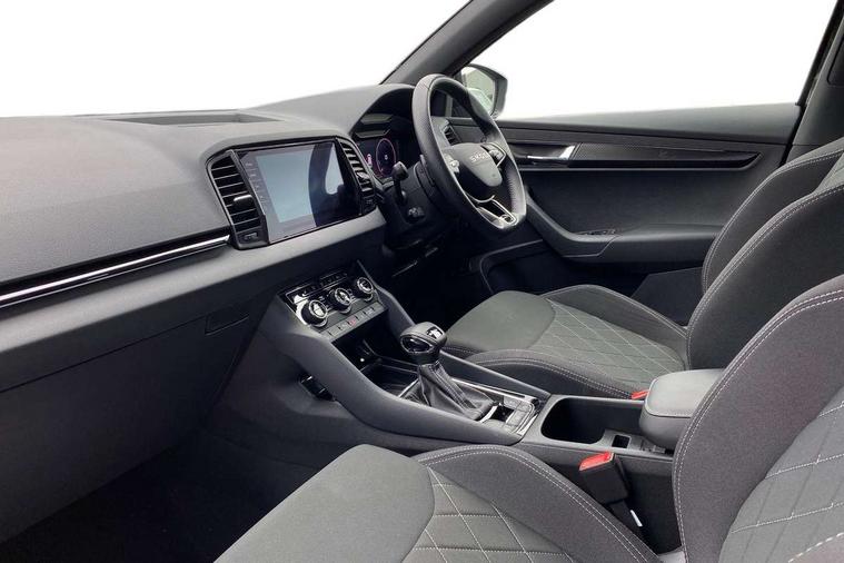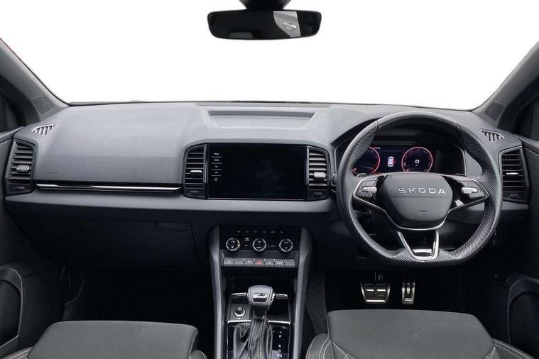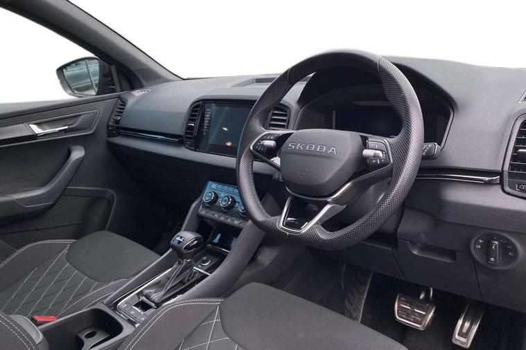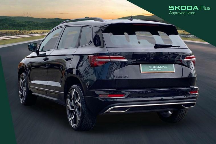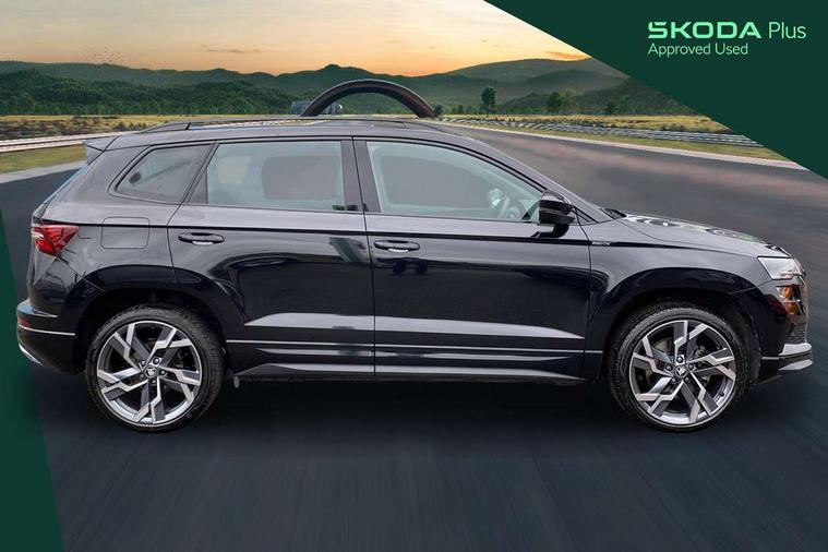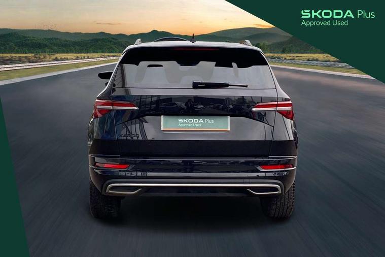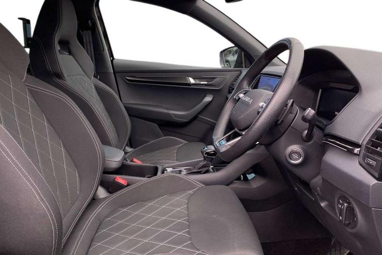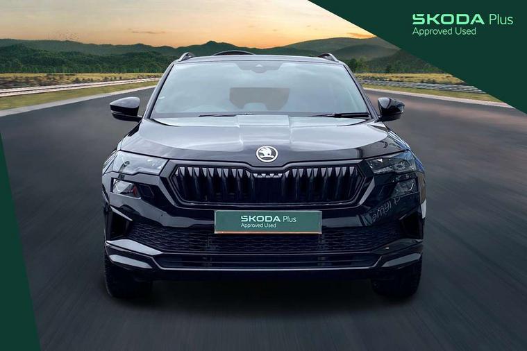 Advanced driver attention and drowsiness monitor, Emergency services call system, Outside temperature gauge, Sensor for driver assistance systems, Service interval indicator, SmartLink wireless for Apple and wired for Android, Start/stop system with regenerative braking, Traffic sign recognition, USB C Port x 2 in front centre console, Virtual Cockpit - 10.25" digital display, Virtual pedal with electrically operated boot door, Wireless smartphone charging, DAB radio with Bluetooth, USB connection, Acoustic glass, Aero front windscreen wipers with intermittent function, Auto dimming rear view mirror with light and rain sensors, Black door mirrors, Black electric window control buttons, Black radiator grille, Black roof rails, Body colour door handles, Electric front and rear windows with child proof lock, Extended rear roof spoiler, Front door steps with SportLine logo, Heated rear windscreen, LED daytime running lights, LED rear lights with high functionality welcome effect and dynamic indicators, Light assistant (coming/leaving home/tunnel light), Panoramic sliding sunroof, Plastic scuff plates in door apertures, Privacy glass, Protective door side sills in body colour, Rear diffuser, Rear side wing doors, Rear window wiper with washer system and intermittent control, Safety reflectors on front doors, Skoda lettering on tailgate in black, Sportline badge on front fender, Sports front and rear bumpers, Third brake light, Unique dark chrome design logo on alloy wheels, 1.5 litre bottle holders in driver and front passenger door panels, 12V socket in boot, 12v socket in front centre armrest with storage compartment and rear air vents, 2 x Tablet holder, 3 rear height adjustable headrests, 3 seat bench in 2nd row, 3 spoke sports leather heated multifunction steering wheel with DSG paddles, 4 foldable roof handles with rear coat hooks, Black floor carpet, Cargo elements in boot, Chrome inner door handles, Foldable hooks in the boot, Front head restraints, Height adjustable front three point seats belts with tensioners, Height/reach adjust steering wheel, Ice scraper, Illuminated glovebox, Illuminated luggage compartment, Isofix child seat preparation for front passenger seat, Isofix child seat preparation outer rear, Manual lumbar support for front seats, Pen holder, Pollen filter, Rear backrest release from boot, Rear boot cover, Rear package tray, Rear reading lights, Rear seats fixed folding and divided 60:40, Rubbish bin door, Safety vest holder, Single front passenger seat, Skoda lettering on steering wheel, Sportline decorative inserts, Storage box in upper central dashboard closed, Sunvisors with illuminated vanity mirrors, Textile floor mats, Ticket holder, Titan black interior ceiling, Umbrella under passenger seat, Under passenger seat storage compartment, Columbus pack - Karoq, LED Interior lighting pack with Skoda welcome logo - Karoq, Light Pack - Karoq, Non Smokers pack, Performance pack - Karoq, Winter plus pack with heated front and rear seats - Karoq, Automatic door unlocking in case of crash, Automatic fuel cut off in case of crash, Driver airbag, Electronic parking brake with auto hold function, Emergency rear braking signal, ESC (incl. ABS+MSR+ASR+EDS+HBA+DSR+RBS+MKB), Front side airbags, Head airbags, Hill hold control, Knee airbags, Passenger airbag with switch-off function, Pedestrian monitor, Seatbelt reminder signalisation and pretensioner for all seats, Three point seatbelts rear, Two tone horn, Tyre pressure monitor, Alarm with interior monitoring, back up horn and tilt sensor with safe function, Electronic engine immobiliser, Keyless entry and start/stop, Remote central locking with 2 remote folding keys, Black air vent surround, Black centre console, carbon door decor, Satin black dashboard, Satin black door trim, 19" Sagittarius anthracite alloy wheels, Anti-theft wheel bolts protection, Breakdown and tool kit,