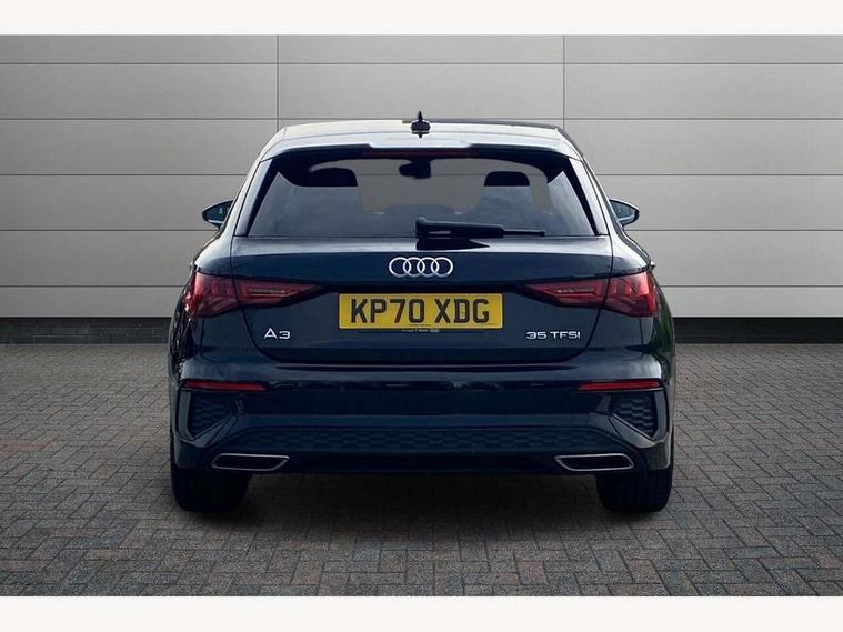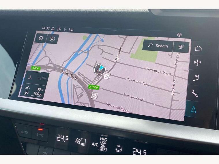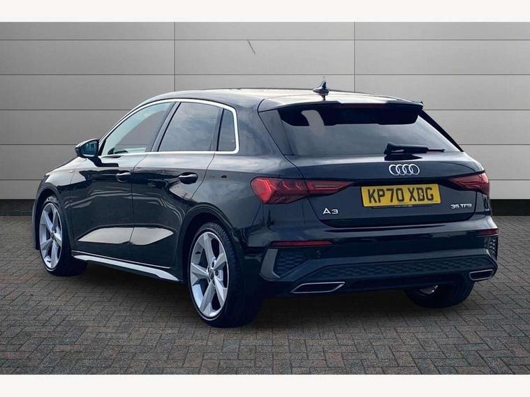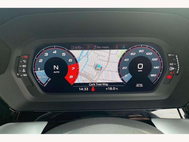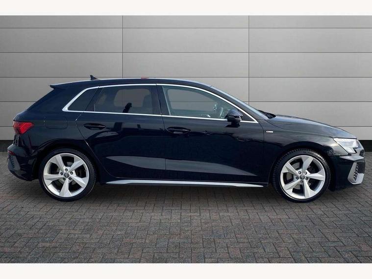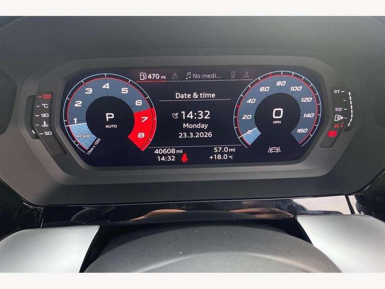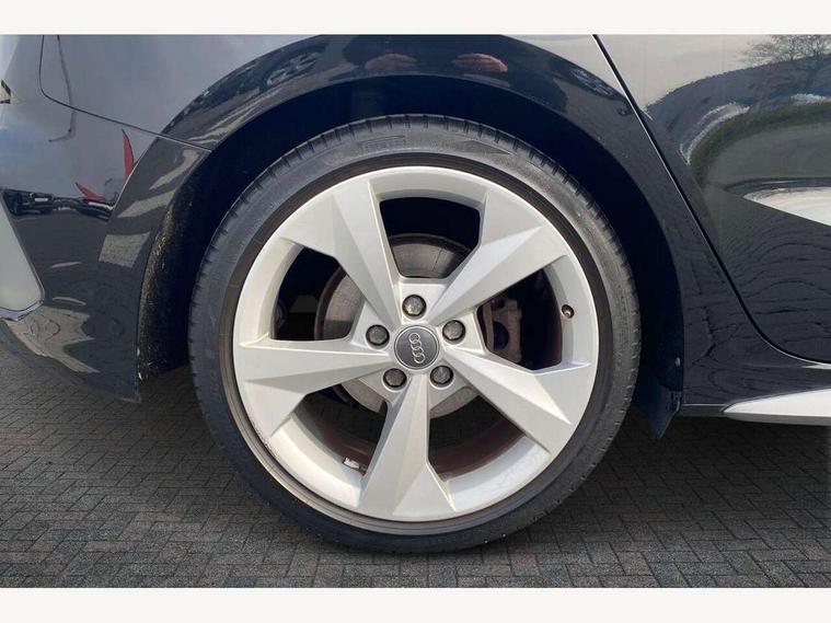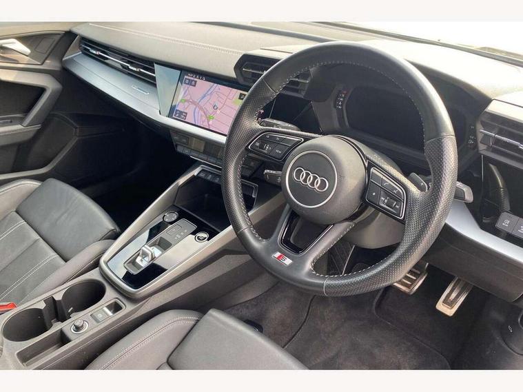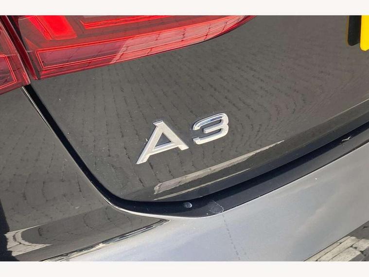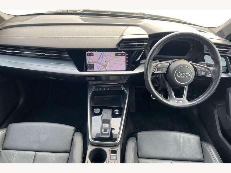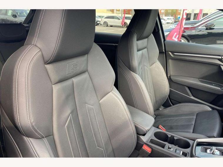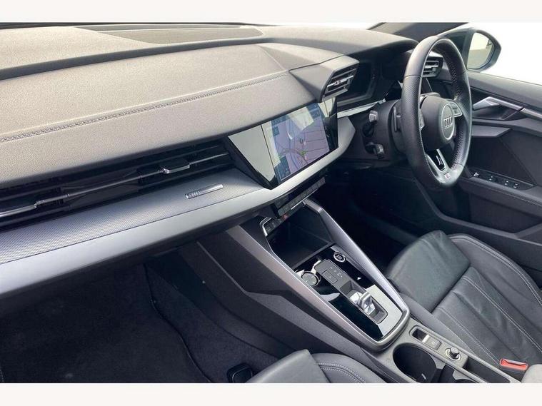 Audi connect emergency call and service, Audi drive select (Auto, Comfort, Dynamic, Efficiency and Individual), Audi smartphone interface, Audi Virtual Cockpit - 10.25" digital and colour instrument cluster, Automatic start/stop system with recuperation, Bluetooth interface, Collision avoidance assistant, Electromechanical power speed sensitive steering, Lane departure warning system, MMI Navigation Plus with high resolution 10.1" colour touch screen display, Service indicator, Trip computer, Voice control system with natural language interaction, 1xUSB-A and 1xUSB-C connection, 6 passive loudspeakers, DAB Digital radio, Acoustic glass windscreen, Aluminium window trim, Auto dimming frameless rear view mirror, Body colour exterior mirrors, Electrically adjustable/heated/folding/dimming door mirrors with kerb view includes integrated LED indications + kerb view function for passenger side, Front electric windows, Illuminated aluminium inserts front door sills with S logo, LED daytime running lights, Light and rain sensors, Privacy glass - dark tinted rear window, rear door and side windows, Rear electric windows, Rear side air outlets in grained matt black, Rear wiper, S line bumpers, S roof spoiler, 12V socket and storage compartment in front centre console, 40/20/40 split folding rear seat bench with cupholder, Black cloth headlining, Dual zone electronic climate control, Front and rear centre armrest in leather, Front and rear headrests, Front/rear floor mats, Height and reach adjustable steering wheel, Interior lighting - glove compartment light and right hand side, Luggage compartment floor covering, Manual boot compartment lid, Manually adjustable front seats, Seat side bolsters, Stainless steel pedals and front footrest, Twin leather upholstery with front sports seats S embossed logo, Aluminium interior elements pack - A3 Sportback, S line styling pack - A3 Sportback, 3x3 point rear seat belts, Driver and front passenger airbag with passenger airbag deactivation, Electronic Stabilisation Control (ESC) including ABS, ASR and EDL, First aid kit with warning triangle and 2 safety vests, Front side airbags with head airbags and interaction airbag, Hill hold assist, Pre-sense front with pedestrian and cyclist detection, Seatbelt monitoring, Tyre pressure loss indicator, Anti theft alarm, Anti-theft wheel bolts, Electronically operated child lock, Immobiliser, Remote control central locking, Accent surfaces in the dashboard and centre console in platinum grey silk effect paint finish, Dark spectrum aluminium inlays,