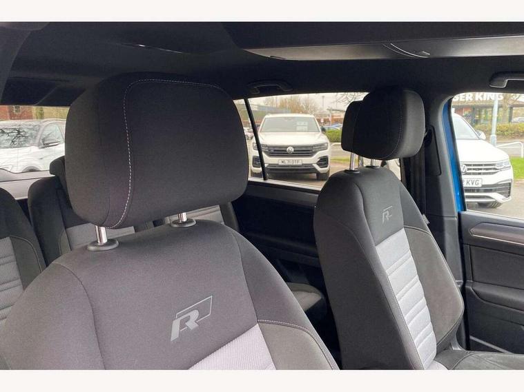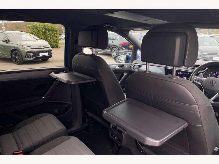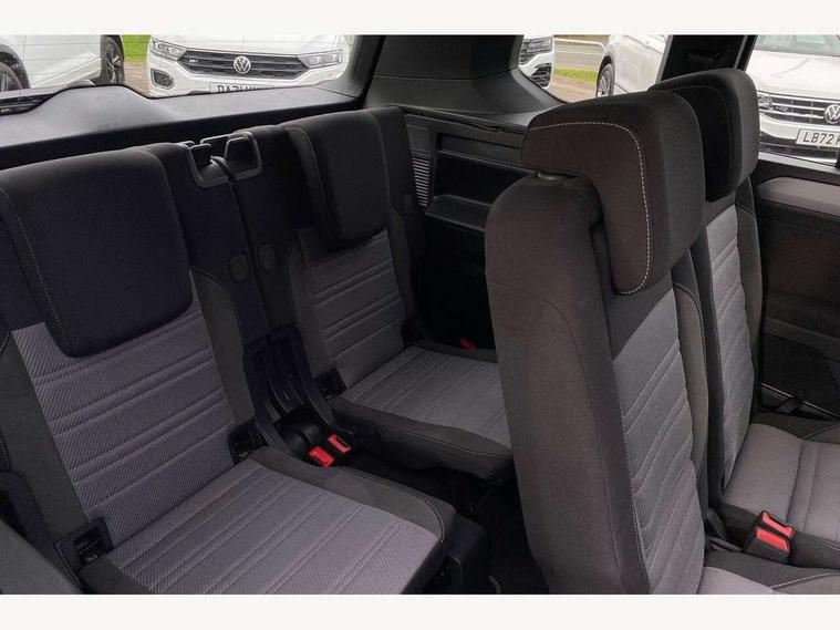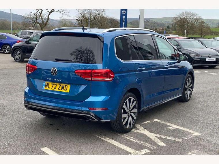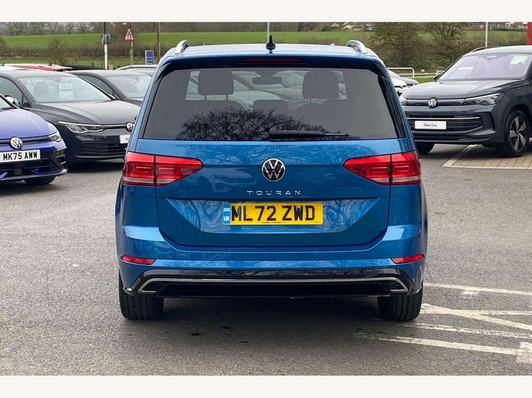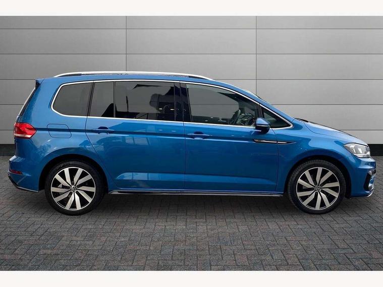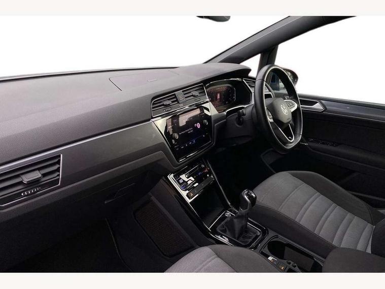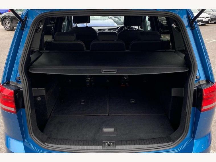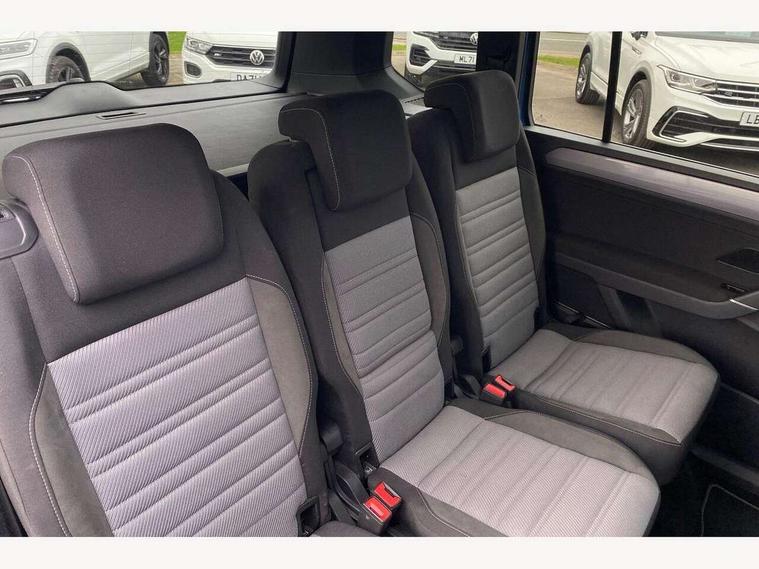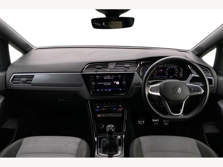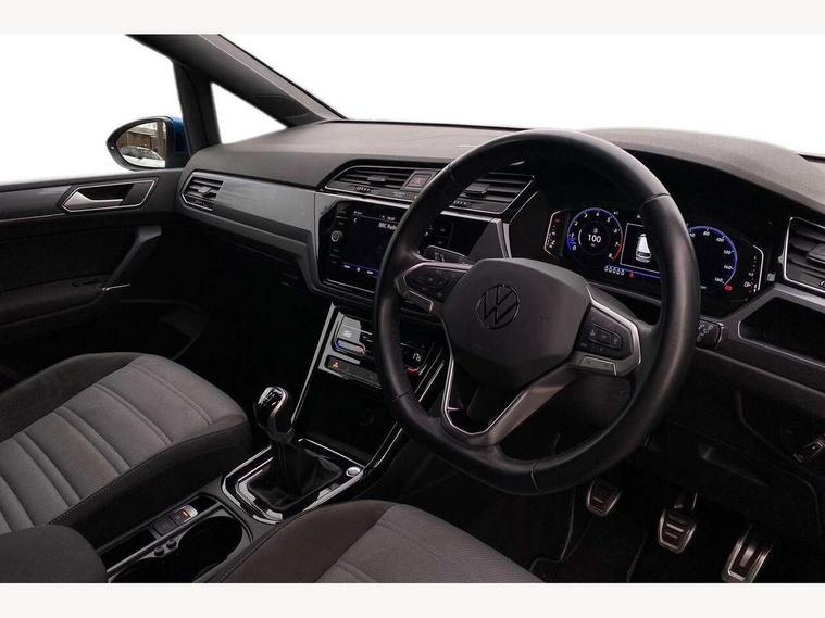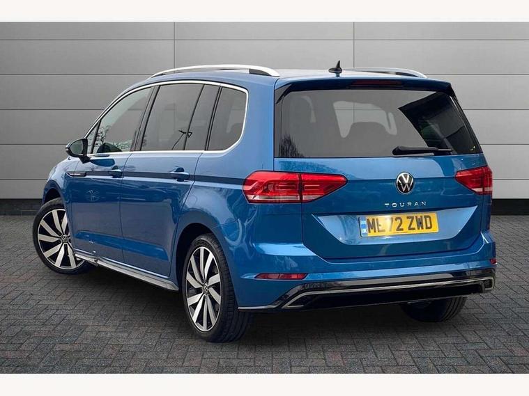 Adaptive cruise control, Audible lights on warning, Bluetooth telephone connectivity, Car information display, Digital cockpit, Discover nav, Euro 2D/3D map view+6.5" colour touchscreen CD + Radio, European map data, Car net guide/inform, Driver alert system, Driver electronic voice amplification function, Driver profile selection, Electronic odometer, Emergency services call system, Extended, crash-active and proactive Pedestrian and cyclist monitoring, External temperature gauge, Lane change system side assist and rear traffic alert, Lane keep assist, Mobile pairing with SMS function, Multifunction colour display, Rev counter with fuel gauge, Speed limiter, Speed sensitive power steering, Stop/start system, Think blue trainer driver tips and journey analysis, Trip and service interval display, Wireless app connect, Petrol Particulate Filter, XDS electronic differential lock, 4x20 watt output, 8 speakers, Audio Connectivity System, DAB Digital radio, External USB-C data socket with increased charging performance - 2 USB sockets 45W, MP3/WMA compatability, SD card slot, Title and cover art display, USB connection, Aerial integrated into side window, Auto dimming door mirrors, on driver side, surround lighting and front passenger side mirror lowering function, Auto dimming rear view mirror, Automatic coming/leaving home lighting function, Body colour bumpers, Body colour door handles, Body colour door mirrors with integral indicators, Chrome fog light surround, Chrome lower front bumper insert, Chrome trimmed front air intake surrounds, Chrome trimmed radiator grille louvre inserts, Chrome trimmed side windows, Dusk sensor + auto driving lights, Front and rear electric windows, Fully galvanised body, Gloss black finish B pillar, Green tinted heat insulating glass, High level third brake light, Rain sensor, Rear side wing doors, Rear tinted glass from B-pillar backwards approx 65% tinted, Rear wash/wipe with intermittent wipe setting, Silver roof rails, Tailgate wiper- reverse gear activation, Twin chrome exhaust tailpipes, Unique R Line badging, Volkswagen roundel, Windscreen wipers intermittent wipe, 12V power point for Row 2, 12V socket in luggage compartment, 2 individual fold flat 3rd row seats, 2 three point seatbelts in 3rd row, 2nd row centre armrest, 2nd row centre seat converts into table, 3 single slide/fold/removable 2nd row seats, 3 Zone electronic climate control with automatic air recirculation, 3x3 point seatbelts on 2nd row with height adjust on outer seats, 4 boot load lashing points, 4 way adjustable front head restraints, 5 headrests, Aluminium kick plate, Ambient lighting in door trim and foot well, Black roof lining, Driver and front passenger under seat drawer, Dust/pollen filters, Foldable front passenger seat backrest, Front + rear carpet mats, Front and rear reading lights, Front centre armrest with storage compartment, Front comfort seats with lumbar support, Front cupholders x 2, Front passenger seat height adjust, Front seat R Line logo with rear seat backrest, Front seat storage pockets, Front seatback folding tables, Front seats with R-Line logo, Grey stitching on steering wheel, Height adjustable driver's seat, Height/reach adjust steering wheel, Illuminated glovebox, Illuminated vanity mirrors, Instrument lighting white adjustable panel illumination with red night time illumination, Interior light with delay, Isofix on 2nd row outer seats, Isofix on 3rd row seats, Large storage compartment in roof console, Leather multifunction steering wheel with gear knob, Leatherette on rear of front seats, Low tunnel 2nd row seat, Luggage compartment lighting, Media box in dashboard on passenger side, Multi storage in passenger/luggage areas, Multi-function centre console with storage facilities, R-Line door sill protectors, Race cloth with San remo microfibre side bolsters, Retractable luggage cover, Split folding rear seat backrests, Stainless steel pedals, Storage bins on all doors, Mirror pack - Touran, R line styling pack - Touran, 3 point height adjustable front seatbelts, Auto hold function, Automatic post collision braking system, Door open warning reflectors, Driver/Front Passenger airbags, Drivers knee airbag, EDL + ASR, Electrically operated child locks on rear doors, Electronic parking brake, Energy recovery system, ESC with ABS, First aid kit, Front and rear (row 2) curtain airbags, Front assist including city emergency braking, Front seat side impact airbags, Front seatbelt pretensioners, Front/rear disc brakes, HBA (Hydraulic Brake Assist), Hill hold control, Loose wheel warning function, Passenger airbag deactivation system, Pre crash preventive occupant protection, Proactive passenger protection system with front and side assist, Rear child proof door locks, Seatbelt warning lamp and buzzer, Traction control, Two tone horn, Warning triangle, Alarm with remote central locking and interior protection, Electronic engine immobiliser, Black lead grey decorative inserts dash and door panel, Chrome plated instrument surrounds, Embroidered emblems to headrestraints, 18" Marseille alloy wheels with self sealing tyres and anti-theft wheel bolts,
