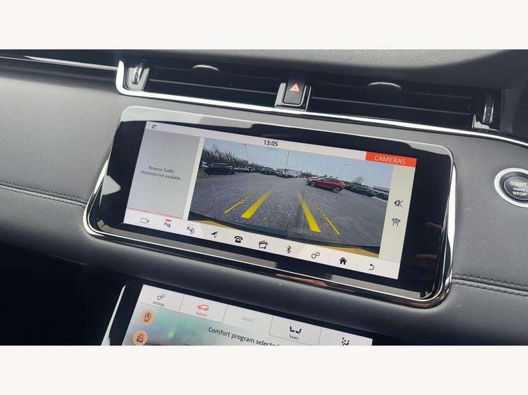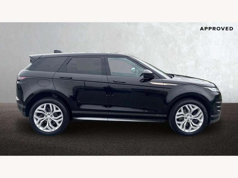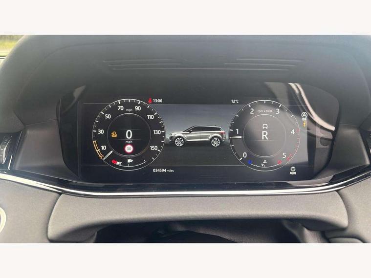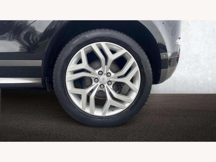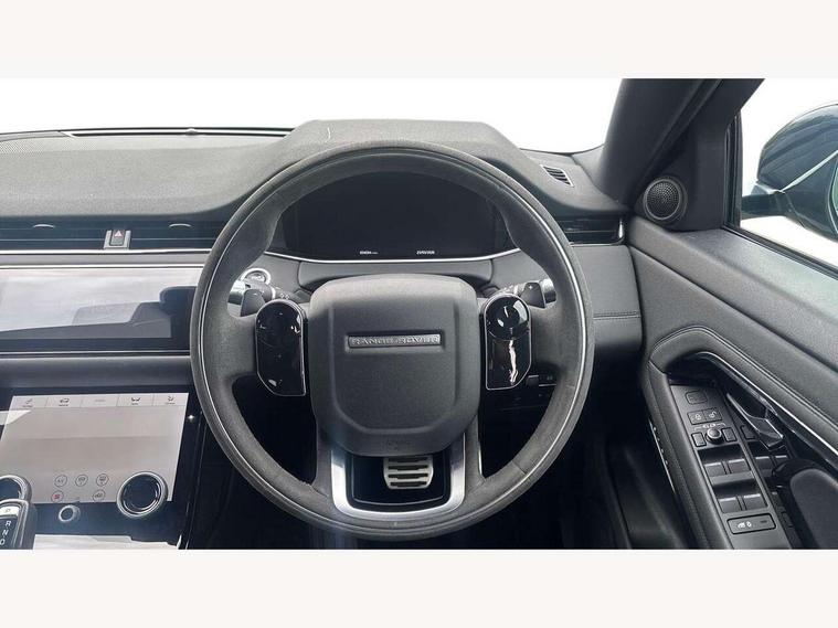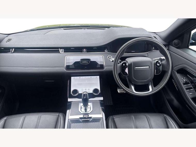 360 degree parking aid, Android Auto, Apple car play, Bluetooth connectivity, Brake pad wear indicator warning light, Clear exit monitor, Driver condition monitor, Duo touch pro, Electronic power assisted steering (EPAS), InControl remote, Interactive Driver display instrument cluster, Land Rover InControl apps, Lane keep assist, Navigation pro system, Park assist - Parallel, perpendicular and parking exit, Pro services and wifi hotspot, Push button starter, Rear traffic monitor, Smart settings, Traffic sign recognition with adaptive speed limiter, Voice control system, All terrain progress control, Efficient Driveline, Passive suspension, Terrain Response 2 Auto, Digital Audio Broadcast radio-DAB, Steering wheel mounted controls, Automatic headlight levelling, Electric windows with one touch open/close and anti trap, Evoque and R-Dynamic badge, Flush deployable exterior door handles, Heated rear window with timer, Heated washer jets, Heated windscreen, Power fold, auto-dimming, heated door mirrors with memory and approach lights, Rain sensing windscreen wipers, Rear fog lights, Shadow atlas bonnet and tailgate script, Tailgate spoiler, 40:20:40 split folding rear seats, Black gearshift paddles, Bright metal pedals, Isofix system on outer rear seats, Overhead lighting console, Overhead stowage for sunglasses, Passive front head restraints, Rear air vents, Rear centre headrest, Sunvisors with illuminated vanity mirrors, Twin front cupholders with cover, Twin sliding front centre armrest, Two zone climate control, Anti-lock braking system (ABS), Customer configurable autolock, DSC - Dynamic Stability Control, Electronic brake force distribution, Electronic parking brake, Electronic traction control, Front and rear seatbelt reminder, Hill descent control, Hill launch assist, Low traction launch, Power operated child locks, Roll stability control, Six airbags - Driver and passenger airbags/driver knee airbag/front side airbag and curtain airbags, Torque vectoring brake, Tyre pressure monitoring system, Alarm, Immobiliser, Intrusion sensor, Locking wheel nuts,