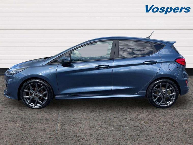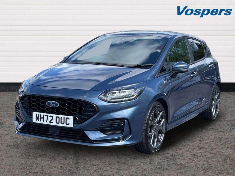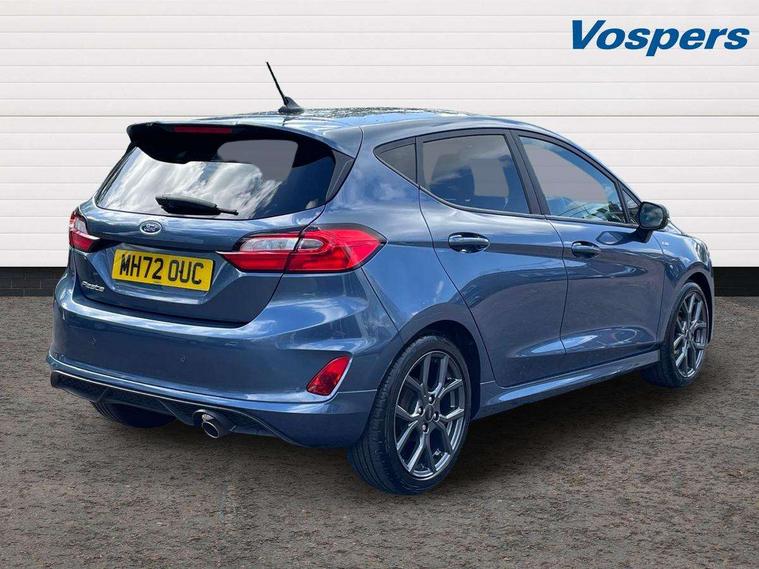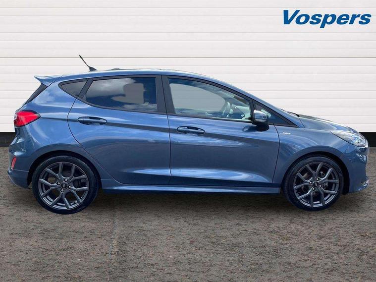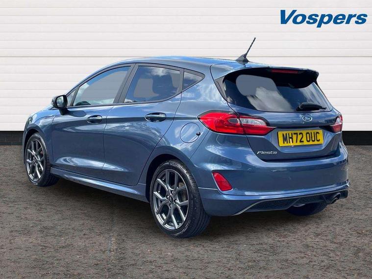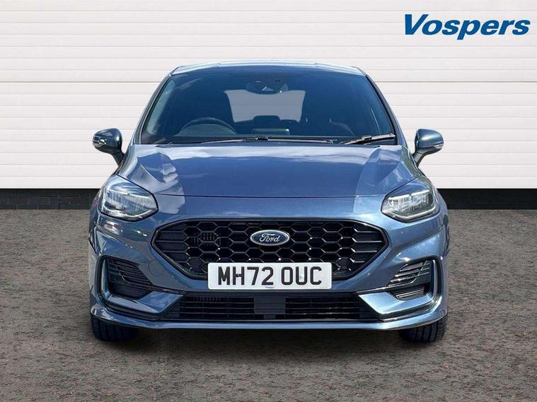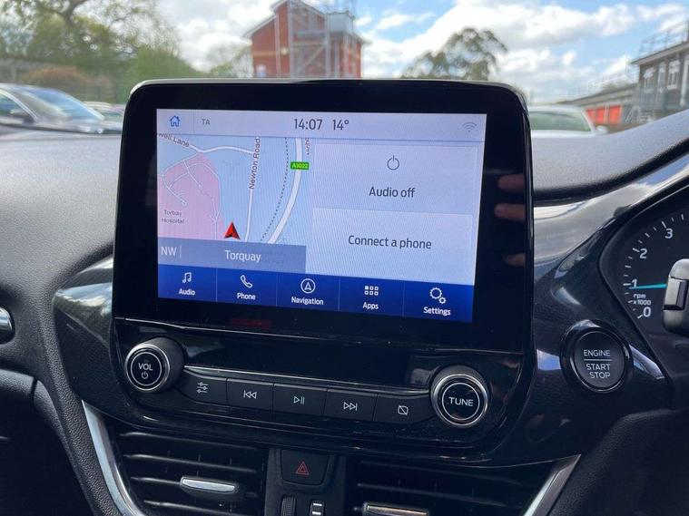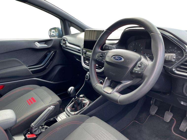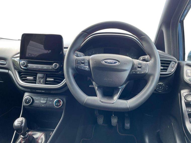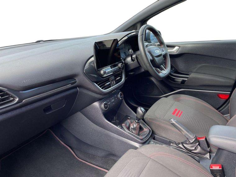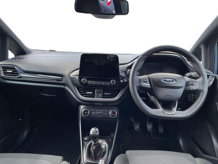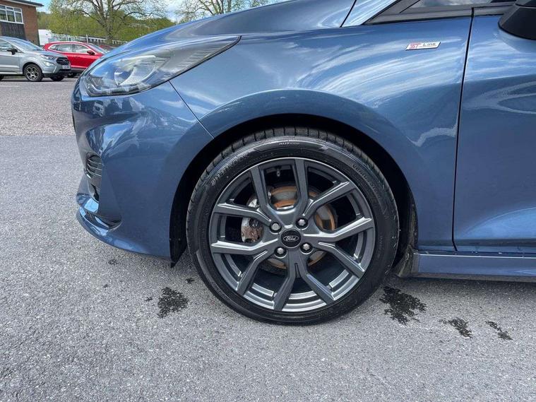 4.2" Colour TFT Ice blue illumination analogue cluster, Driver alert system, Electric power steering, Ford easy fuel, Lane keep assist, Lane keeping aid, Rear parking distance sensors, Selectable drive modes (Normal, Sport, Track), Trip computer, Sports suspension, 3rd brake light, Auto high beam, Automatic headlights, Body colour bumpers, Body colour large rear spoiler, Body coloured electrically operated with side indicators, Electric front windows/one touch facility, Electric rear windows, Quickclear heated windscreen, Rain sensing wipers and auto dimming rear view mirror, Rear privacy glass, Rear side wing doors, Rear wiper, Unique ST-Line grille, full bodystyling kit and large body coloured rear spoiler, 3 rear headrests, 3 seat bench in 2nd row, Adjustable head restraints, Black headlining, Centre console with opening armrest, 2x cupholders, 12v and USB, Cloth upholstery with red stitching, Leather gear knob, Manual 2 way passenger seat adjust, Manual 4-way driver seat adjust, Manual air conditioning, Premium floor mats, Sensico wrapped steering wheel, Single front passenger seat, 3 point seatbelts on all rear seats, Electronic stability control with hill start assist, Front and rear seat belt warning, Manual child lock in rear doors, Tyre pressure monitoring system, Keyless start with 'Ford Power' starter button, MyKey system, Remote central locking, Thatcham alarm with power door dead locks, 17" 5x2 spoke alloy wheels with rock metallic finish,
