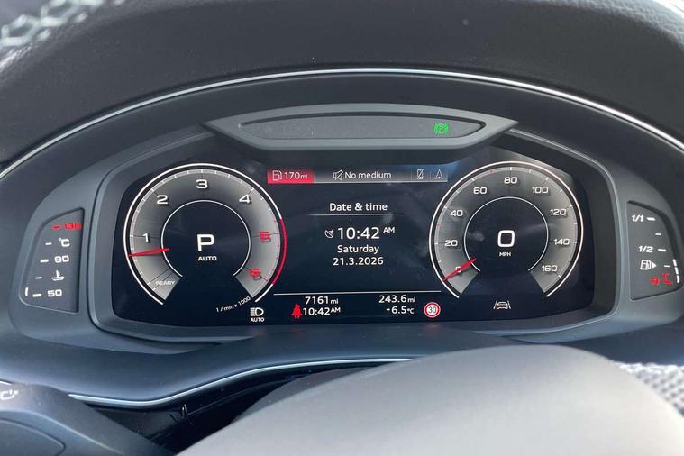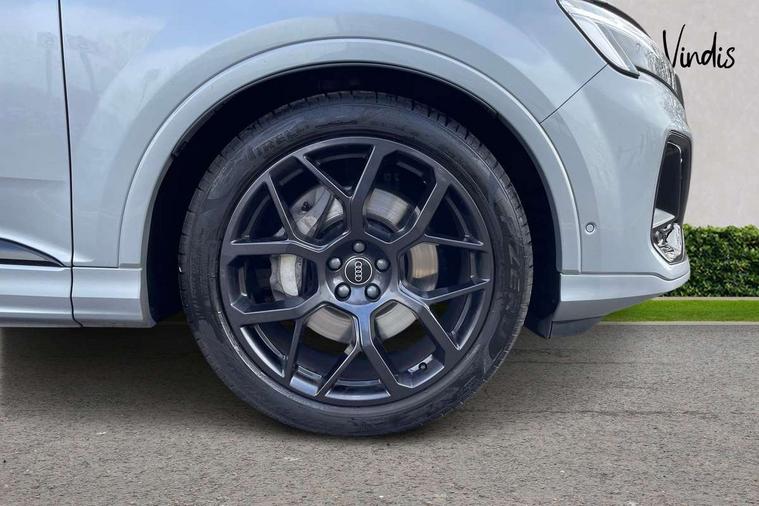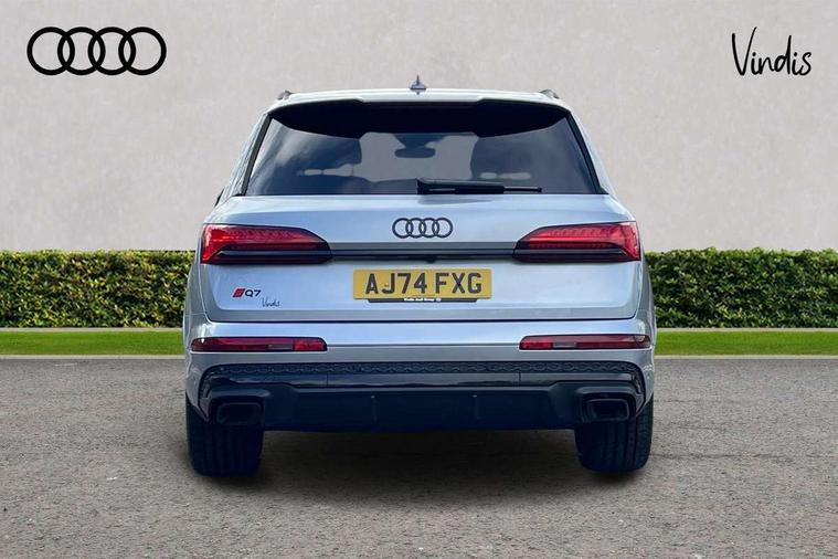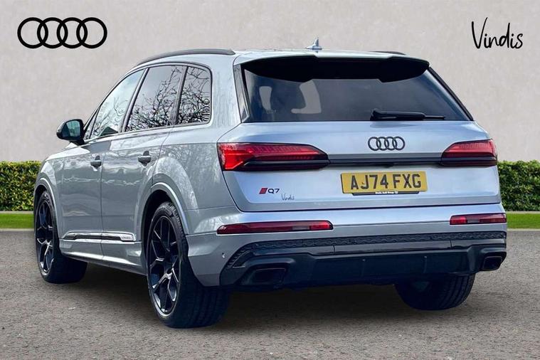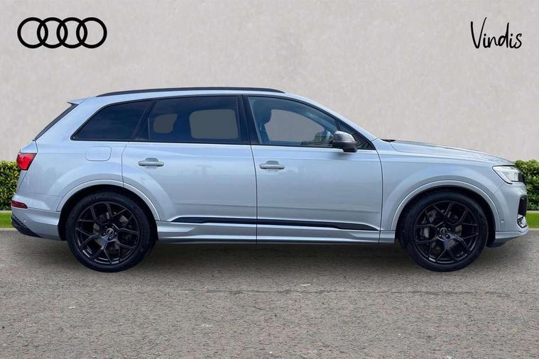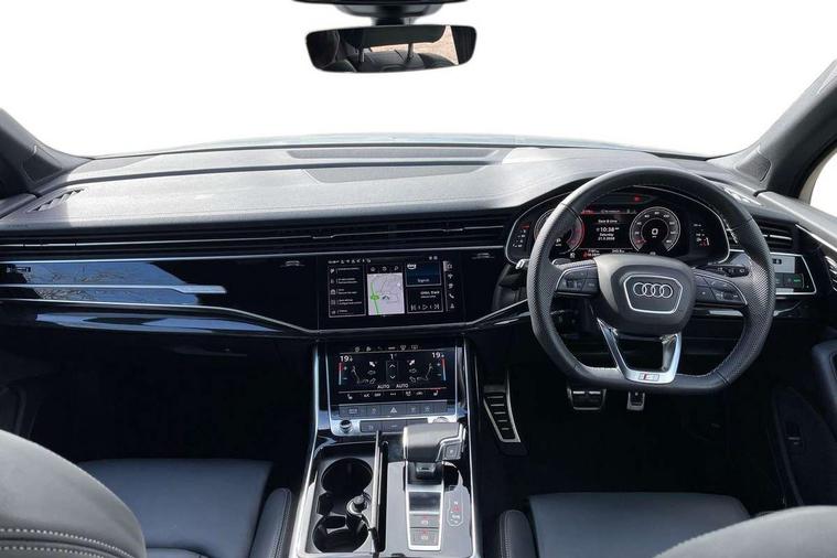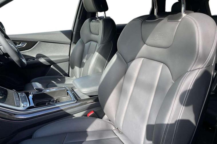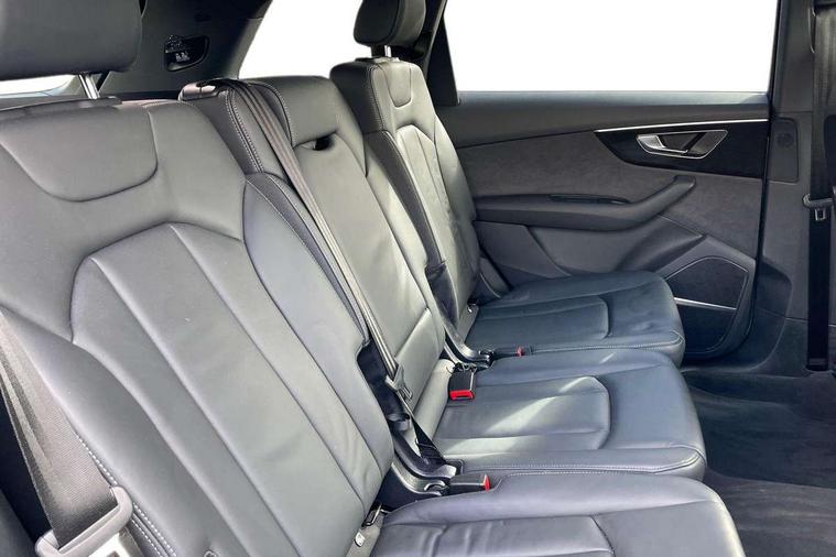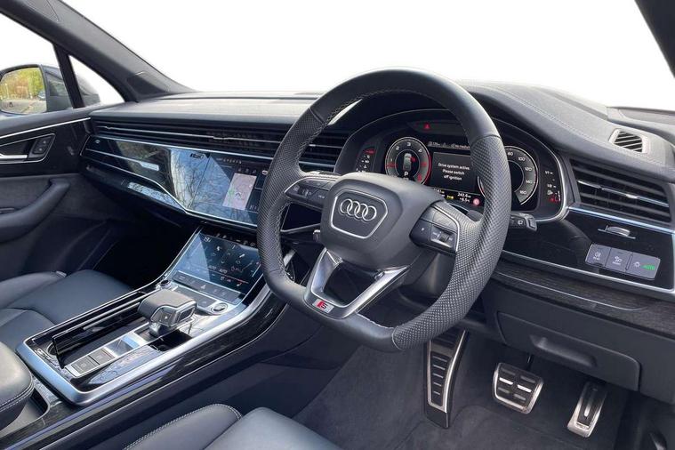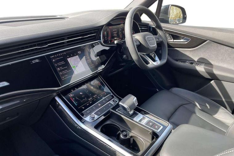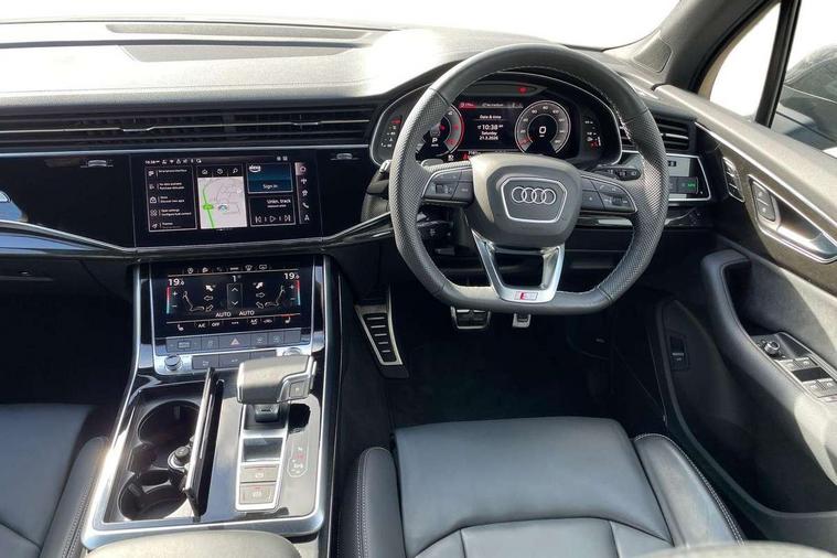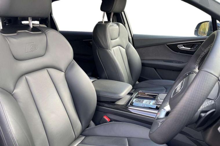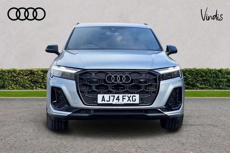 Audi connect safety and service (e-call), Audi connect with Amazon Alexa Integration, Audi drive select (Auto, Comfort, Dynamic, Efficiency, Individual, Off-road and All road), Audi phone box light with wireless charging, Audi virtual cockpit - 12.3" high-resolution LCD display with fully customisable instrument cluster, Bluetooth interface, Camera based traffic sign recognition, Electromechanical power steering, MMI navigation plus with MMI touch screens includes 10.1" and 8.6" screens with haptic feedback, Natural voice recognition, Operating buttons in Matte black, Parking system plus with 360 degree display (front, rear and side sensors) - acoustic and visual park assist system, Power operated tailgate, Rear view camera, Smartphone interface includes wireless Apple carplay/Android Auto, Start/stop system, 48V Mild hybrid technology, Adaptive air sports suspension, Quattro all wheel drive with self locking centre differential, Audi music interface - front 2 USB-C ports with charger and data functions, Audi sound system with 6 channel amplifier, 180 watt amplifying capacity and 10 loudspeakers including subwoofer, DAB digital radio module, Audi Beam uses LEDs to project S emblem with red rhombus onto the ground when opening the side doors (front/rear), Auto dimming frameless rear view mirror, Black exhausts, Black roof rails, Electrically adj heated/folding + automatically dimming exterior mirrors with memory + automatic kerb side function for passenger side exterior mirror, Heat insulating glass in windshield, Integrated LED indications in door mirrors, LED 3rd brake light, LED daytime running lights, LED rear tail lights, Loading edge protection in stainless steel, Matrix LED headlights with dynamic front and rear indicators, Privacy glass - dark tinted rear and rear side windows from B-pillar backwards, Rear side wing doors, Rear wiper, 2 seat bench in 3rd row, 2 zone automatic climate control, 3 seat bench in 2nd row, 7 seat layout with ISOFIX points for the front passenger seat and rear passenger seat, Black cloth headlining, Comfort front centre armrest, Electric adjustable front seat with 4 way lumbar support, driver memory functionality, Folding rear seats, Front head restraints, Front/rear floor mats, Heated front seats, Illuminated door sill trims with S logo, ISOFIX child seat mounting for front passenger seat and 2 outer rear seats with top tether child seat mounting for all 3 rear seats, LED interior ambient lighting, Luggage compartment cover, Luggage compartment sill protection in stainless steel, Rear head restraints, Single front passenger seat, Stainless steel pedals, Sunvisors with illuminated vanity mirrors, Black styling pack plus - Q7, 3 point seatbelts on all rear seats, Audi pre sense front, Child locks on rear doors, Convenience key with safelock and gesture tailgate, Driver and front passenger, front side and curtain airbags, Electromechanical parking brake, Electronic Stabilisation Control (ESC) including ABS, ASR and EDL, Extended pedestrian protection measures, Hill hold assist, Seatbelt reminder, Tyre pressure loss indicator, Warning triangle and first aid kit, Anti theft alarm with tow away protection, Anti-theft wheel bolts and wheel loosening detection, Keyless Go, Remote central locking, Polished oak trim with grey finish inlay, Tool kit, Tyre repair kit,