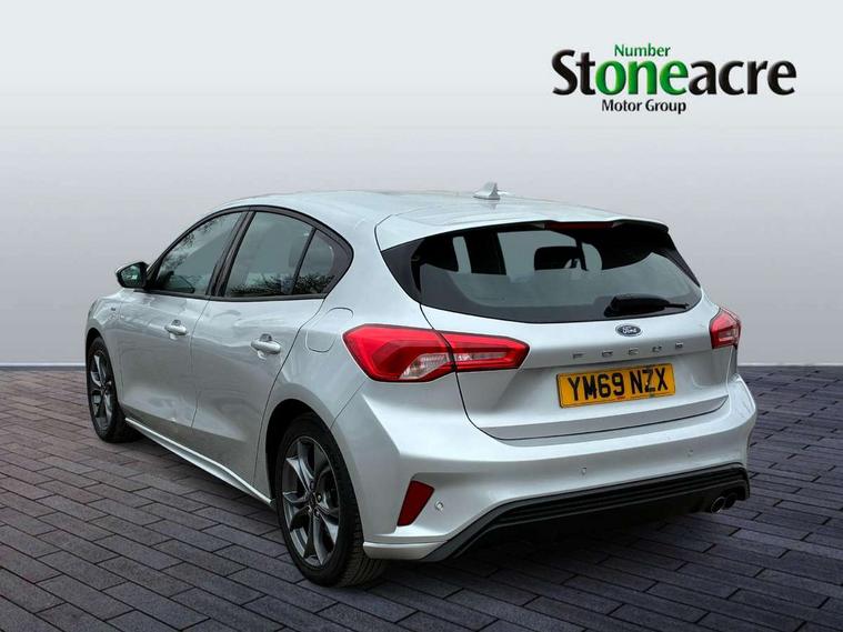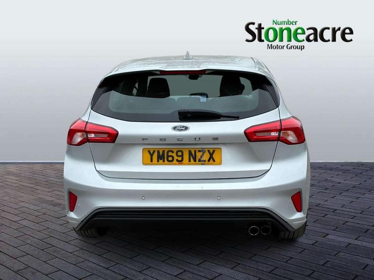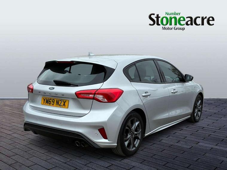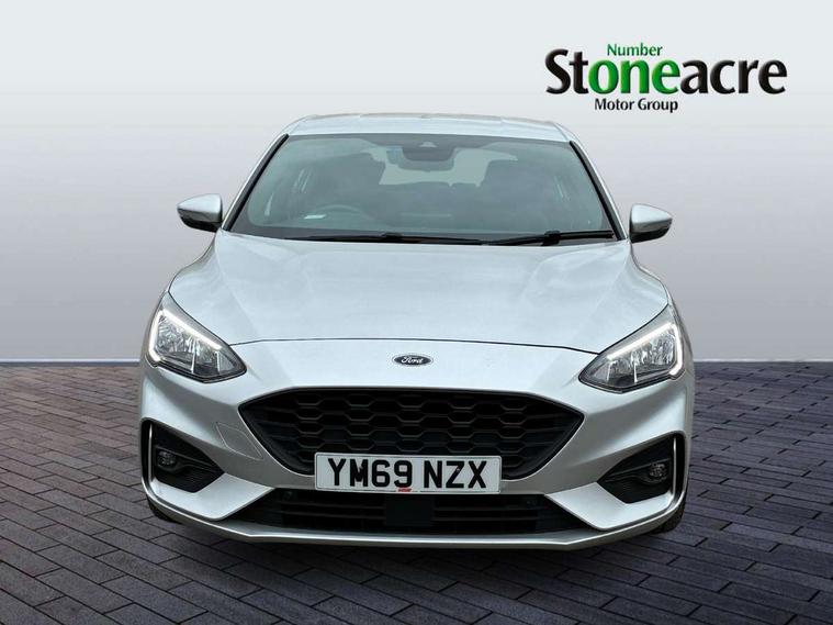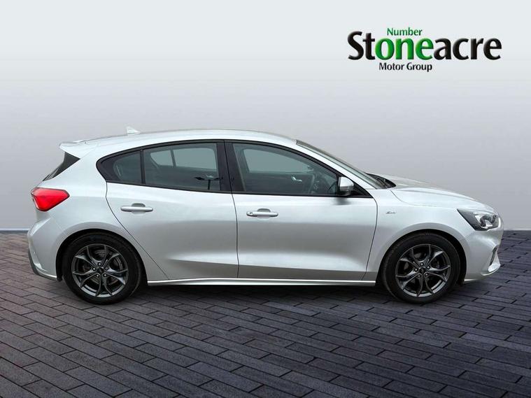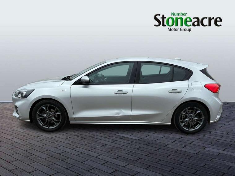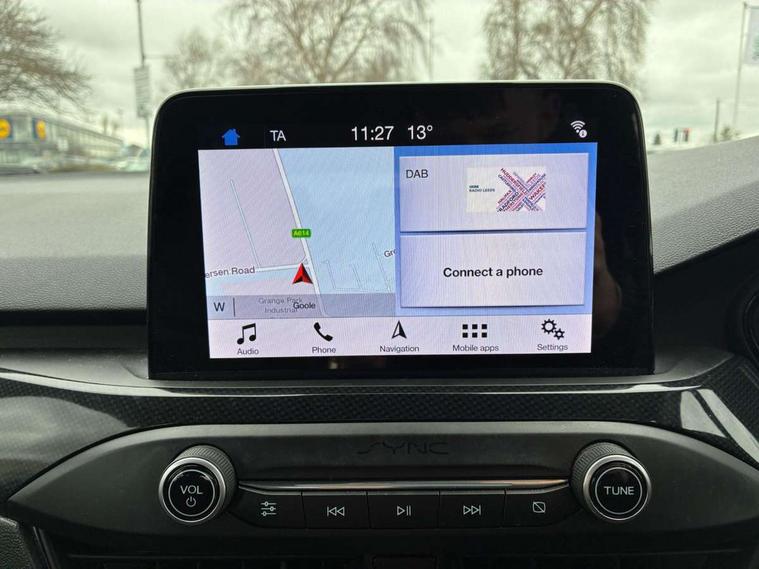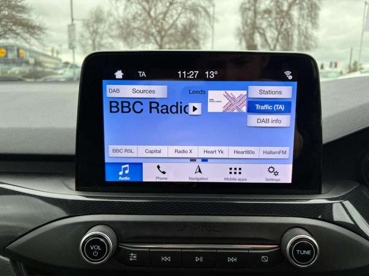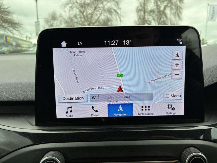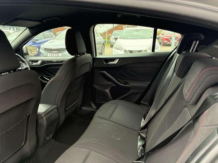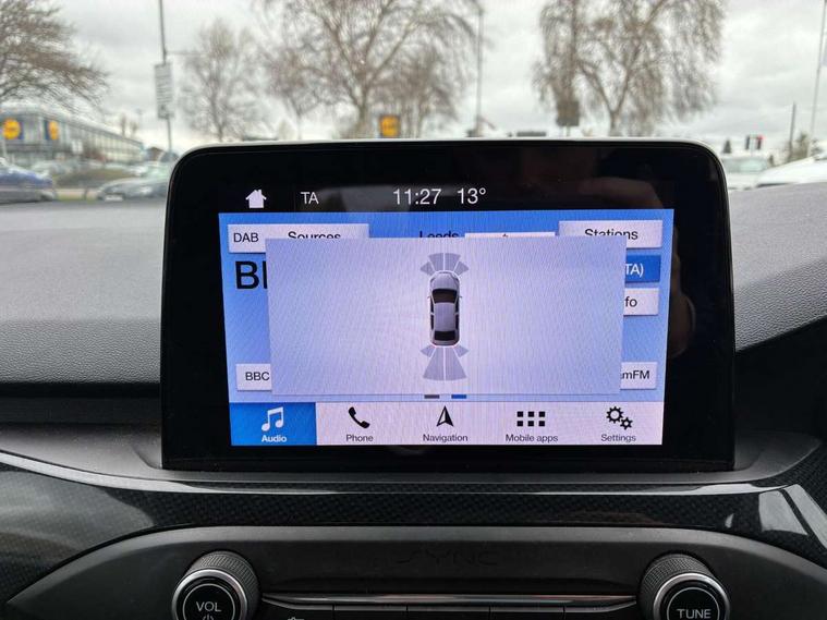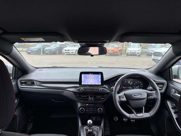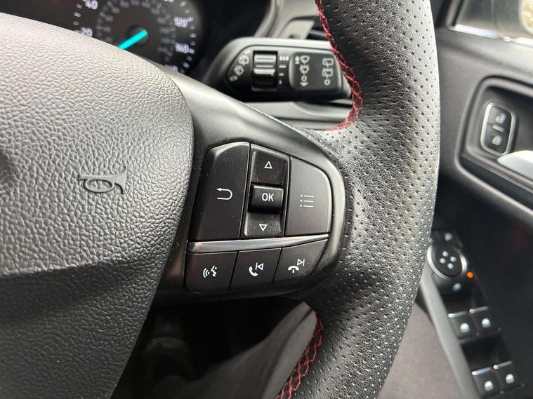 Bluetooth system, Digital clock, Easy fuel capless refuelling system, Eco mode, Ford pass connect, Ford SYNC 3 with 8" TFT touchscreen, and app link Android auto/Apple carplay, Intelligent speed assist, Lane keeping aid with lane departure warning, PAS, Selectable drive mode, Trip computer, Sports tuned suspension, 6 speakers, Aux input, 'Quickclear' heated windscreen/heated washer jets, Auto headlamps (on/off), Body colour large rear spoiler, Body colour side skirt, Body coloured bumpers, Body coloured door handles, Body coloured electrically operated and heated door mirrors with side indicators, Electrically operated front and rear windows with one touch opening and closing, Front variable intermittent wipers with electric wash, Halogen reflector headlamps, Heated rear window, LED daytime running lamp, LED front fog lamps with cornering function, Polished twin tailpipe, ST-Line upper and lower grille with full body styling kit and wing badges, Tailgate wash/wipe, 3 spoke flat bottomed leather steering wheel with red stitching, 60/40 split back and cushion rear seats with 2 height adjustable headrests, Alloy finish pedals, Aluminium gear knob, Centre console with armrest, Cloth upholstery with red stitching, Dark headliner, Driver's lumbar support, Front floor mats, Height adjustable front headrests, Isofix child seat preparation, Manual air conditioning, Reach + rake adjustable steering column, Rear centre headrest, ABS+Electronic Brake force Distribution, Auto hold function, Driver airbag, Electronic parking brake, Electronic stability control, Front and rear seatbelt reminder, Front inertia reel height adjustable seatbelts with pre-tensioners, Front passenger airbag, Front side airbags, Hill start assist, Passenger airbag deactivate switch, Post collision braking, Pre collision assist with autonomous emergency braking and pedestrian/cyclist detection, Side curtain airbags, Three rear inertia reel lap/diagonal seatbelts, Tyre pressure monitoring system, Keyless start with 'Ford Power' starter button, MyKey system, Remote central locking & engine immobiliser, Thatcham category 1 alarm, Contrast stitching - Red, 17" 5x2 spoke alloy wheels with rock metallic finish, Mini steel spare wheel,