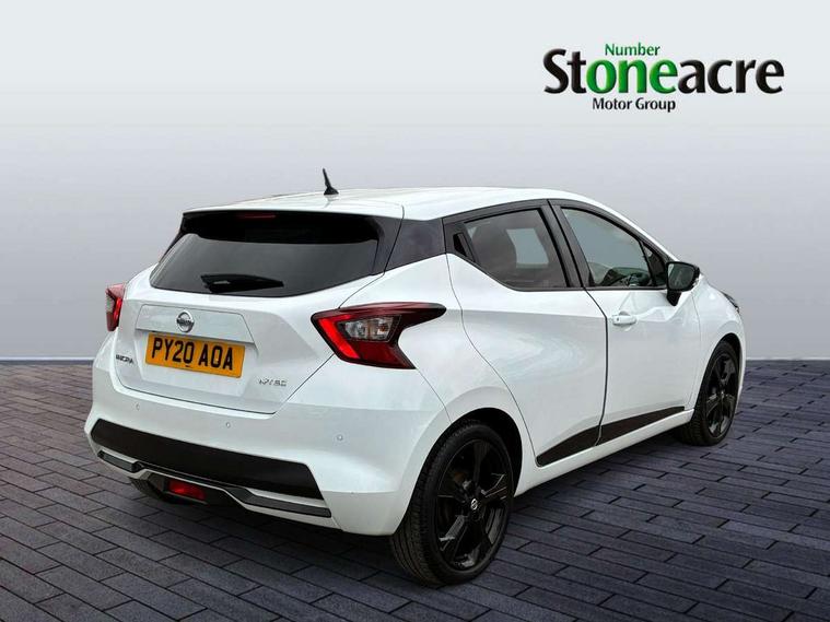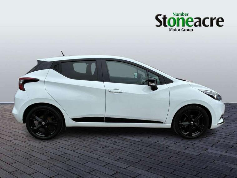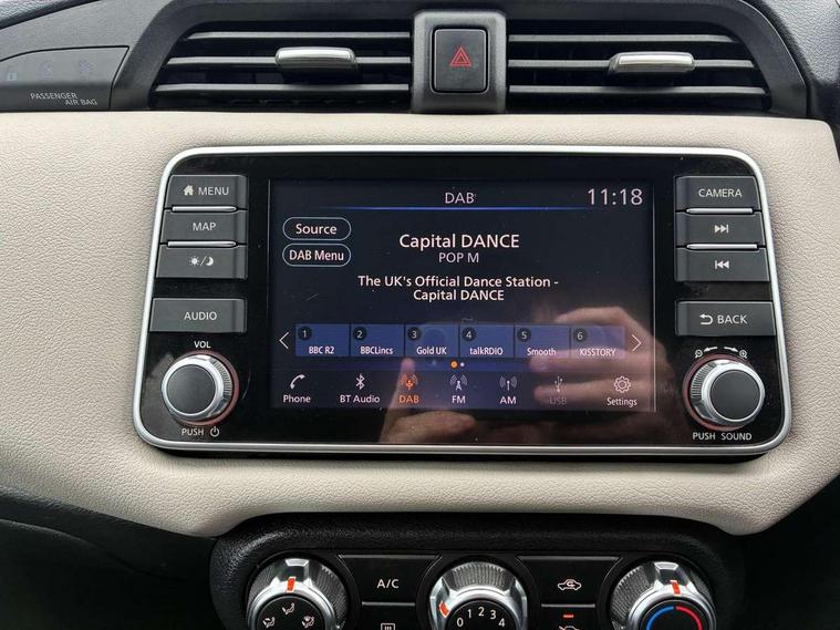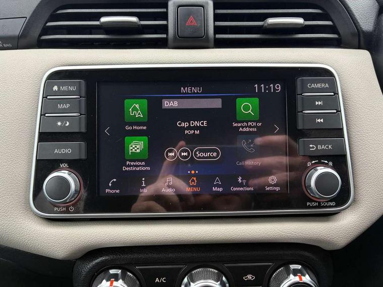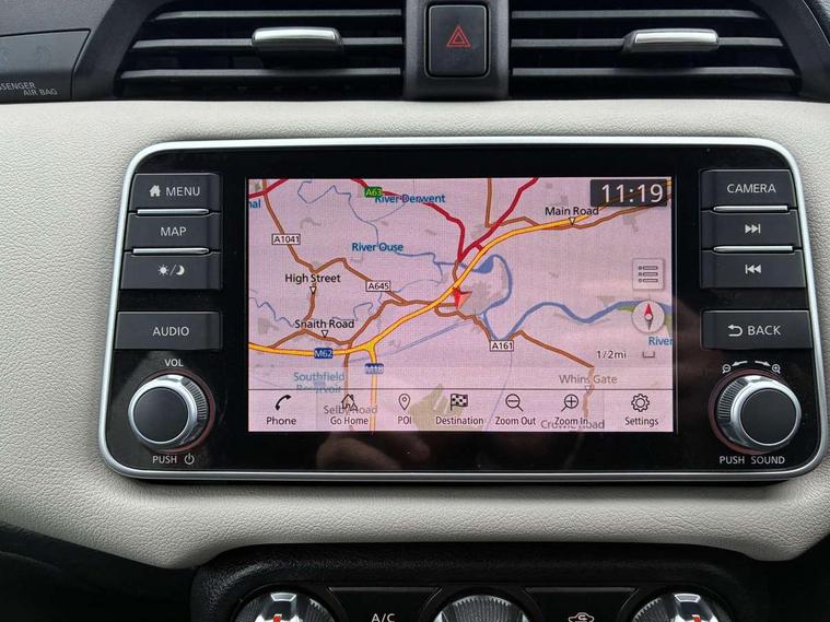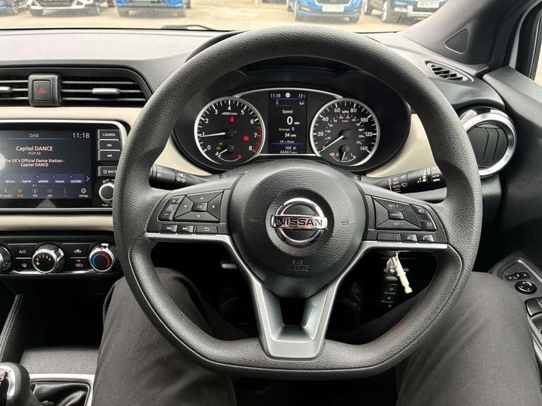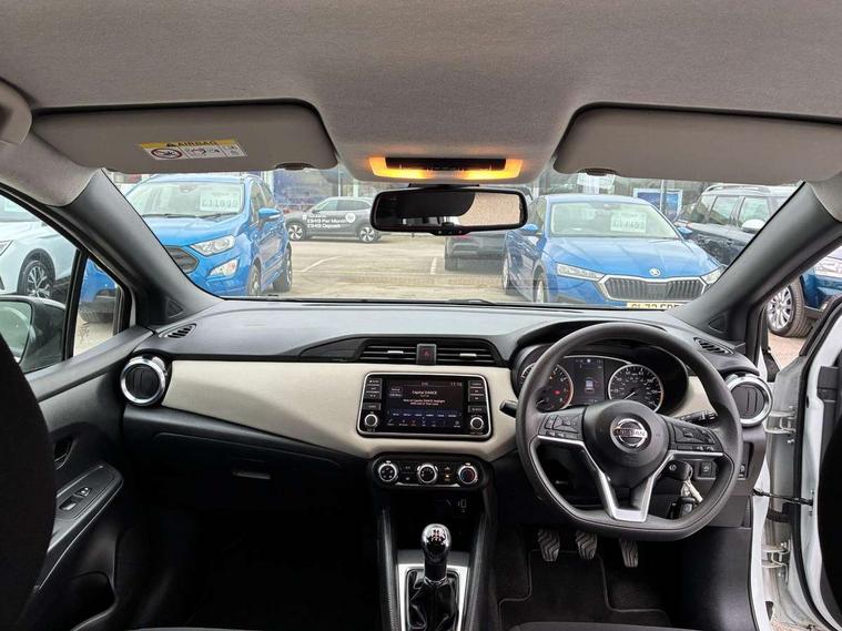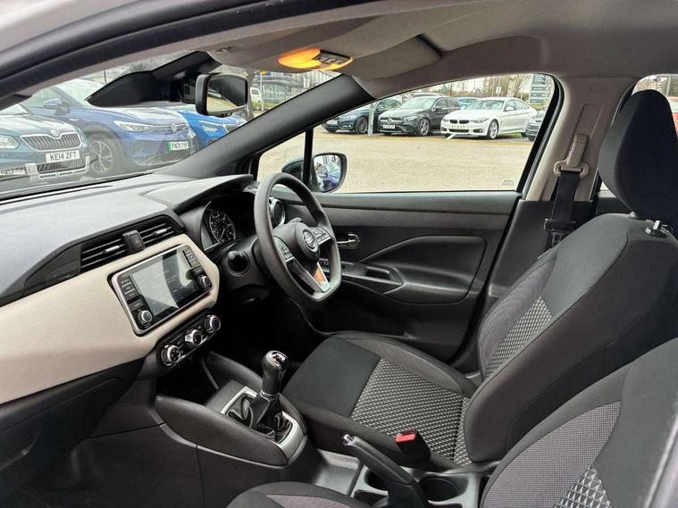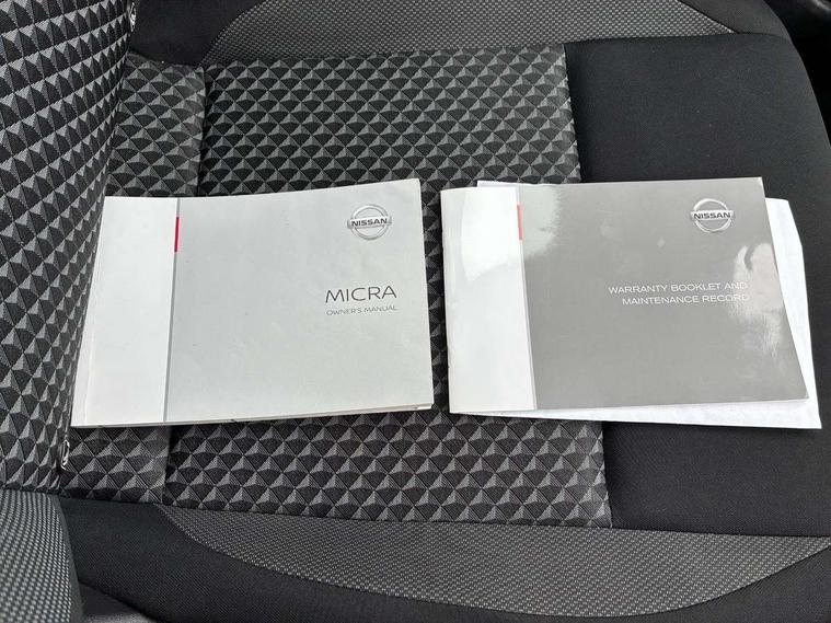 Adjustable speed limiter, Advanced drive assist display 5'' TFT coloured screen, Bluetooth system, Cruise control, Lane departure prevention, Lane departure warning system, Nissan Connect touchscreen navigation and Entertainment system, Outside temperature gauge, Power assist steering, Rear parking sensors and rear view camera, Service interval indicator, Smartphone integration with Apple CarPlay and Android auto, Stop/start system, Tomtom connected services, Traffic sign recognition, Trip computer, 4 speakers, Audio system with MP3, Aux-in socket, DAB Digital radio, Steering wheel mounted audio controls, USB/iPod connection, 4 pocket halogen headlights with signature finisher, Antenna, Automatic activation of hazard warning lights, Automatic headlights with dusk sensor, Body colour front door handles, Concealed rear door handles, Door mirror integrated indicators, Electrically adjustable door mirrors, Front fog lights, High beam assist, High mounted stop lamp, Jacknife key type x1, LED signature daytime running lights, N-Tec badge, Power front windows, Rain sensor windscreen wipers, Rear privacy glass, Rear roof spoiler, Rear wiper, Rear wiper with reverse link, 12V power point front, 2 height adjustable rear headrests, 3 cupholders, 60/40 split folding rear seat, Boot compartment cover, Boot light, Casual cloth upholstery, Chrome interior door handles, Driver's seat manual height adjust, Driver/passenger sunvisors and vanity mirrors, Front and rear door pockets with bottle holders, Front console storage box, Gear shift indicator, Grey PVC front door pads, Height adjustable front headrests with satin sliver decoration, Height adjustable steering wheel, Illuminated electric window switch, Isofix front passenger and rear seat preparation, Luggage compartment lighting, Manual air conditioning, Map reading lamp, Parcel shelf, Passenger seat back pocket, Reclining front seats, Satin silver accents on steering wheel, Satin silver air vents, Satin silver decoration on gear knob, Soft knee pad with stitching, Soft touch upper IP with grey PC Insert, Tilt/telescopic adjustable steering wheel, Gloss black personalisation exterior pack - Micra, ABS+EBD+Brake assist, Crash sensor, Driver/Front Passenger airbags, ESP + ASR traction control + CSV understeer control, Forward emergency braking, Front and rear curtain airbags, Front side airbags, Height adjustable front seatbelts with pre-tensioners and load limiters, Hill start assist, Intelligent emergency braking with pedestrian recognition, Passenger airbag deactivation system, Rear seatbelts with pre-tensioners and load limiters, Seatbelt warning, Three 3 point rear seatbelts, Tyre pressure monitoring system, Warning triangle and first aid kit, Anti-theft immobiliser, Remote central locking, 17" Black alloy wheels, Tyre repair kit,