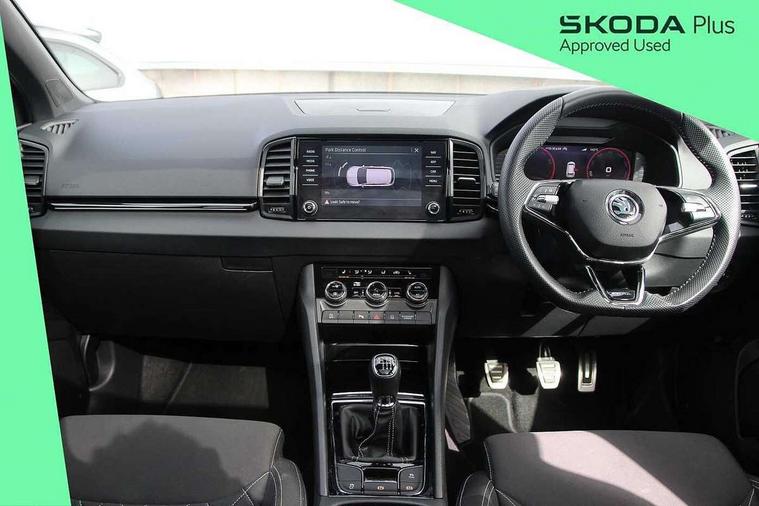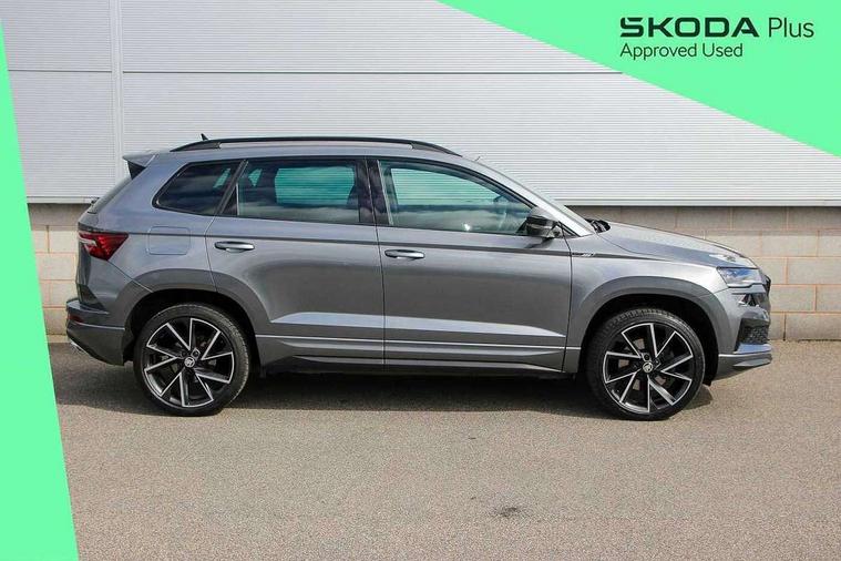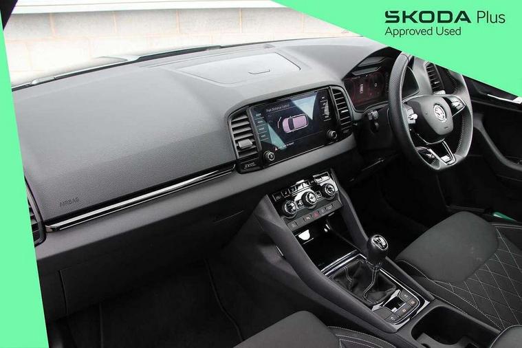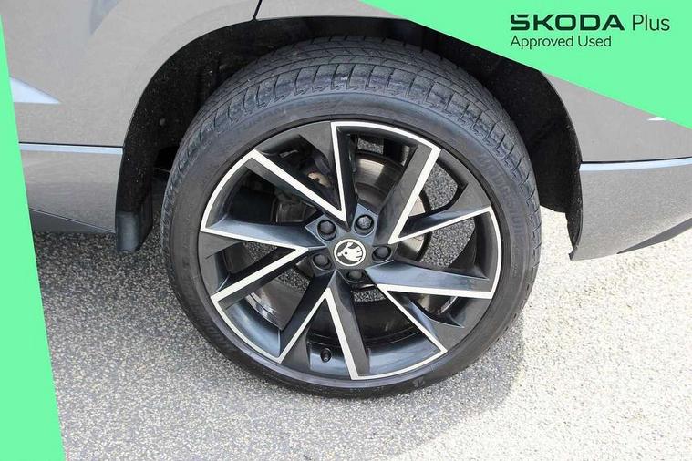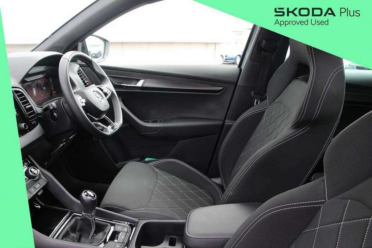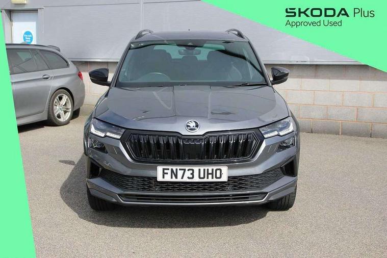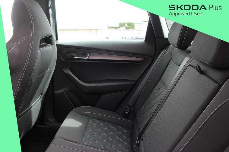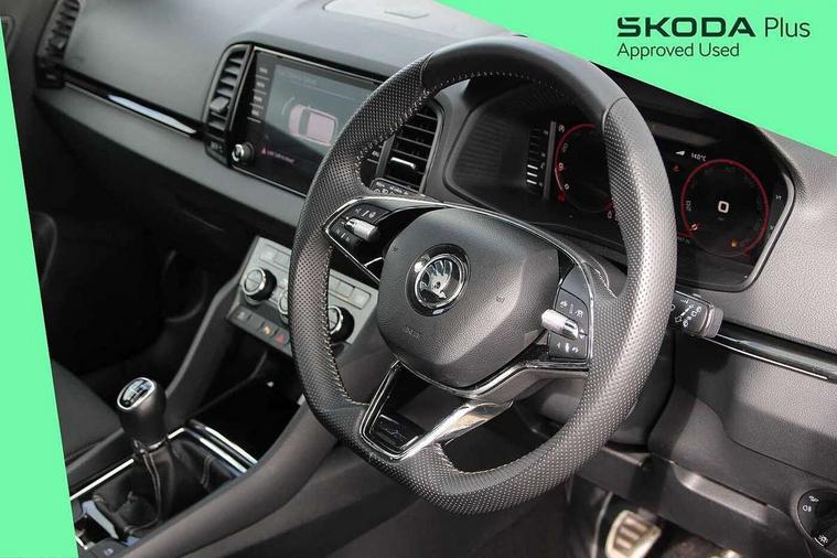 8" Digital display, Care connect, Driver fatigue sensor, Emergency services call system, Outside temperature gauge, Service interval indicator, SmartLink wireless for Apple and wired for Android, Start/stop system with regenerative braking, USB C Port x 2 in front centre console, Virtual cockpit, Virtual pedal with electrically operated boot door, 8 Speakers, DAB radio with Bluetooth, USB connection, Wireless charging without wireless aerial connection, Acoustic glass, Aero front windscreen wipers with intermittent function, Auto dimming rear view mirror with light and rain sensors, Black door mirrors, Black electric window control buttons, Black radiator grille, Black roof rails, Body colour door handles, Electric front and rear windows with child proof lock, Front door steps with SportLine logo, Heated rear windscreen, LED daytime running lights, LED rear lights with high functionality welcome effect and dynamic indicators, Light assistant (coming/leaving home/tunnel light), Panoramic sliding sunroof, Plastic scuff plates, Privacy glass, Protective door side sills in body colour, Rear diffuser, Rear side wing doors, Rear spoiler, Rear window wiper with washer system and intermittent control, Safety reflectors on front doors, Skoda lettering on tailgate in black, Sportline badge on front fender, Sportline decorative inserts with badging, Sports front and rear bumpers, 1.5 litre bottle holders in driver and front passenger door panels, 12V socket in boot, 12v socket in front centre armrest with storage compartment and rear air vents, 3 rear height adjustable headrests, 3 seat bench in 2nd row, 3 spoke leather sports multifunction steering wheel and silver stitching, 4 foldable roof handles with rear coat hooks, Black floor carpet, Black roof headlining, Chrome inner door handles, Double sided boot floor, Foldable hooks in the boot, Front head restraints, Height adjustable front three point seats belts with tensioners, Height/reach adjust steering wheel, Ice scraper, Illuminated glovebox, Illuminated luggage compartment, Isofix child seat preparation outer rear, Manual lumbar support for front seats, Pen holder, Pollen filter, Rear boot cover, Rear reading lights, Rear seats fixed folding and divided 60:40, Rubbish bin door, Safety vest holder, Single front passenger seat, Storage box in upper central dashboard closed, Sunvisors with illuminated vanity mirrors, Textile floor mats, Ticket holder, Titan black interior ceiling, Welcome animation with sportline logo, Boot pack - Karoq, Light Pack - Karoq, Parking pack - Karoq, Automatic door unlocking in case of crash, Automatic fuel cut off in case of crash, Child locks on rear doors, Driver airbag, Electronic parking brake with auto hold function, Emergency rear braking signal, ESC including ABS, MSR, ASR, EDS, HBA, DSR, RBS, MKB and traction control, Front side airbags, Hill hold control, Knee airbags, Passenger airbag with switch-off function, Pedestrian monitor, Seatbelt reminder signalisation and pretensioner for all seats, Three point seatbelts rear, Two tone horn, Tyre pressure display, Tyre pressure monitor, Alarm with interior monitoring, back up horn and tilt sensor with safe function, Electronic engine immobiliser, Keyless entry and start/stop, Remote central locking with 2 remote folding keys, Black air vent surround, Black centre console, Satin black dashboard, Satin black door trim, 19" Sagitarius anthracite alloy wheels with matt black aero inserts, Anti-theft wheel bolts protection, Matt black aero hub caps, Storage on wheel cover, Tool kit,
