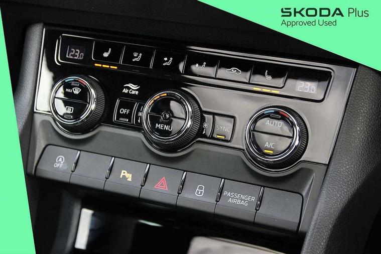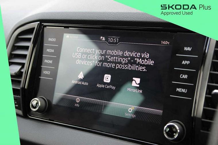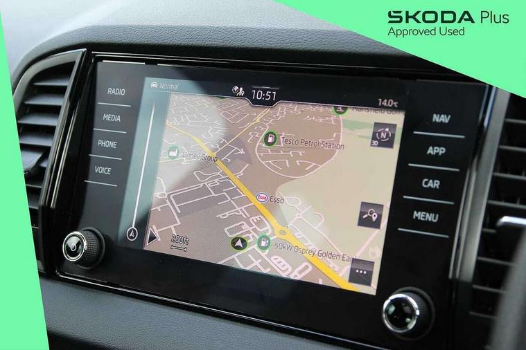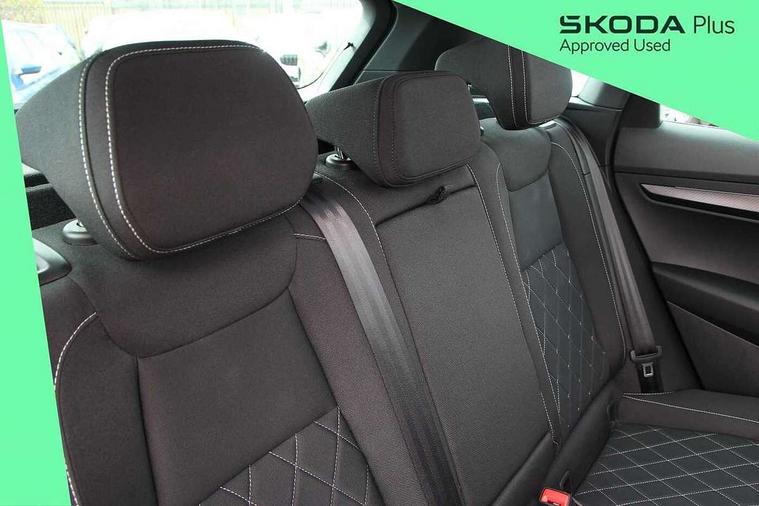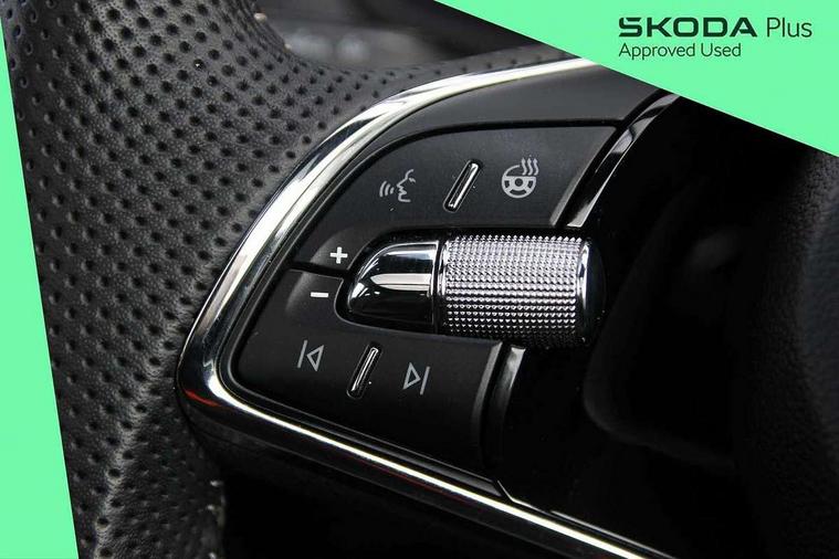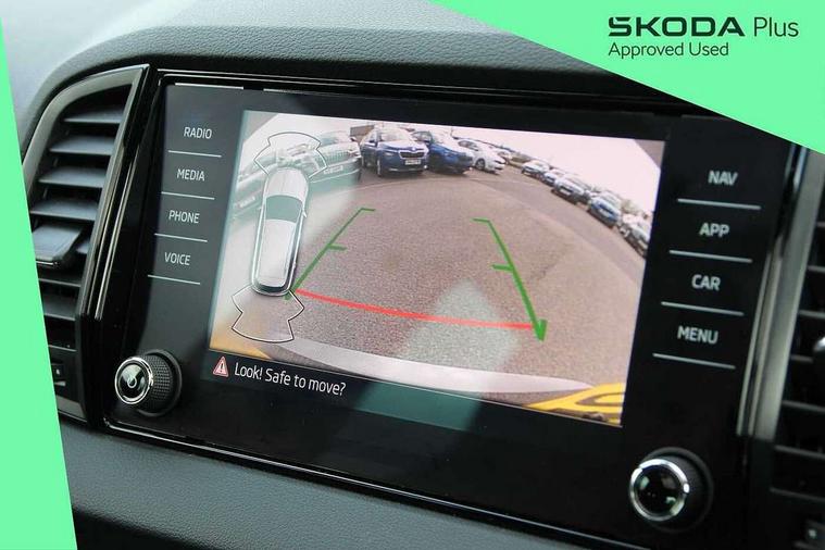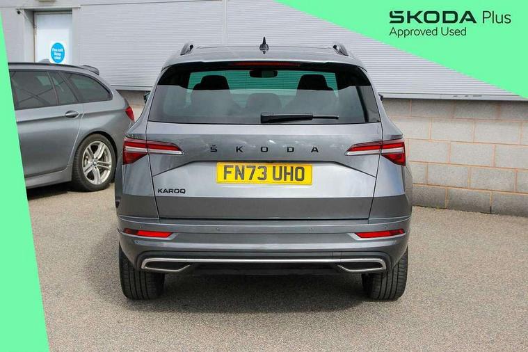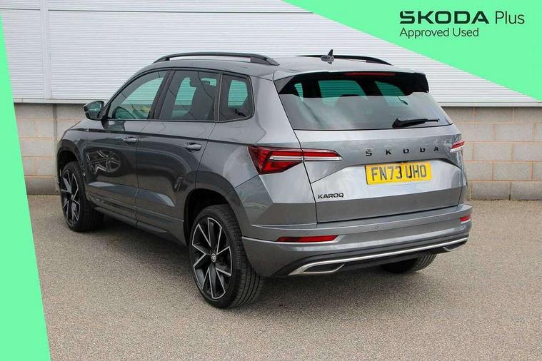 8" Digital display, Care connect, Driver fatigue sensor, Emergency services call system, Outside temperature gauge, Service interval indicator, SmartLink wireless for Apple and wired for Android, Start/stop system with regenerative braking, USB C Port x 2 in front centre console, Virtual cockpit, Virtual pedal with electrically operated boot door, 8 Speakers, DAB radio with Bluetooth, USB connection, Wireless charging without wireless aerial connection, Acoustic glass, Aero front windscreen wipers with intermittent function, Auto dimming rear view mirror with light and rain sensors, Black door mirrors, Black electric window control buttons, Black radiator grille, Black roof rails, Body colour door handles, Electric front and rear windows with child proof lock, Front door steps with SportLine logo, Heated rear windscreen, LED daytime running lights, LED rear lights with high functionality welcome effect and dynamic indicators, Light assistant (coming/leaving home/tunnel light), Panoramic sliding sunroof, Plastic scuff plates, Privacy glass, Protective door side sills in body colour, Rear diffuser, Rear side wing doors, Rear spoiler, Rear window wiper with washer system and intermittent control, Safety reflectors on front doors, Skoda lettering on tailgate in black, Sportline badge on front fender, Sportline decorative inserts with badging, Sports front and rear bumpers, 1.5 litre bottle holders in driver and front passenger door panels, 12V socket in boot, 12v socket in front centre armrest with storage compartment and rear air vents, 3 rear height adjustable headrests, 3 seat bench in 2nd row, 3 spoke leather sports multifunction steering wheel and silver stitching, 4 foldable roof handles with rear coat hooks, Black floor carpet, Black roof headlining, Chrome inner door handles, Double sided boot floor, Foldable hooks in the boot, Front head restraints, Height adjustable front three point seats belts with tensioners, Height/reach adjust steering wheel, Ice scraper, Illuminated glovebox, Illuminated luggage compartment, Isofix child seat preparation outer rear, Manual lumbar support for front seats, Pen holder, Pollen filter, Rear boot cover, Rear reading lights, Rear seats fixed folding and divided 60:40, Rubbish bin door, Safety vest holder, Single front passenger seat, Storage box in upper central dashboard closed, Sunvisors with illuminated vanity mirrors, Textile floor mats, Ticket holder, Titan black interior ceiling, Welcome animation with sportline logo, Boot pack - Karoq, Light Pack - Karoq, Parking pack - Karoq, Automatic door unlocking in case of crash, Automatic fuel cut off in case of crash, Child locks on rear doors, Driver airbag, Electronic parking brake with auto hold function, Emergency rear braking signal, ESC including ABS, MSR, ASR, EDS, HBA, DSR, RBS, MKB and traction control, Front side airbags, Hill hold control, Knee airbags, Passenger airbag with switch-off function, Pedestrian monitor, Seatbelt reminder signalisation and pretensioner for all seats, Three point seatbelts rear, Two tone horn, Tyre pressure display, Tyre pressure monitor, Alarm with interior monitoring, back up horn and tilt sensor with safe function, Electronic engine immobiliser, Keyless entry and start/stop, Remote central locking with 2 remote folding keys, Black air vent surround, Black centre console, Satin black dashboard, Satin black door trim, 19" Sagitarius anthracite alloy wheels with matt black aero inserts, Anti-theft wheel bolts protection, Matt black aero hub caps, Storage on wheel cover, Tool kit,