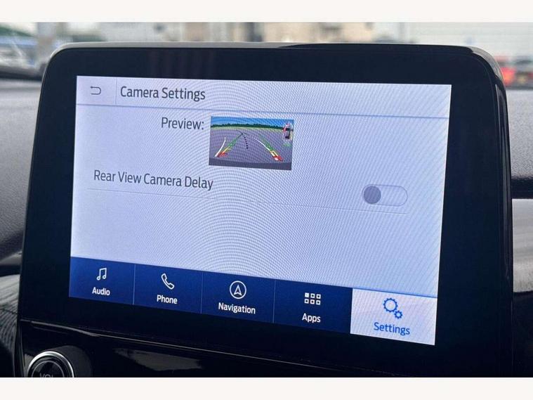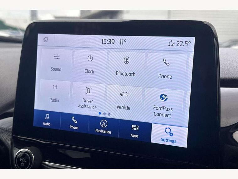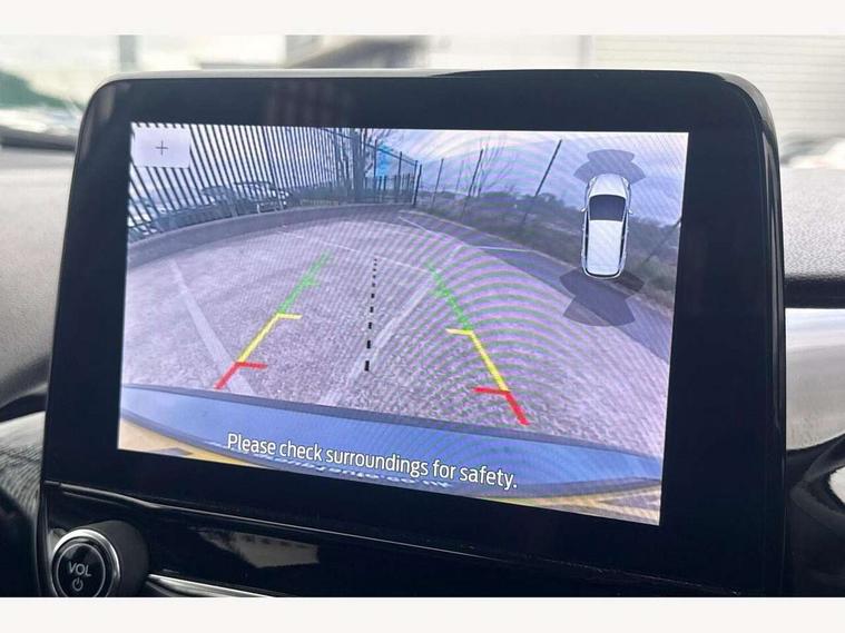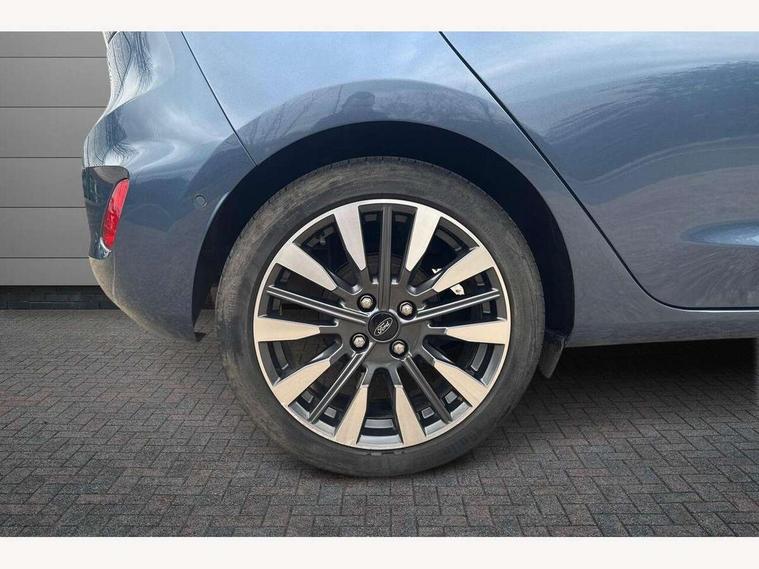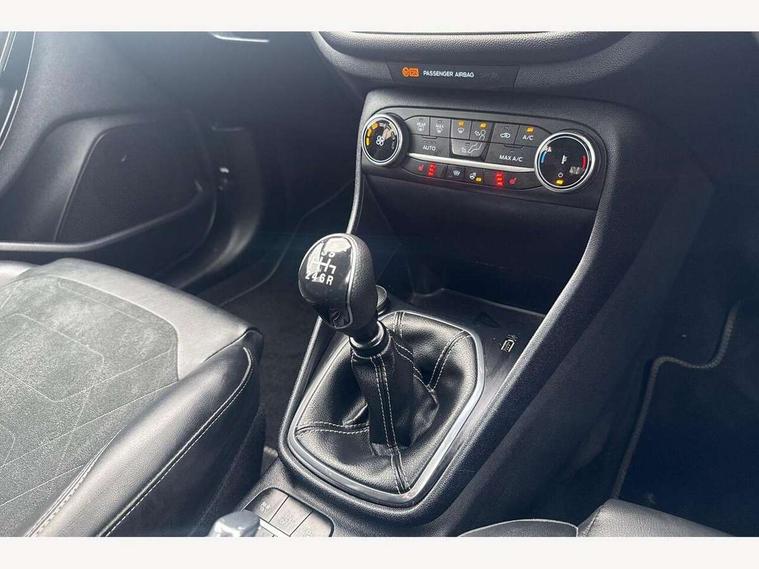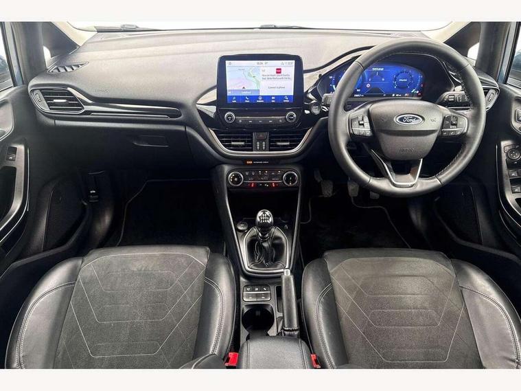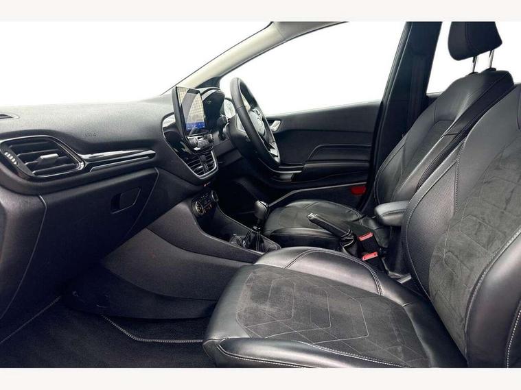 4.2" TFT instrument cluster screen, Bluetooth system, Electric power steering, Ford easy fuel, Rear parking distance sensors, Selectable drive modes (Normal, Sport, Track), Traffic sign recognition, Trip computer, 2 USB ports, Auxiliary input socket, B&O Premium audio system with 8" touchscreen, 10 speakers, 360 degree sound system, Ford SYNC 3 navigation system and Ford pass connect, DAB Digital radio, Steering wheel mounted controls, Auto high beam, Body colour bumpers, Body colour door handles, Body colour rear spoiler, Body coloured electrically operated and heated door mirrors with side indicators, Chrome beltline trim, Chrome front grille, Chrome lower window surround, Cornering front fog lights, Electric front windows/one touch facility, Electric rear windows, LED Night signature to rear lights, Power foldable door mirrors with puddle lights, Quickclear heated windscreen, Rain sensing wipers and auto dimming rear view mirror, Rear privacy glass, Rear wiper, 3 spoke leather trimmed steering wheel with audio control, 60/40 split folding rear seat, Adjustable head restraints, Boot carpet, Centre console with opening armrest, 2x cupholders, 12v and USB, Chrome inner door handles, Drivers and Passenger lumbar support, EATC - Electronic Auto Temperature control, Footwell illumination, Front floor mats in velour, Front map reading lights, Front seat and rear pockets, Height adjustable passenger seat, Illuminated glovebox, Leather gaiter, LED ambient lighting, Load area light, Luxury woven headliner, Manual 4-way driver seat adjust, Overhead console with sunglasses holder, Pollen filter, Rake/reach adjustable steering wheel, Sensico partial premium upholstery, Sensico wrapped steering wheel, NCAP Pack - Fiesta, 3 point seatbelts on all rear seats, ABS+EBA, Curtain airbags, Driver and passenger airbags, Drivers knee airbag, Electronic stability control with hill start assist, Front passenger airbag deactivation, Front side airbags, Seatbelt warning, Two tone horn, Tyre pressure monitoring system, Ford keyfree system with Keyless entry and keyless start, MyKey system, Remote central locking & engine immobiliser, Thatcham Cat.1 alarm, 17" 8 spoke alloy wheels,