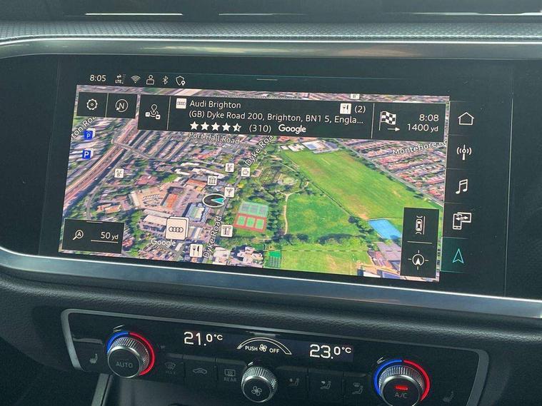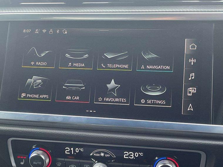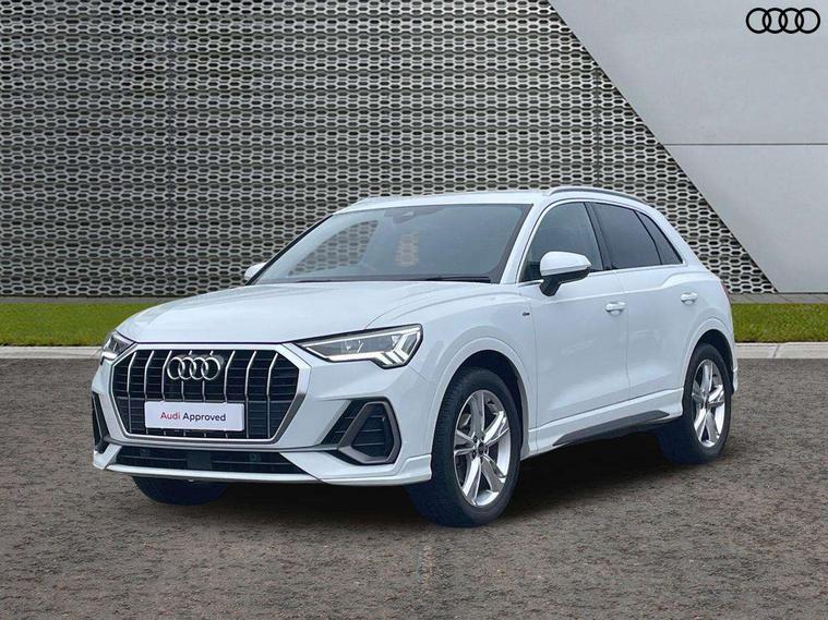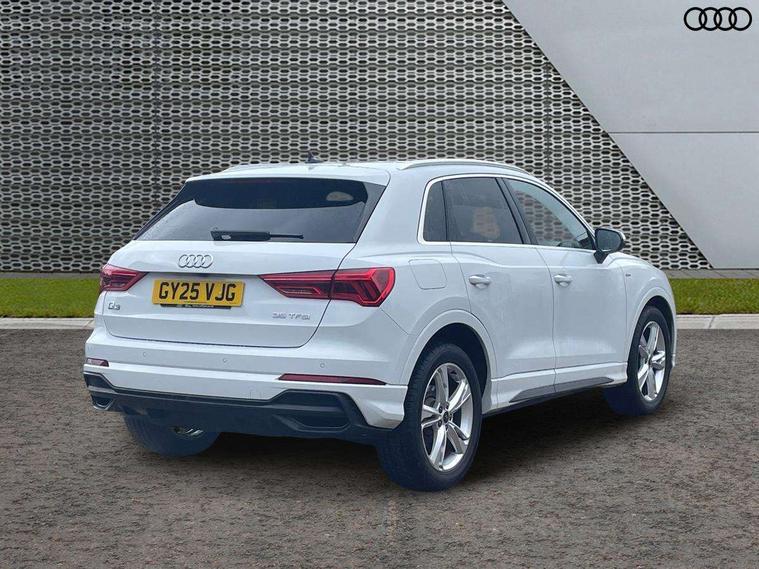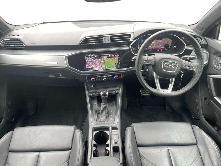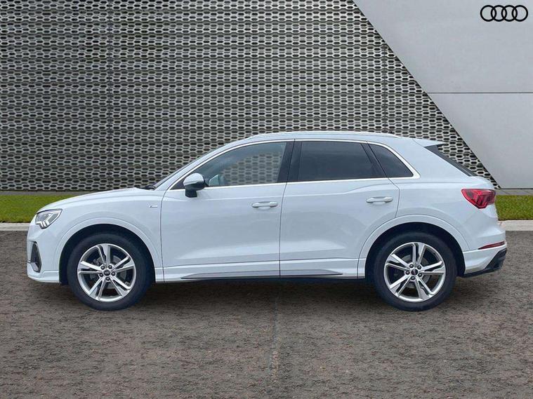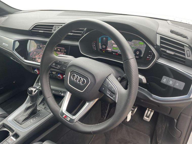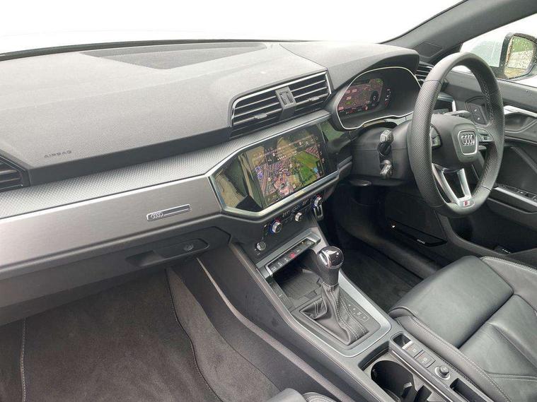 Amazon alexa Integration, Audi connect safety and service, Audi drive select, Audi lane departure warning, Audi Virtual Cockpit - 10.25" display, Bluetooth interface, Camera based traffic sign recognition, Distraction and Fatigue warning, Legal emergency call, MMI Navigation Plus with high resolution 10.1 inch touchscreen colour display, Power operated tailgate, Progressive steering, Service interval indicator, Smartphone interface includes wireless Apple carplay/Android Auto, Start stop system with recuperation, Voice control system with natural language interaction, Sports suspension, 2 USB-C ports with charge and data functions, 6 passive loudspeakers, DAB digital radio module, Acoustic windscreen, Aluminium roof rails, Aluminium window trim, Anthracite black radiator grille, Auto dimming door mirrors, Auto dimming frameless rear view mirror, Body colour front spoiler blade, Electrically folding, adjustable and heated door mirrors with integrated LED side indicators and kerb view function for passenger side, Front and rear electric windows, Front fog lights, Front side air inlets in matt platinum grey, Grille vertical bars in aluminium silver/Matt, High gloss black finish B and C pillars, LED Dynamic rear indicators, LED headlights with LED daytime running lights, LED rear lights, LED third brake light, Privacy glass dark tinted rear and rear-side windows (from B-pillar backwards), Rain and light sensors, Rear diffuser grille in grained matt black, Rear diffuser strip in matt anthracite black, Rear side wing doors, Rear wiper, S line badges on front wings, S line front and rear bumpers and side skirts in contrasting Manhattan grey paint finish, Side skirt insert in matt Platinium grey, Variable front intermittent wipers, 12V socket in rear centre console, 3 seat bench in 2nd row, 3 spoke leather multifunction steering wheel features S badging and grips in perforated leather with contrast stitching, 40:20:40 folding with manual adjustment for 60:40 forwards/backwards position and backrest angle, Adjustable rear seat bench/backrest with centre armrest and cupholder, Black cloth headlining, Dual zone electronic climate control, Electric lumbar support, Front and rear black floor mats with contrast stitching in rock grey, Front and rear headrests, Front centre armrest, Height and reach adjustable steering wheel, Illuminated door sill trims with S logo, ISOFIX child seat mounting for front passenger with airbag deactivation and outer rear seat including top tether attachment point for outer rear seats, Manual front seats with height adjustment, Perforated leather gearknob, Single front passenger seat, Stainless steel luggage compartment sill finisher, Stainless steel pedals, Twin leather upholstery with front sport seats + S embossing, Non smoking pack - Q3, 3x3 point rear seatbelts, 6 airbags - Driver, front passenger, curtain and side windows, Audi pre-sense front with pedestrain and cyclist recognition, Electrically operated child locks on rear doors, Electromechanical parking brake, Electronic stabilisation control including ABS, ASR and EDL, Front seatbelt reminder, Hill descent control, Hill hold assist, Pre sense basic, Seatbelt monitoring, Tyre pressure warning, Warning triangle and first aid kit, Anti theft wheel bolts, Immobiliser, Remote central locking, Thatcham approved category 1 anti theft alarm, Aluminium look interior elements, Dark matt brushed aluminium inlay, Detail dashboard around MMI touch colour display in glass look, black with surround in aluminium look, Leatherette door armrest,