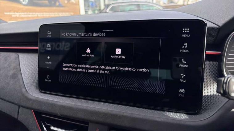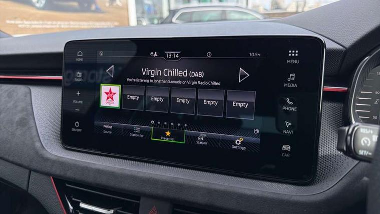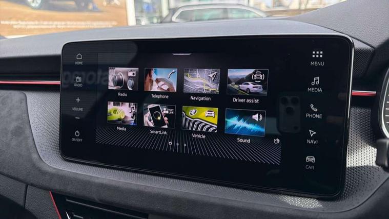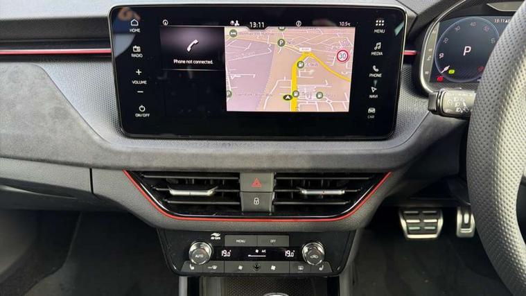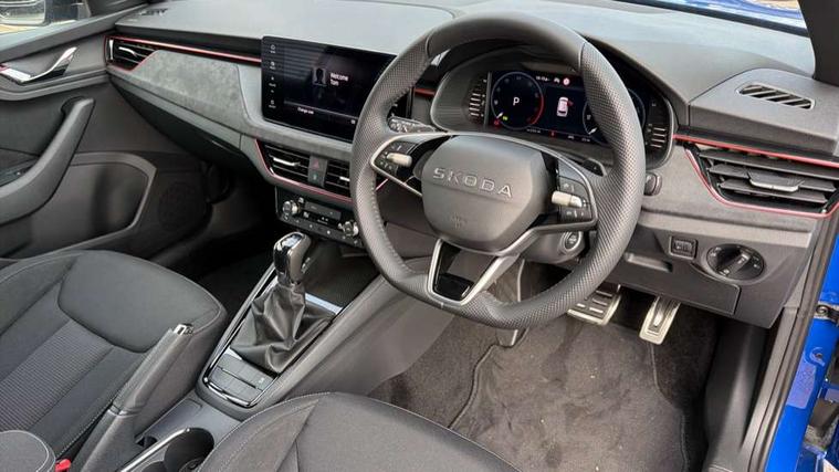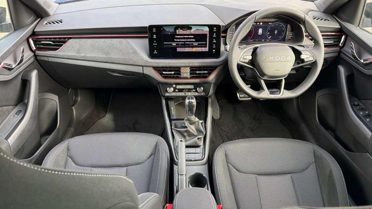 Advanced driver attention and drowsiness monitor, Bluetooth system, E-call, Front assist system, PAS, Rear parking sensors, Rear view camera, Service indicator, Speed limiter, Traffic sign recognition, Virtual cockpit with 10.25" display, Wireless smartlink, 4 USB C ports, 8 Speakers, 9.2" Skoda navigation display, DAB Digital radio, Auto dimming rear view mirror, Automatic headlight control with coming home and leaving home feature, Black roof rails, Body colour bumpers, Body colour door handles, Chrome grille surround, Colour concept - Black roof and wing mirrors, Front and rear electric windows, Full LED headlights, Heated rear window, LED brake lights, LED daytime running lights, LED front turning lights, LED high beam, LED low beam, LED third brake light, Privacy glass, Rear LED fog light, Rear side wing doors, Rear wiper, Ticket holder inside windscreen, 12V socket in luggage compartment, 3 seat bench in 2nd row, 3 spoke leather sports multi-function steering wheel with paddles for DSG, Aluminium pedals, Ambient lighting in white/red, Black roof lining, Black suedia decor inserts, Black suedia door inserts, Cargo elements, Chrome inner door handles, Driver and passenger sun visors with vanity mirror, Dual zone climate control, Dynamic cloth upholstery, Front and rear roof lights, Front centre armrest, Front head restraints, Glove compartment with illumination, Height adjustable driver seat, Height adjustable front passenger seat, Ice scraper, Inner circulation control with pollen filter, ISOFIX on front passenger seat, Isofix preparation for back seats, Leather gearknob and handbrake lever, Manual lumbar support for front seats, Net package and top tether hooks in boot space, Net under rear shelf, Overhead glasses storage compartment, Pocket on the back of both front seats include mobile phone pockets, Rake/reach adjustable steering wheel, Reading lights, Rear centre armrests, Red hotstamping, Single front passenger seat, Sports seats, Textile floor mats, Third rear headrest, Top tether for front passenger seat, Umbrella in driver's door, 3x3 point rear seatbelts, Airbags - driver and front passenger, Disc brakes, ESP, Extended and predictive pedestrian/cyclist protection, Front passenger airbag deactivation switch, Front side airbags with curtain airbags, Hill hold control, Manual leather parking brake, Manual rear child locks, One tone horn, Seatbelt reminder for driver an co-driver, Traction control, Tyre pressure monitor, Anti-theft alarm system with interior monitoring, backup horn, towing protection and remote central locking with SAFE system, Anti-theft wheel bolts, Electronic engine immobilizer,