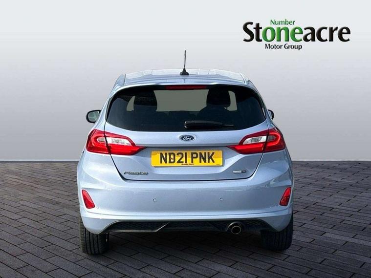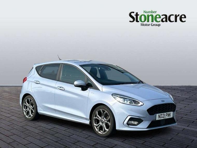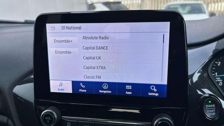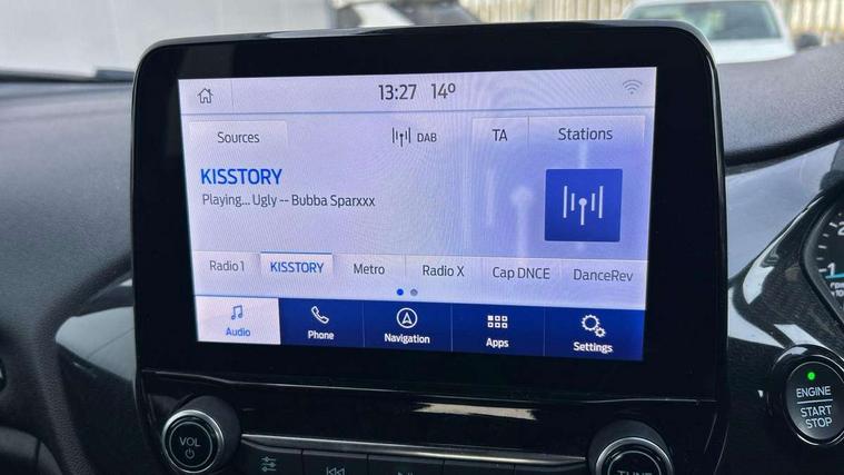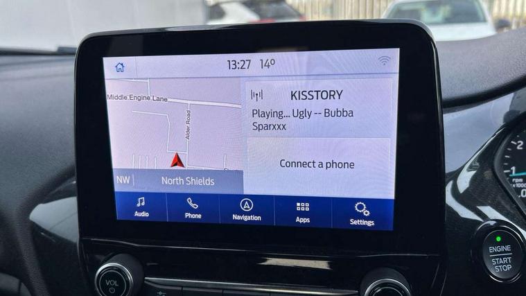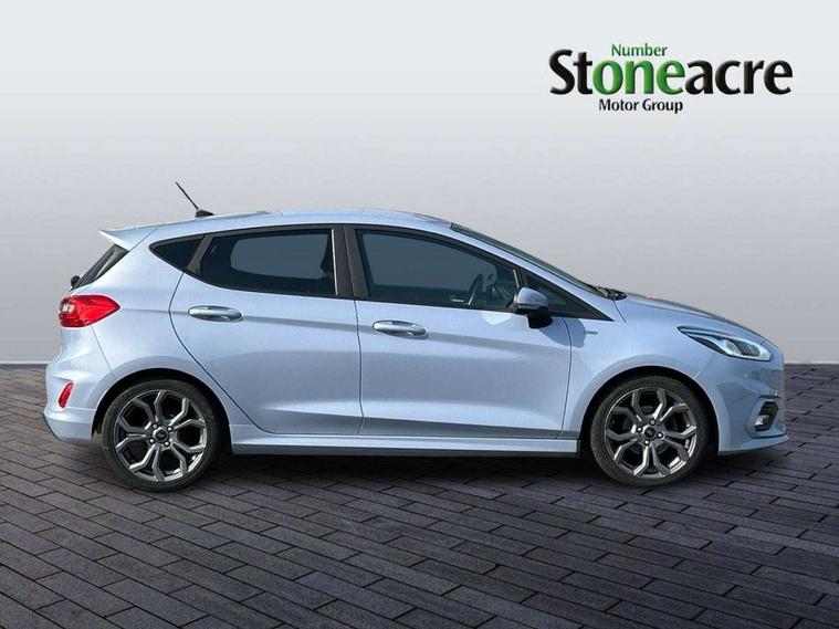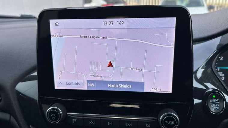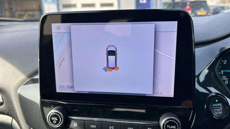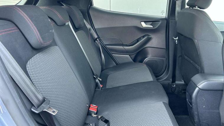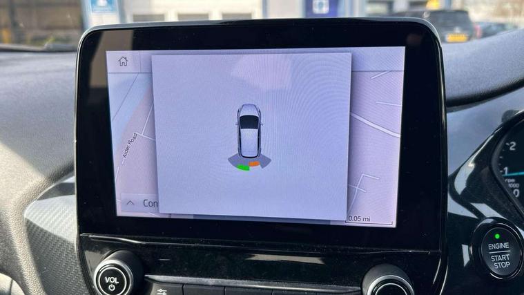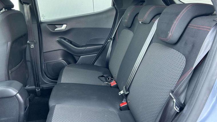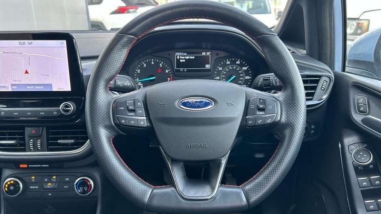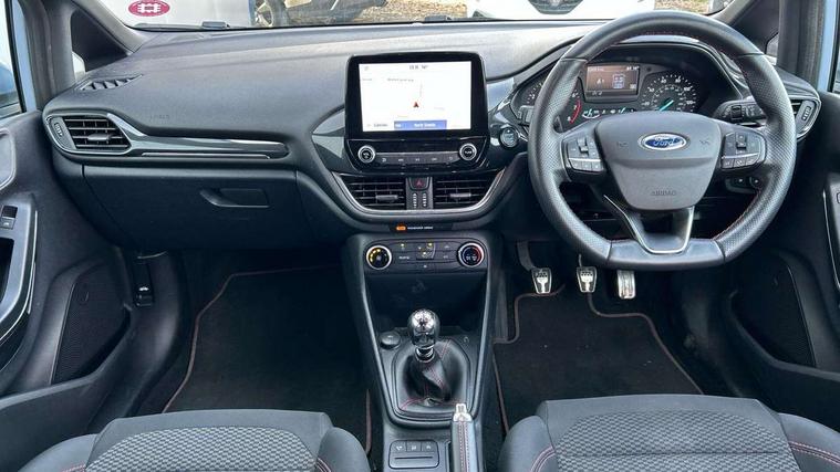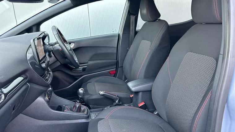 Bluetooth system, Electric power steering, Ford easy fuel, Ford SYNC 3 Navigation system incl 8" touchscreen, 7 speakers, FordPass connect, Apple carplay, android auto, voice control and emergency assistance, Rear parking distance sensors, Selectable drive modes (Normal, Sport, Track), Trip computer, Sports suspension, 2 USB ports, Auxiliary input socket, DAB Digital radio, Steering wheel mounted controls, Body colour bumpers, Body colour door handles, Body colour large rear spoiler, Body coloured electrically operated and heated door mirrors with side indicators, Cornering front fog lights, Electric front windows/one touch facility, Electric rear windows, LED Night signature to rear lights, Quickclear heated windscreen, Rain sensing wipers and auto dimming rear view mirror, Rear privacy glass, Rear wiper, Unique ST-Line upper grille & full bodystyling kit with ST-Line wing badges, 3 spoke flat bottomed leather steering wheel, 60/40 split folding rear seat, Adjustable head restraints, Black headlining, Boot carpet, Centre console with opening armrest, 2x cupholders, 12v and USB, Chrome inner door handles, Cloth upholstery, Footwell illumination, Front floor mats in velour, Front map reading lights, Front seat and rear pockets, Illuminated glovebox, Leather gaiter, Load area light, Manual 2 way passenger seat adjust, Manual 4-way driver seat adjust, Manual air conditioning, Overhead console with sunglasses holder, Pollen filter, Rake/reach adjustable steering wheel, Sensico wrapped steering wheel, Sports front seats, NCAP Pack - Fiesta, 3 point seatbelts on all rear seats, ABS+EBA, Curtain airbags, Driver and passenger airbags, Drivers knee airbag, Electronic stability control with hill start assist, Front passenger airbag deactivation, Front side airbags, Seatbelt warning, Two tone horn, Tyre pressure monitoring system, Keyless start with 'Ford Power' starter button, MyKey system, Remote central locking & engine immobiliser, Thatcham Cat.1 alarm, 17" 5 spoke alloy wheels with rock metallic finish,