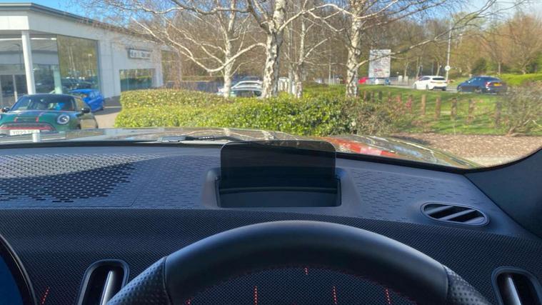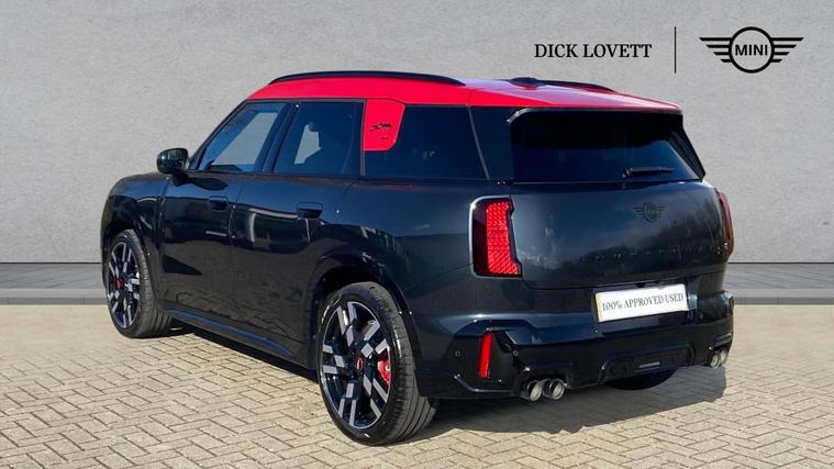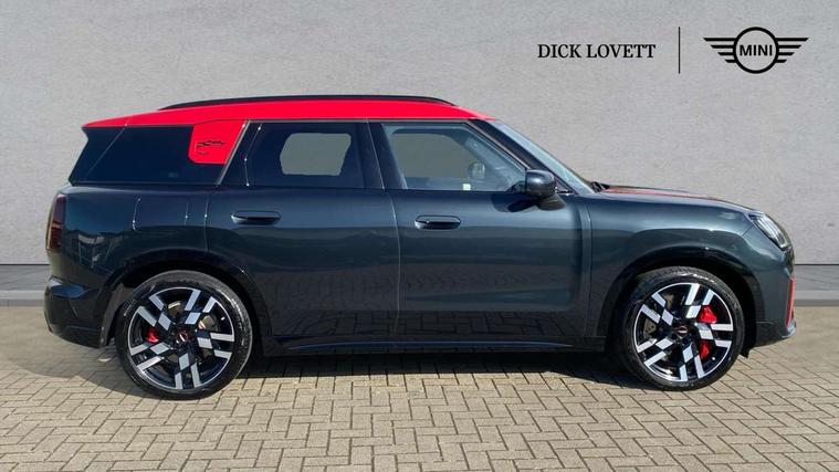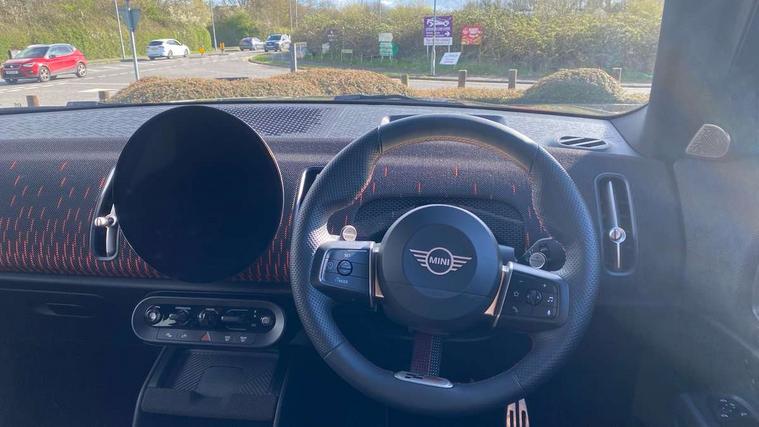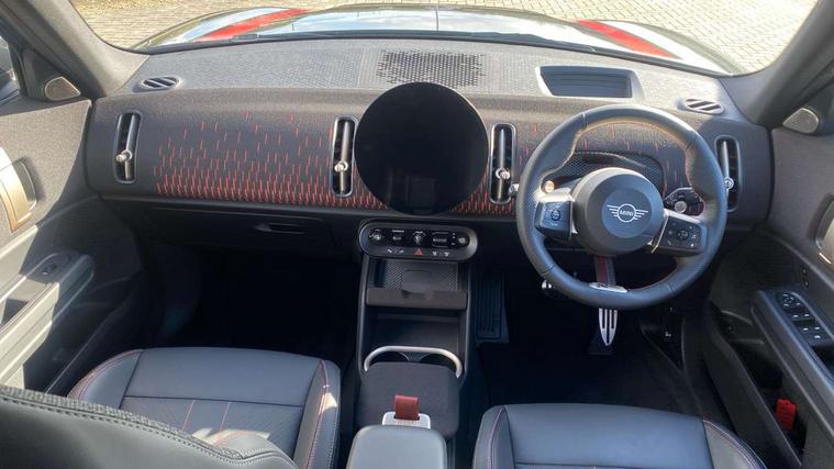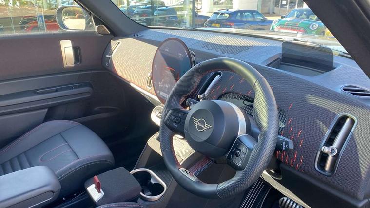 Bluetooth connection, Circular OLED Screen, Compatible mobile phone bluetooth with audio streaming, Cruise Control (DCC), Digital dashboard display, Driving Assistant Plus Preparation, E-call, Electro-mechanical speed dependant steering assistance, MINI Experience Modes, MINI Head up display, Mini navigation system, MINI TeleServices, Parking assistant in camera and ultrasound based assistance system, rear view camera, parking aid and distance control, Double clutch sports transmission, Quad exhaust system, DAB Digital radio, Harman Kardon surround sound system, Personal eSim, Auto tailgate, Electric adjustable heated door mirrors, Front and rear apron, Front and rear electric windows, Heated rear window, High beam assistant, High gloss hexagonal patterned grille surround, Interior rear-view mirror with automatic anti-dazzle function, LED daytime running lights, LED headlights with extended contents including Adaptable light signatures, LED rear lights, LED third brake light, Rain sensor with auto headlights, Rear roof spoiler with airblades, Rear side wing doors, Rear window wiper, Roof rails, 3 seat bench in 2nd row, 60/40 split rear bench seat, Anthracite headliner, Auto air conditioning, Driver and front passenger seat heating, Floor mats, Front armrest, Front headrests, Heated steering wheel, Height and length steering column adjustment, JCW Front sports seats, Lidded storage box in Black/Red knit, Luggage compartment separating net, Perforated Vescin steering wheel, Rear headrests, Seat adjustment for rear seats, Single front passenger seat, Sunvisors with vanity mirrors, Vescin/Cloth upholstery, Wireless charging tray, Interior and exterior mirror package - Mini Countryman, 3x3 point rear seat belts, 6 Airbags - front, side, head and seat belt tensioners, ABS, DSC - Dynamic Stability Control, Electronic handbrake, Electronic Stability Programme (ESP), Front ISOFIX (iSize), Hill descent control, Hill hold assist, Hill start assist, JCW logo in brake calipers, JCW Sport brakes with Chilli Red calipers, Manual rear child locks, Traction control, Tyre pressure monitoring system, Warning triangle, Alarm system with tilt sensor, monitoring doors, bonnet interior and tailgate, Auto drive away locking, Comfort access system, Deadlocking function, Electronic vehicle immobiliser, Locking wheel bolts, Remote control locking, Start/stop toggle with keyless go, JCW Black/Red dashboard knit, 19" JCW Runway Spoke Black alloy wheels, MINI Mobility Kit,