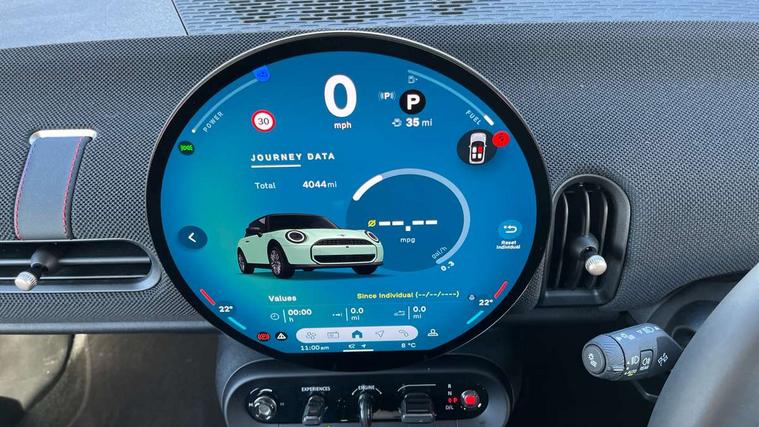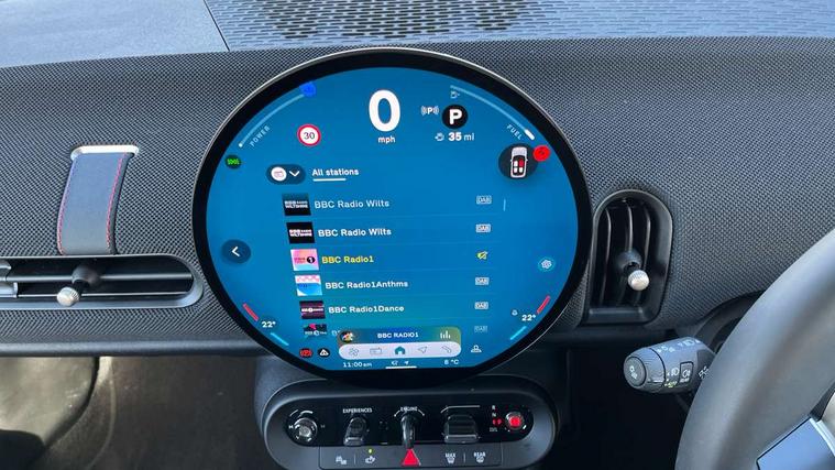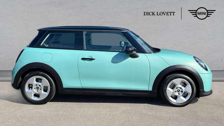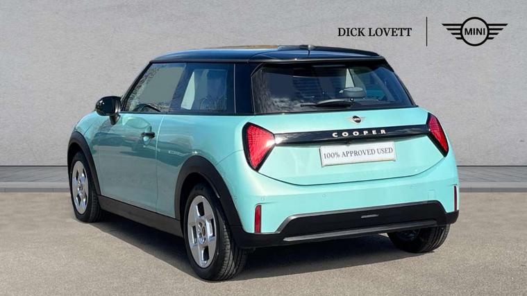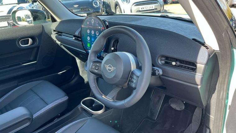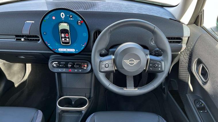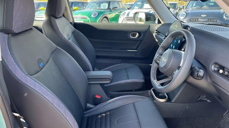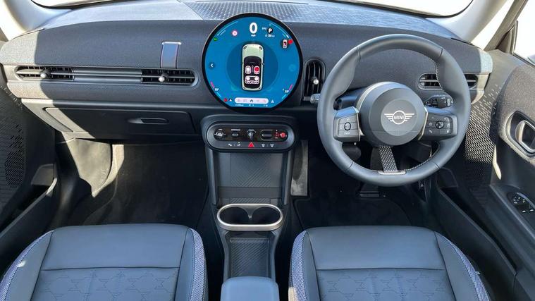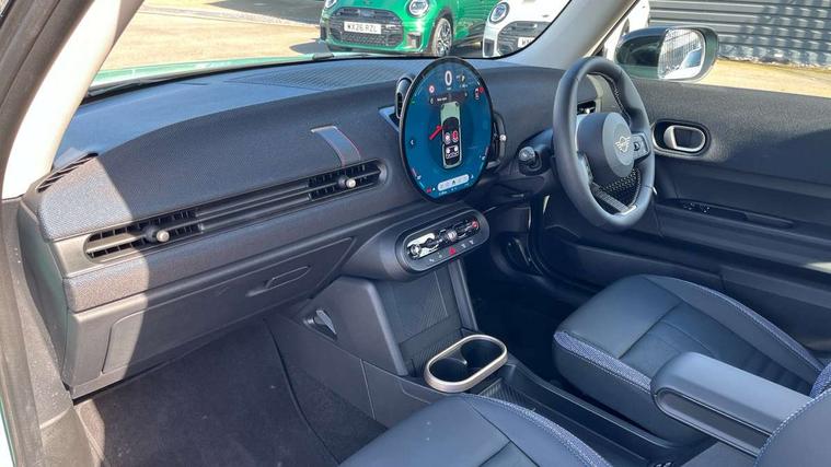 Central toggle bar, Circular OLED Screen, Compatible mobile phone bluetooth with audio streaming, Cruise control, Digital instrument cluster, Electro-mechanical speed dependant steering assistance, Emergency call service, MINI Experience Modes, Mini navigation system, On board computer, Service interval indicator, Tailgate, 7 speed steptronic transmission with double clutch, DAB Digital radio, Personal eSim, Auto headlights, Black grille surround, Electric adjustable heated door mirrors, Electric front windows, Heated rear window, Heated windscreen washer jets, LED 3rd brake light, LED daytime running lights, LED Headlights, LED indicator lights, LED rear lights, Rain sensor window wipers, Rear fog lights, Rear window wiper, 2 seat bench in second row, 2 zone automatic air conditioning, 60/40 rear seat bench, Ambient lighting, Cupholders, Front and rear head restraints, Front compact armrest, Front floor mats, Heated steering wheel, Height adjustable passenger seat, Light headliner, Luggage compartment lighting, Single front passenger seat, Sport Vescin Steering Wheel black with vibrant silver accents, Sunvisors with vanity mirrors, Vescin/Cloth upholstery includes dash knit in black with blue accents, Driving assistant pack - Cooper Hatchback, Park assistant pack - Cooper Hatchback, 3 point seatbelts on all four seats, 6 Airbags - front, side, head and seat belt tensioners, Anti-lock braking system (ABS), DSC - Dynamic Stability Control, Electronic parking brake, Front and rear disc brakes, Front ISOFIX (iSize), Front passenger airbag deactivation, Traction control, Tyre pressure monitoring system, Alarm, Immobiliser, Remote central locking, Tyre repair kit,