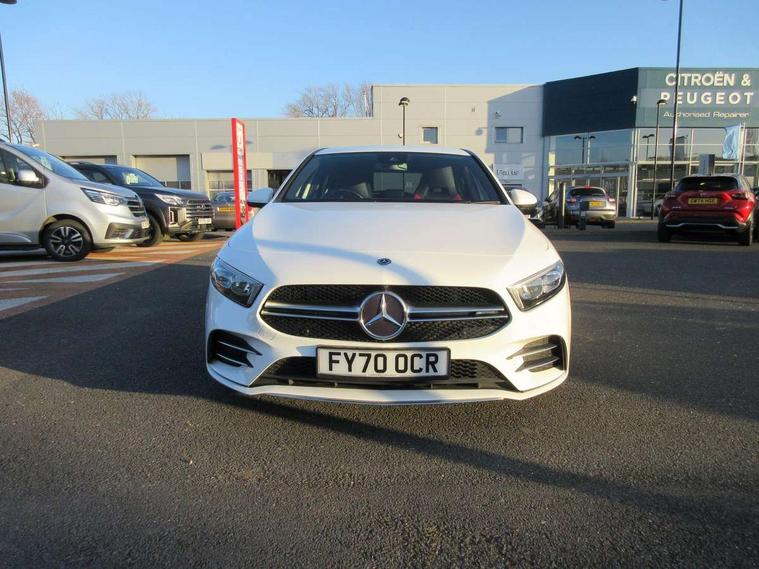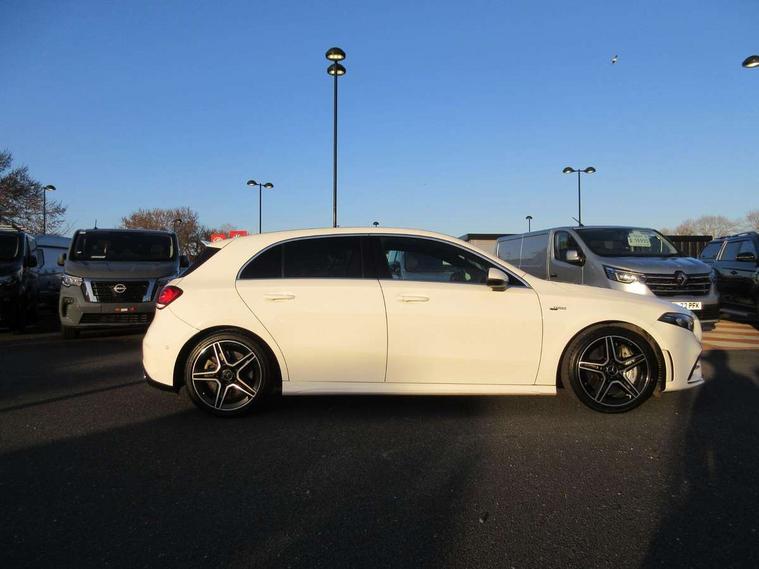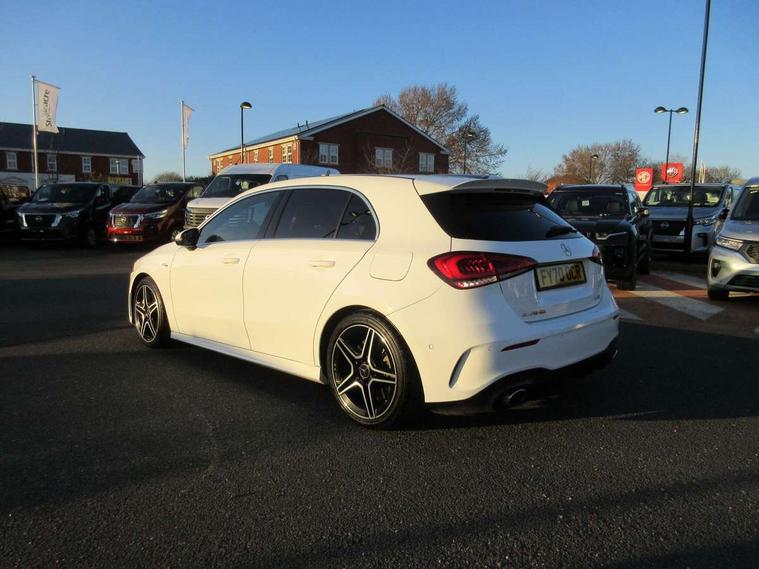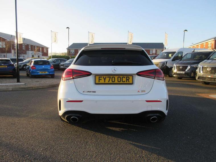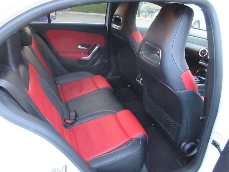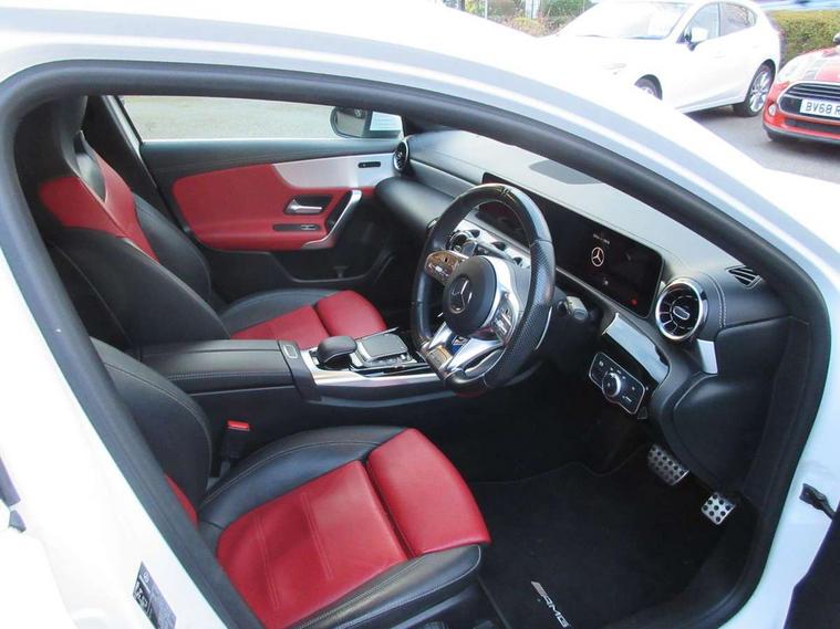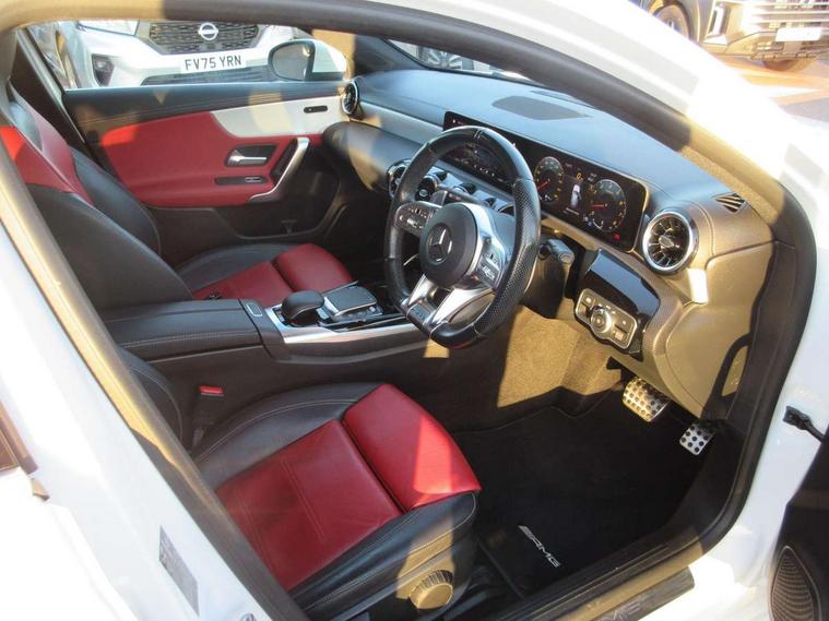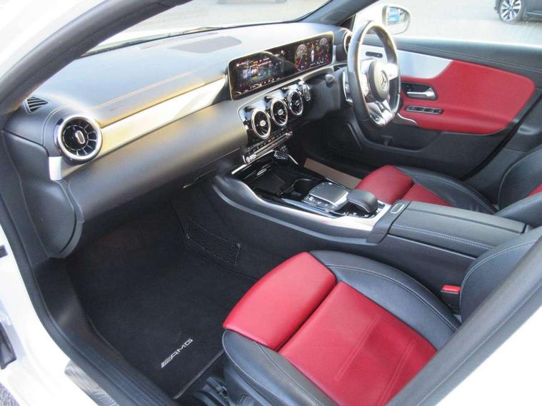 10.25" media display, 180 degree rear view camera with parking guidelines, 7" colour screen in instrument panel, Active lane keep assist, Active park assist with parktronic system including front and rear parking sensors, Attention assist, Brake pad wear indicator warning light, Car wash mode, Cruise control + speed limiter, Direct steering, Dual bluetooth interfaces, DYNAMIC SELECT with driving programs (Slippery, Comfort, Sport, Sport+ and Individual), ECO start/stop function, Fluid level warning indicator for fuel, oil, coolant and washer fluid, Hard-disk navigation, Hey Mercedes Voice activation, Lamp failure indicator, Mercedes me connect including emergency call system, accident recovery, breakdown and maintenance management, Outside temperature gauge, Owners manual in English, Pre-installation for private car sharing, Pre-installation for Vehicle Monitoring, Pre-installation for Vehicle Setup, Preinstallation for Mercedes Benz link, Service indicator (ASSYST), Smartphone integration with Apple CarPlay and Android auto, Speed sensitive power steering, Trip computer, Wireless charging, AMG performance suspension, Rear axle multi-link, 2 USB ports (type C) in rear stowage compartment and one in front of center console, 6 speakers, DAB Digital radio, MBUX multimedia system with DAB digital radio and touchpad including satellite navigation, Mercedes-Benz sound system - 100W, 4 Electric Front and Rear windows, Adaptive brake lights, AMG bodystyling - Front apron with splitter in chrome, rear apron with chrome trim and chrome visible trim elements in tailpipe, AMG Front apron with flics as air deflector elements on the outer air intakes, AMG radiator grille with twin blade lamella and AMG Lettering, AMG Rear apron with specific diffuser look with four vertical fins and two round chrome plated tailpipe trim elements with a diameter of 90 mm, AMG spoiler lip on roof, AMG Sports exhaust system with two round tailpipes measuring 90 mm in diameter attached in rear apron, AMG lettering plus ribbing on the inside of the, Black weather strip, Body colour bumpers, Body colour door handles, Body colour side skirt, Body coloured door mirrors, Chrome beltline trim, Electric adjustable and heated door mirrors with integrated LED side indicators, Front wings wheel arches with TURBO 4MATIC lettering, Headlamp assist automatic headlamp activation, Heated glass rear windscreen + timer control, LED high performance headlamps with integrated LED daytime running lights, LED tail lamp, LED third brake light, Privacy glass, Radio aerial, Rain sensing windscreen wipers with two sensitivity settings, Rear fog lights, Rear wiper, Trim elements on louvres in outer air inlets in silver chrome, Wider wheel arches for AMG wheels, Window line trim strip in chrome, 40:20:40 split folding rear seats, AMG Performance steering wheel in nappa leather, Auto Mercedes-Benz child seat recognition sensor, Black air vents with surround in silver chrome, Black roof lining, Brushed stainless steel sports pedals with rubber studs, Controller on centre console with chrome surround, Floor mats with stitched edging and AMG lettering, Front centre armrest with storage compartment, Front door sills with Mercedes Benz lettering, Front seat backs luggage nets, Front seat cushion length adjustment, Heated front seats, Height/reach adjustable steering column, Interior mirror with reading lamps in black and frameless, Manual height adjustable front seats, Rear head restraints, Seat occupancy sensor for front passenger seat, Silver coloured aluminium gear shift paddles on steering wheel, Sports seats with integrated headrests, Stowage compartment in centre console with retractable cover, Sunvisors with illuminated vanity mirrors, Touchpad on center console, Twin front cupholders, Two zone thermotronic luxury automatic climate control, Light and sight pack - A Class, Mirror package - A Class, Seat comfort pack - A Class, 3 rear 3 point seatbelts, ABS with Brake Assist, Active bonnet, Active brake assist includes forward collision warning system with autonomous braking, Adaptive brake assist with hold function and hill start assist, Childproof locks manually operated for rear doors and electrically operated for rear power windows, Crash responsive emergency lighting, Driver and passenger head and side airbags, Drivers knee airbag, Dual stage driver/passenger airbags, Electronic parking brake, ESP curve dynamic assist, ESP with ASR, Front and rear seatbelt reminder, Front brake calipers with AMG lettering, ISOFIX and top tether child seat fixing points in two outer rear seats, Perforated front brake discs, Tyre pressure monitoring system, Warning triangle and first aid kit, Window airbags, Alarm system/interior protection/immobiliser, Keyless Go, Remote central locking and crash sensor with emergency opening function, Urban guard vehicle protection system with immobiliser and interior protection, Black seatbelts, Light aluminium with longitudinal grain interior trim, 18" AMG 5 twin spoke design bicolour alloy wheels, Summer tyres, Tirefit sealant kit,