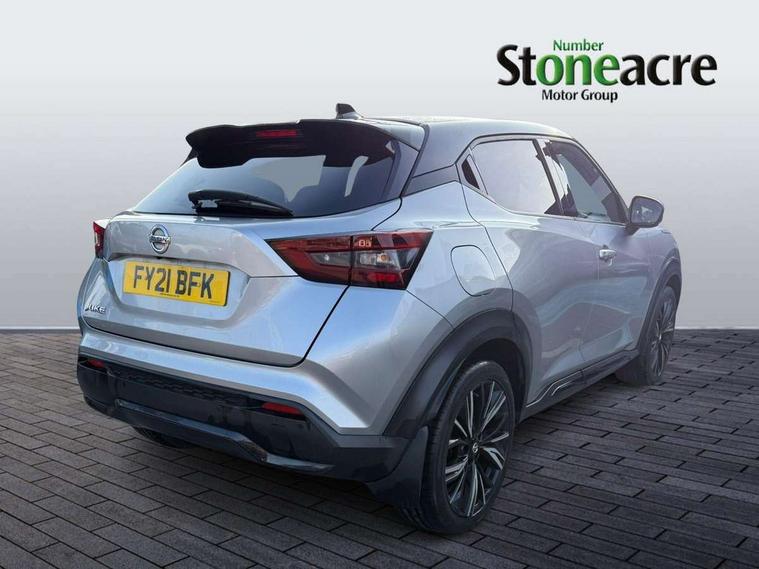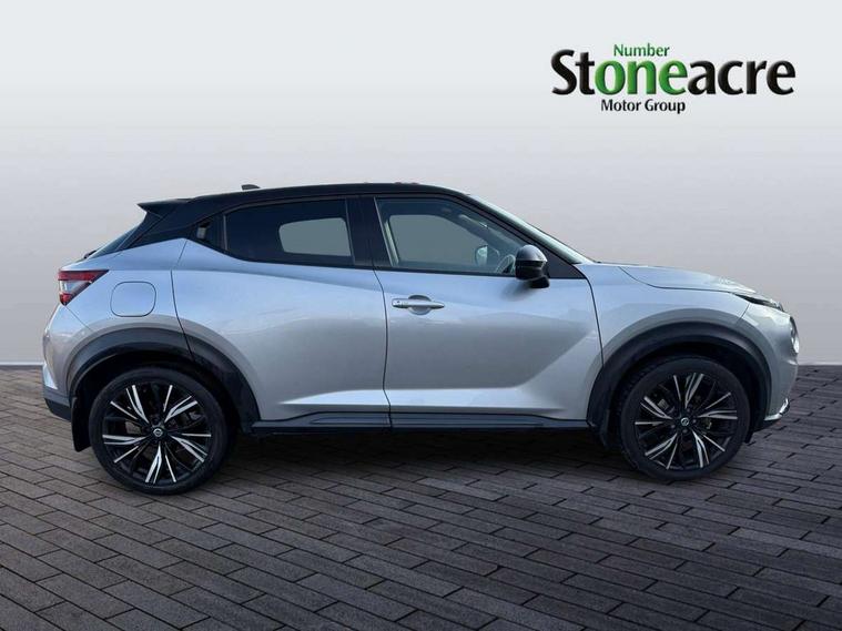 7" full colour TFT screen combimeter, 8" infotainment colour display with touch screen, Apple CarPlay and Google Android auto, Drive modes select (Eco, normal and sport), Emergency and breakdown call, Front parking sensor, Idle start/stop system, Intelligent lane intervention, Lane departure warning system, Nissan connect nav with TomTom traffic, Nissan connect services and Wifi connection, Outside temperature sensor, Power Steering, Rear parking sensor, Traffic sign recognition, Trip computer, Gasoline particulate filter, Bluetooth system, USB, Aux-in and 12V socket, Bose personal plus audio system with 8 speakers(4 speakers and 2 headrest speaker for driver and passenger seats), Bose personal sound stage control, DAB Digital radio, Front lower bumper painted in silver finisher, Rear console USB port, Auto dimming interior rear view mirror, Automatic hazard signal with emergency stop signal, Body colour bumpers, Body colour door handles, Electrically adjustable door mirrors with integrated indicators, Follow me home headlights, Front and rear electric window with one touch driver and passenger window, Heated and auto folding door mirrors, High beam assist, LED daytime running lights, LED front fog lights, LED headlamps, LED rear fog lamp, LED rear lamps, Rain sensor windscreen wipers, Rear privacy glass, Rear spoiler, Rear wiper, Thermaclear heated windscreen, Three blink turn signal, 3 height adjustable rear headrests, 60/40 split folding rear seat, Automatic climate control, Card holder on driver sunvisor, Door ambient lighting, Driver and passenger sliding and reclining seats, Driver seat back pocket, Driver side rear coat hanger, Driver/passenger sunvisors and illuminated vanity mirrors, Front and rear cabin lights, Front armrest, Front door pockets with bottle holders, Front head restraints, Front passenger isofix child seat anchorage point, Front/rear passenger grab handles, Gear console ambient circle lighting, Grey synthetic leather kneepad, Heated front seats, Height adjustable driver's seat, Height adjustable passenger seat, Internal chrome door handles, Leather gearshift knob, Leather steering wheel, Luggage board, Luggage space lighting, Monoform sporty seats, Multifunction steering wheel, Passenger seat back pocket, Rear door bottle holders, Steering wheel mounted gearshift paddles, Telescopic steering wheel adjustment, Two cupholders in front centre console, Two rear isofix child seat anchorage points with top tether, Voice recognition switch on steering wheel, Welcome light and console tray ambient lighting, ProPilot pack - Juke, ABS with EBD and brake assist, Active ride control, Active Trace Control, Driver and passenger airbags, Driver and passenger side airbags, Electric handbrake with auto hold function, Electronic Stability Programme (ESP), Front and rear curtain airbags, Height adjustable seatbelts, Hill start assist, Intelligent emergency braking with pedestrian and cyclist recognition, Seatbelt reminder for driver/front passenger and rear seats, Single tone horn, Three 3 point rear seatbelts, Traction control, Tyre pressure monitoring system, VDC Dynamic Vehicle Control, Ventilated rear brake discs, Alarm, Immobiliser, Intelligent Key with push button starter, Remote central locking, 19" Akari alloy wheels,
